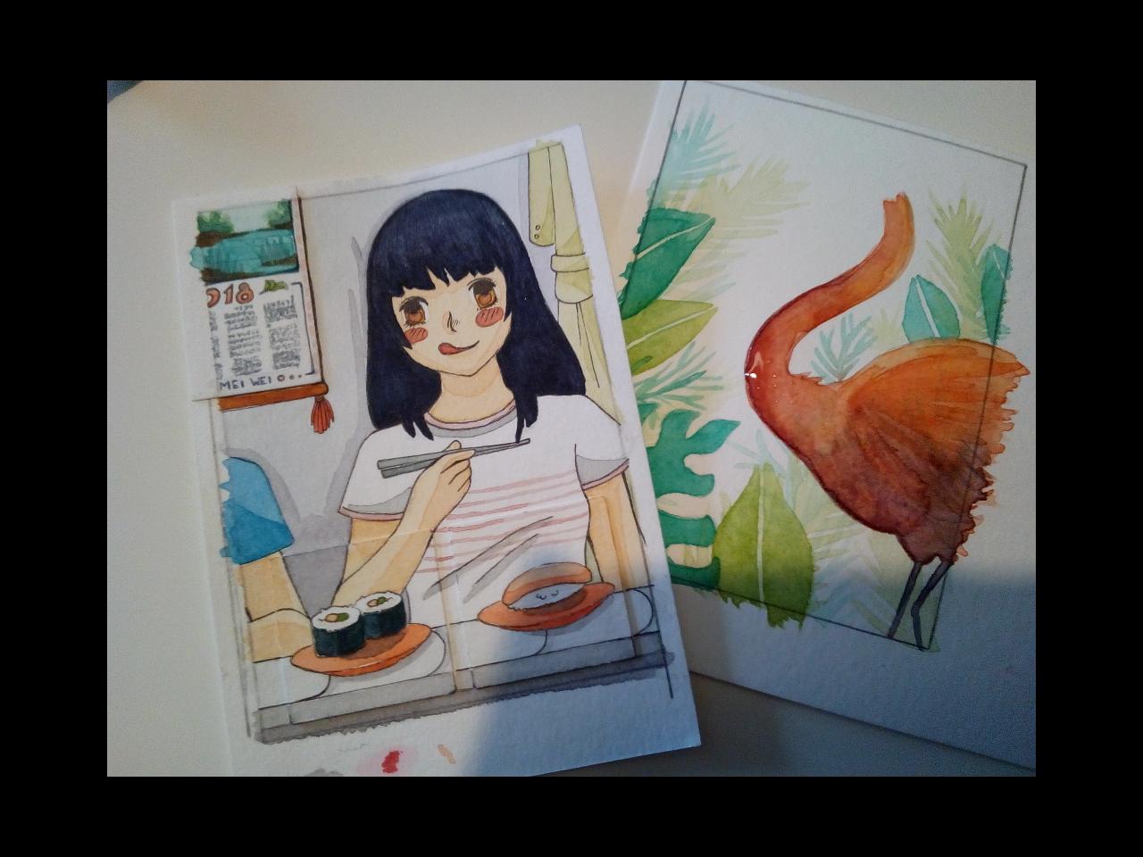 Mein Sushi Motiv wäre fertig und bei der Flamingo Karte wollte ich fragen, ob ich mich jetzt in die richtige Richtung bewege: