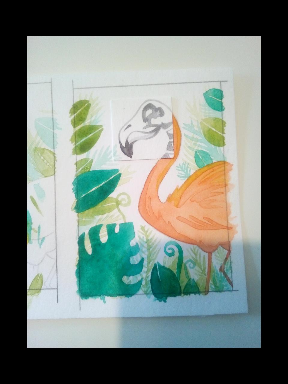 Ich würde unheimlich gerne noch mit weißer Tusche arbeiten, aber leider habe ich immer noch keine Feder und mein feinster Pinsel ist mir für da Bild auch immer noch zu dick. Mal schauen, ob ich mich traue, oder ob Buntstift zum Einsatz kommt…oder ob ich das so lasse. Der Flamingo entspricht jetzt endlich meiner Vorstellung. Ich mag das Simple…und die gelbe Farbe am Rücken ist mir schon wieder zu viel…aber zu spät :'D Nach insgesamt 6 Karten und 3 neuen Inchies bin ich jetzt doch recht zufrieden und hoffe, die Karte wird so angenommen x’D