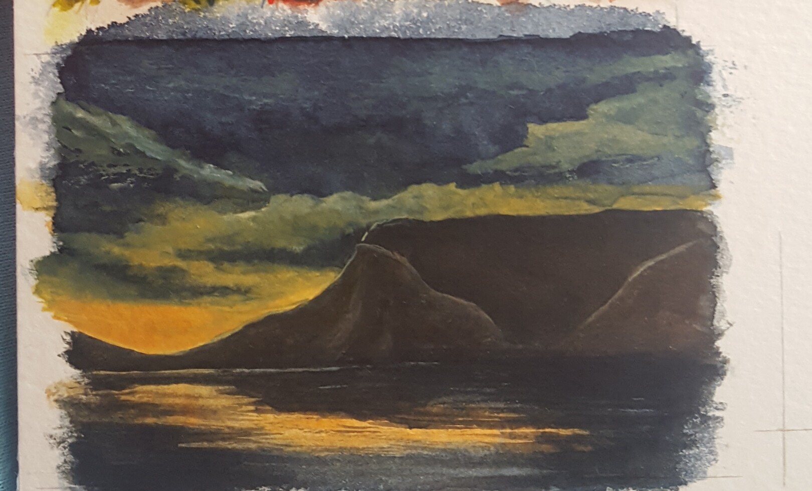 Ich bin relativ fertig, aber überlege bei der See-Karte den Kraken evtl etwas kleiner und weniger im Vordergrund zu platzieren, da mir der See so wie er ist echt gut gefällt und ein Tentakel viel von der Sonnenreflexion nehmen würde, was ich schade fände und das Bild auch einiges an Kontarst einbüßen würde… Ich muss mir da noch was überlegen. Beim anderen fehlt noch der Einschluss mit Polychromos :)
