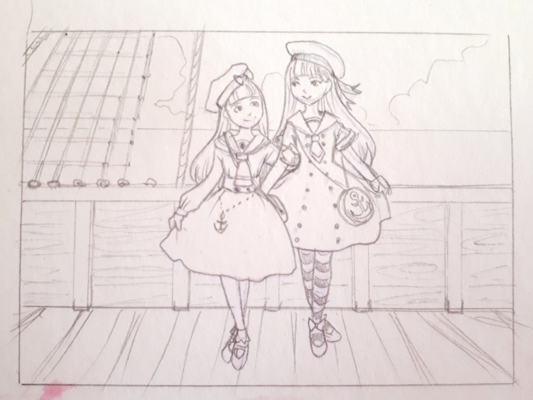 Ich habe bisher leider nur einmal Outlines vorzuweisen und eine unfertige Skizze. :( Die Recherchearbeiten sind sehr zeitaufwändig. Ich hab mir selbst das Laster auferlegt, NUR Brand zu zeichnen (und am Ende die Links mit den Bildern hochzuladen). Das dauert aber natürlich, bis man ein ganzes Outfit auf Lolibrary zusammengesucht hat… besonders, wenn man wie ich gleich 3 Lolis zusammen auf die erste Karte packt. %D