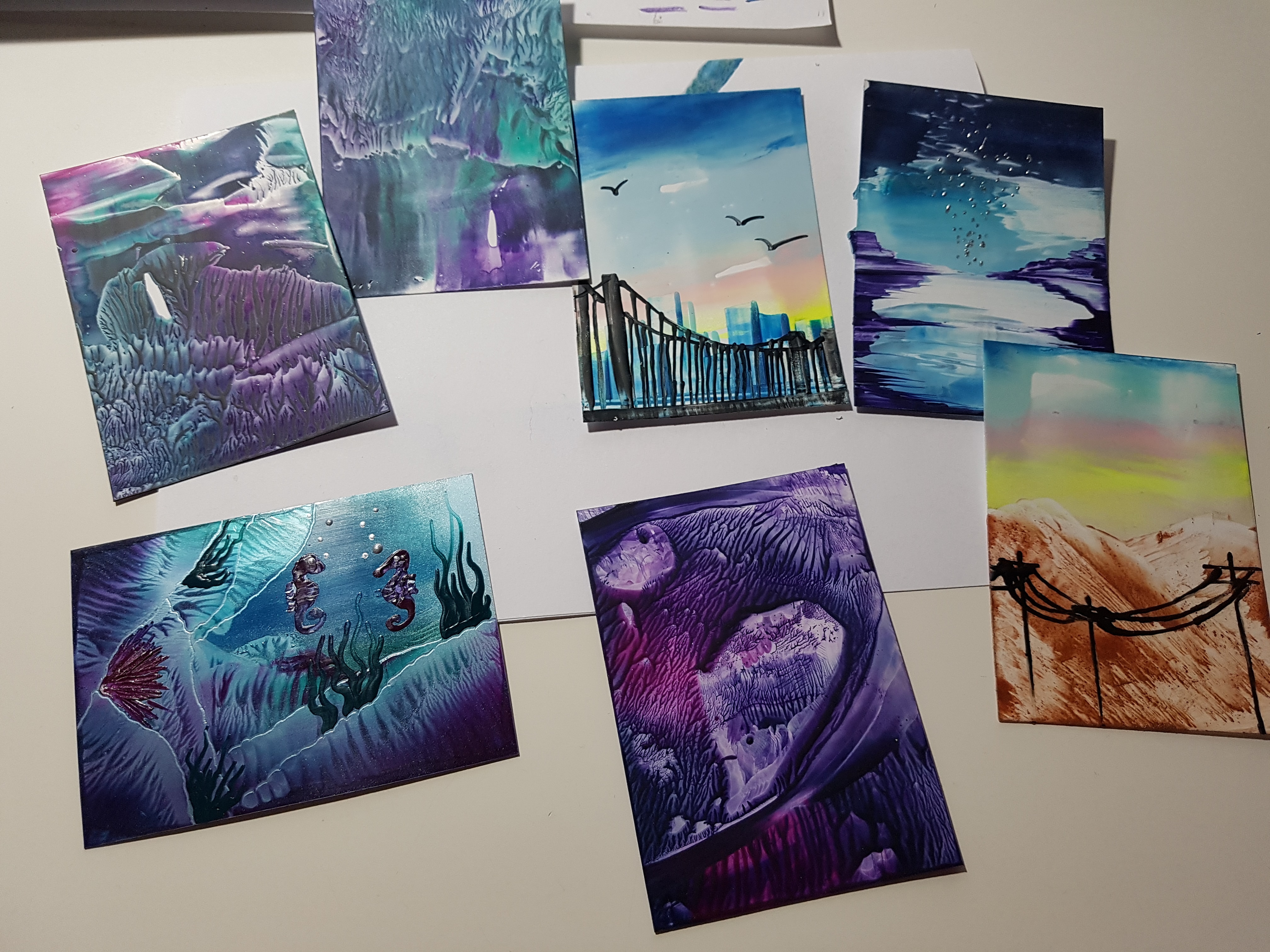 ich finde das Arbeiten mit Schellack auf so kleinen Format garnicht so einfach ,habe auch schon damit experimentiert und es macht riesig Spaß und es kommen tolle und überraschende Ergebnisse dabei raus . Ich bin schon gespannt was hier für kleine Kunstwerke entstehen .