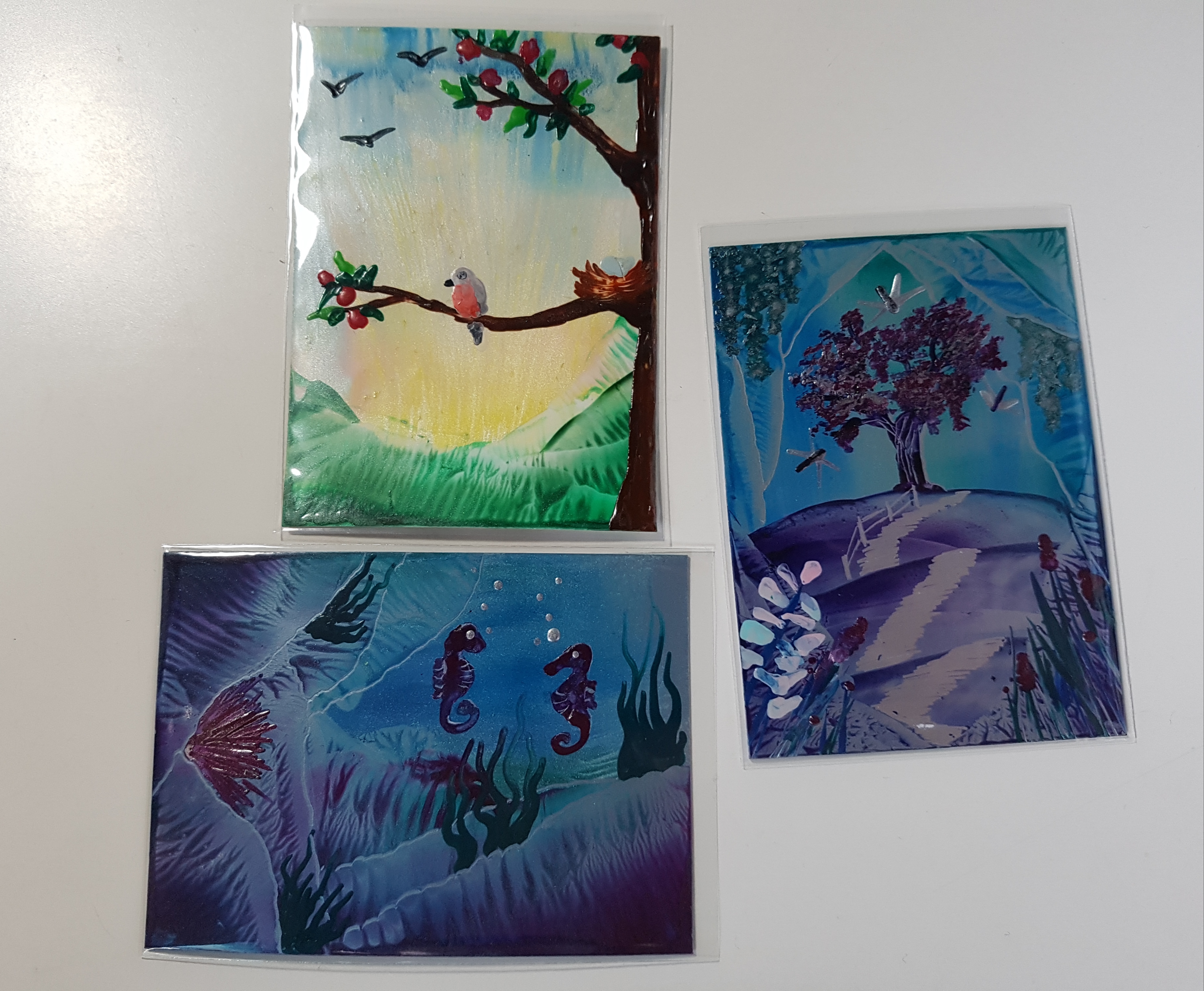 die Karte mit den Seepferdchen gefällt mir gut und wäre akzeptiert . Es sind schöne Hintergründe entstanden ich bin gespannt was Du daraus zauberst , der oben rechts gefällt mir persönlich besonders gut .