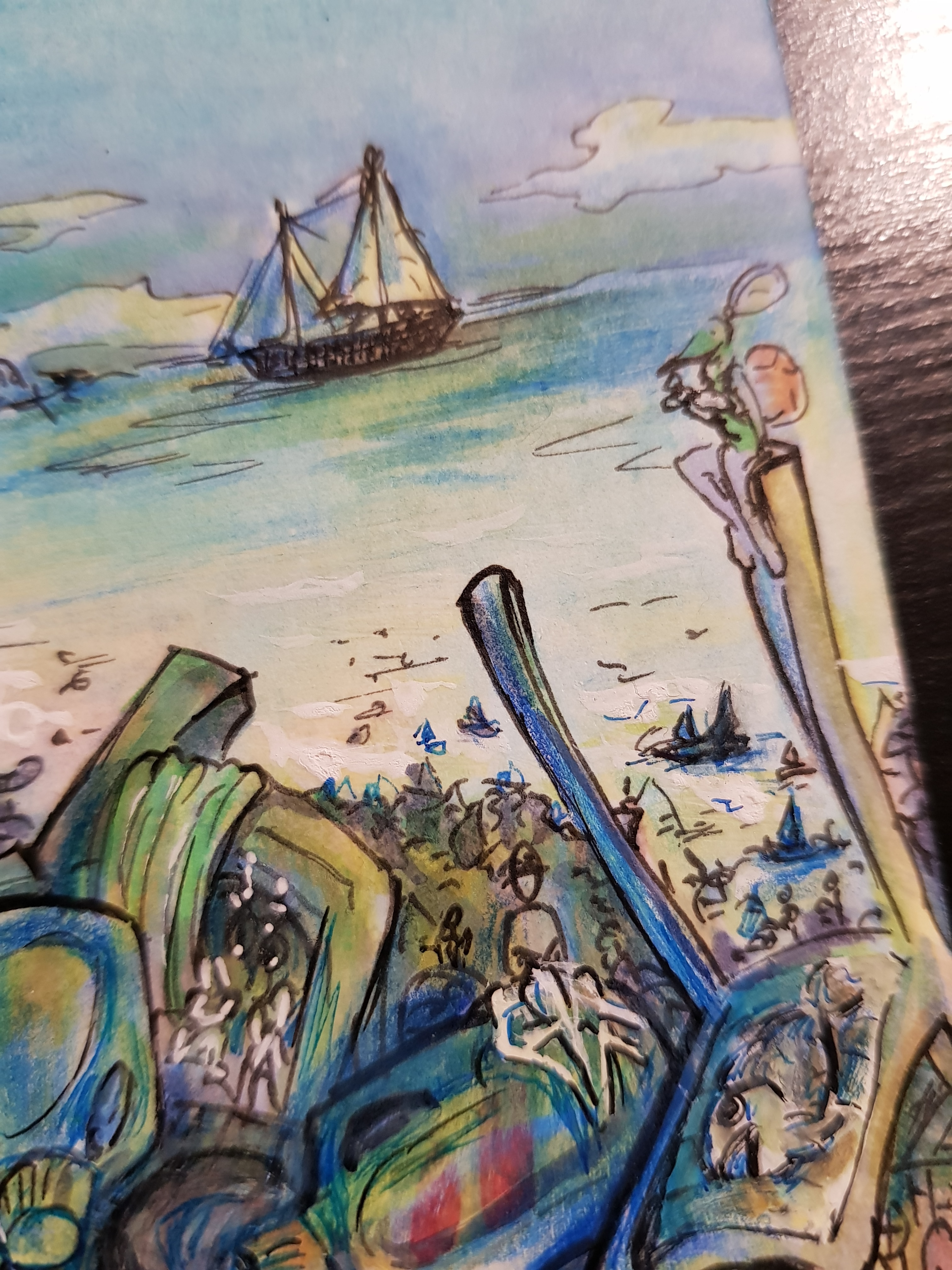 Meine drei Karten sind gerade fertig geworden, scannen kann ich aber erst nächste Woche. Dafür gibt’s jetzt schon mal ein mieses Handy Foto.