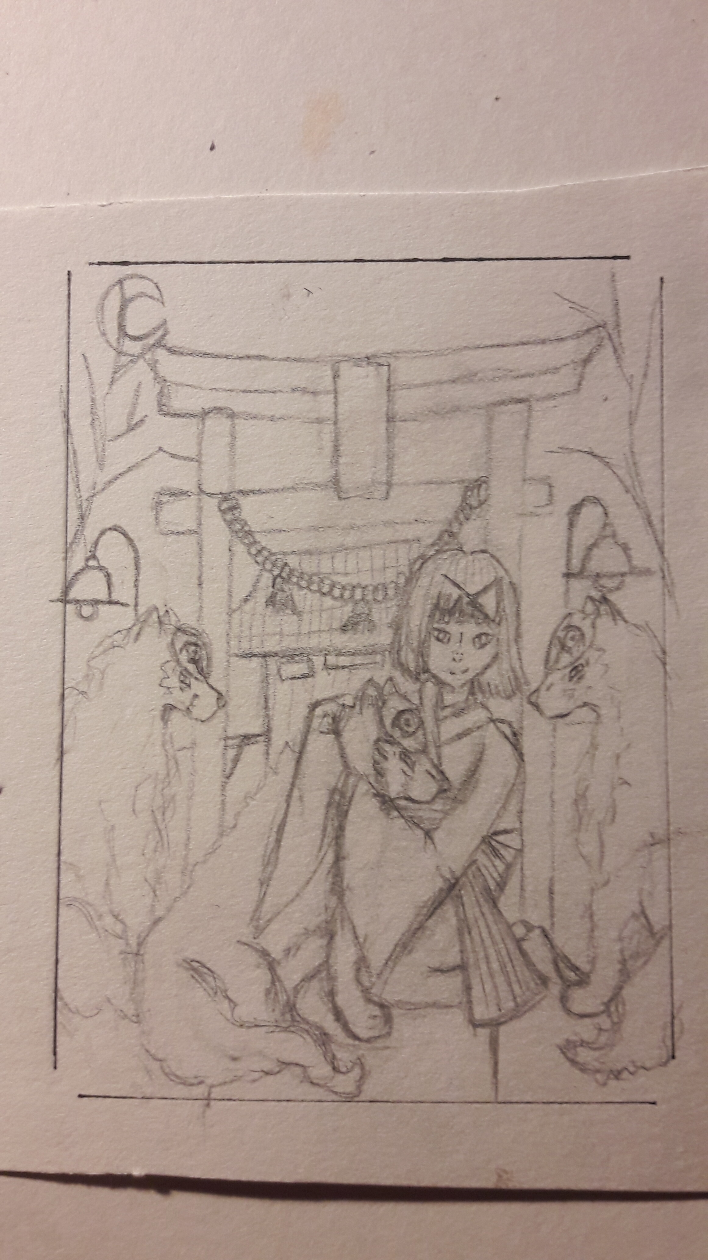 Ich habe jetzt endlich meiner Skizze mit Nora einen Hintergrund gegeben. Ich fand RingFires Idee toll mit dem Schrein und Laternen, also habe ich versucht sie umzusetzen und das ist dabei heraus gekommen. Auf der Vorlage die ich für den Schrein verwendet habe steht auf dem Schild an dieser Art Torbogen (keine Ahnung wie das eigentlich heißt) noch etwas drauf. Da ich aber die Schriftzeichen und so nicht kenne habe ich es auf der Skizze jetzt mal fürs erste freigelassen. Soll ich da noch etwas drauf schreiben? Wenn ja hat irgendwer eine Idee was da hin gehört bzw. was ich hinschreiben soll? (Denn ich stehe gerade irgendwie auf dem Schlauch was das angeht😅)