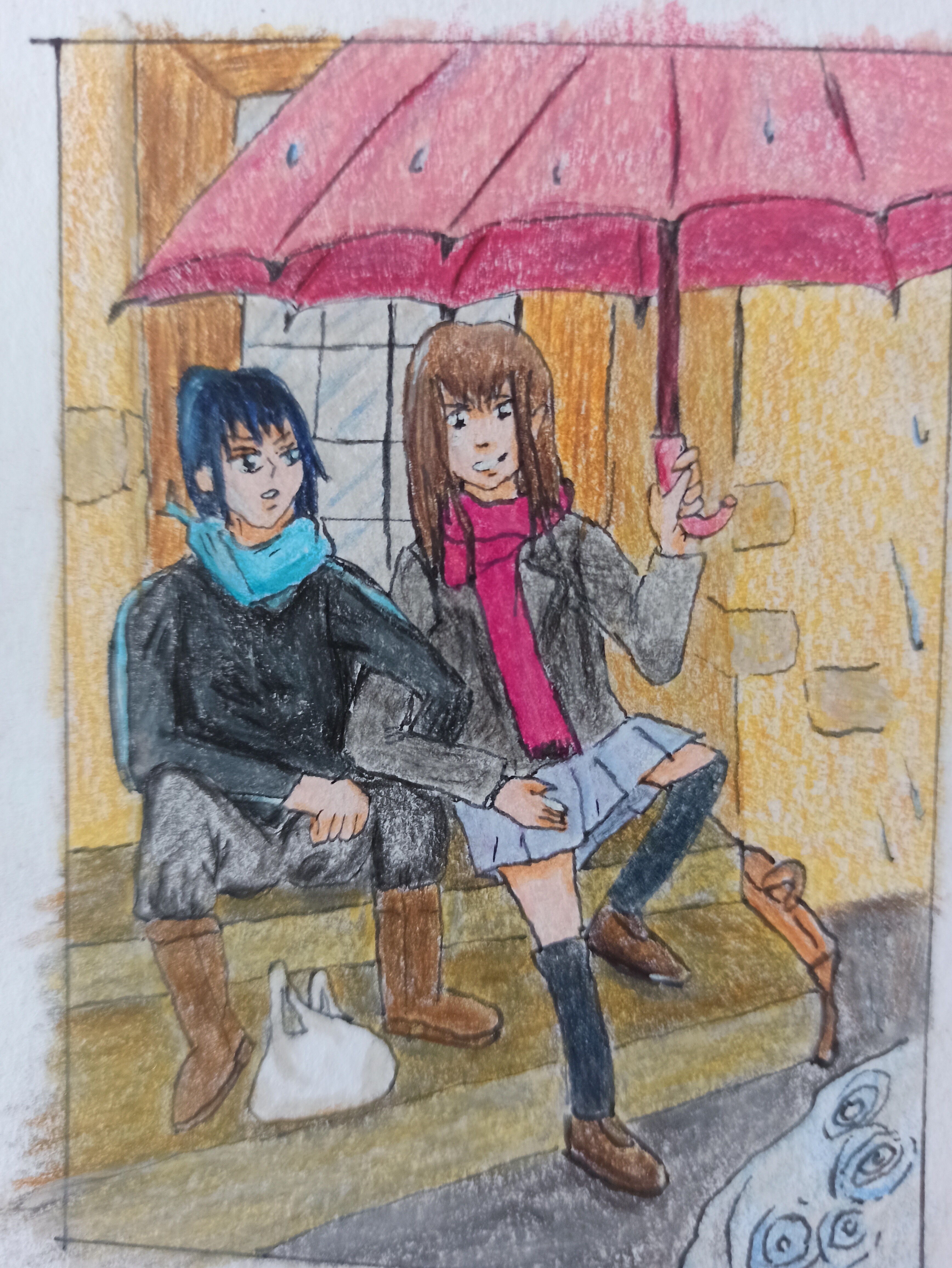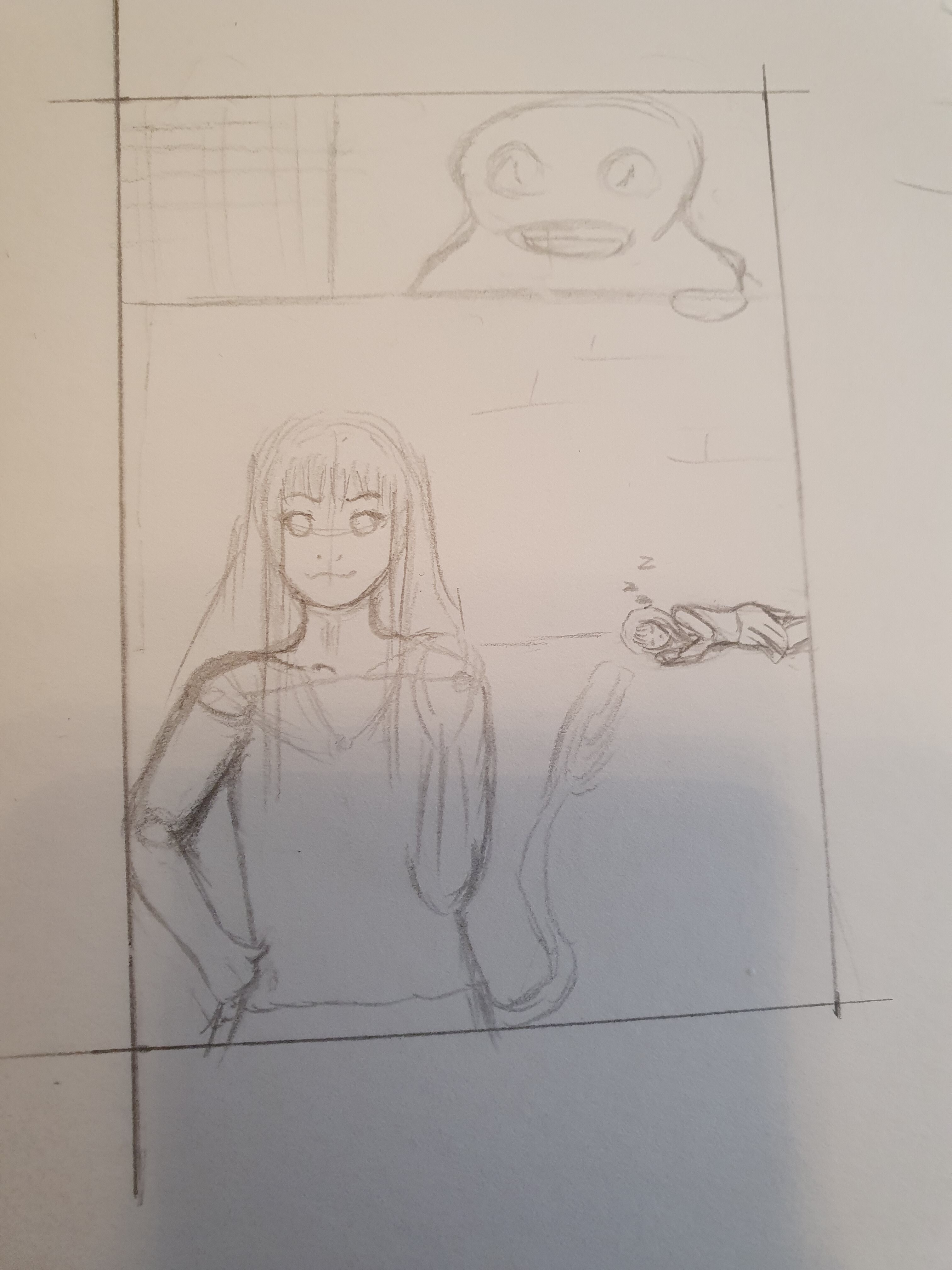 Nr.2 Die Idee ist soweit auch schonmal sehr schön. Hiyoris ernster Blick ist toll :D Wer oder was lünkert denn dahinter über die Mauer? Bei Mauer und Boden würde ich bei der Ausarbeitung nur versuchen drauf zu achten, dass es nicht zu einheitlich koloriert wird :) Aber mit kleinen Details oder einer entsprechenden Mauer/Steinstruktur kann man da ja auch schon viel machen.