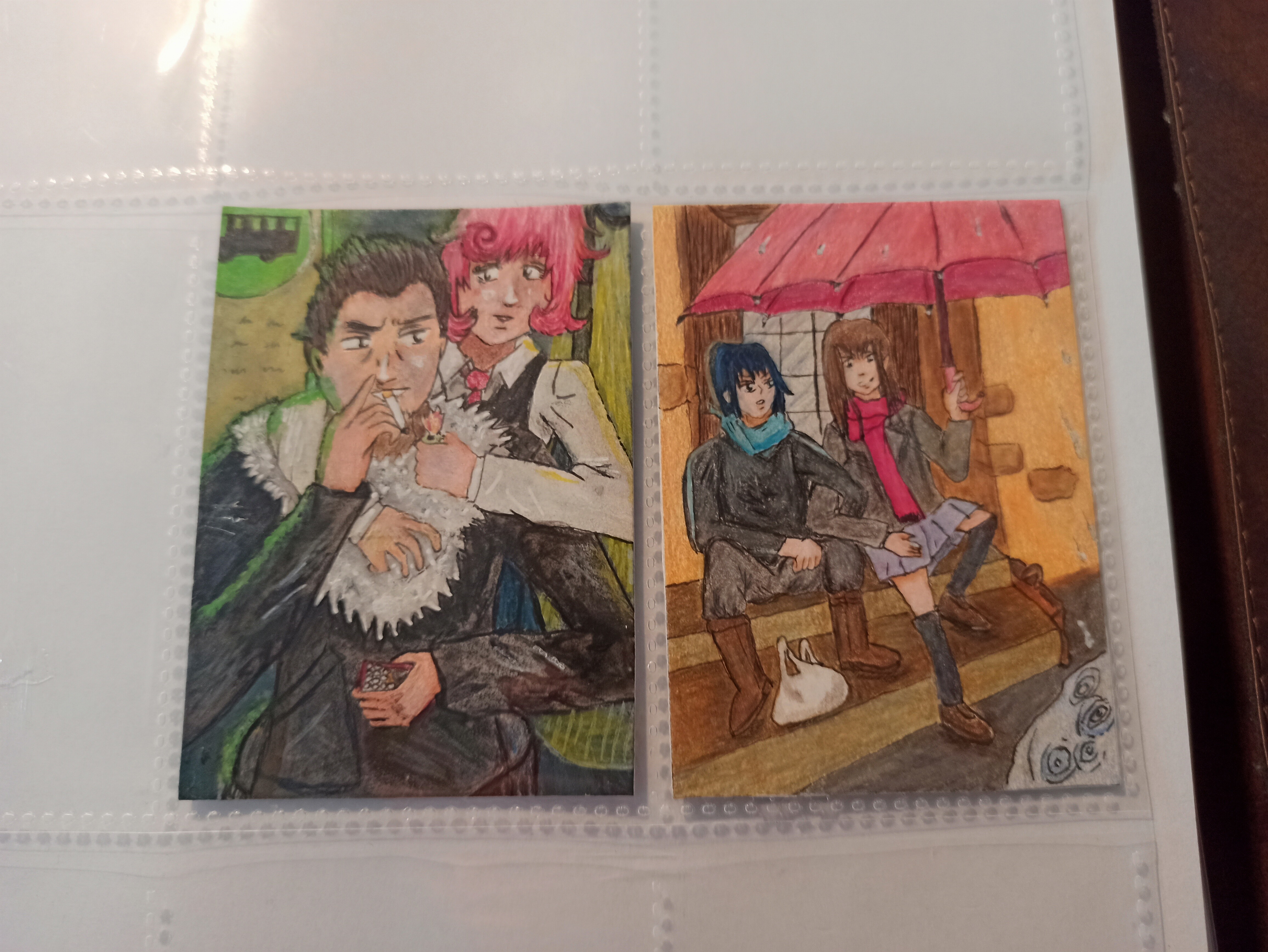 Ich habe eine weitere Karte angefangen ^^ Beim Fotografieren ist mir aufgefallen dass Kazumas Hand noch nicht ganz stimmt, das werde ich noch ändern. Den Hintergrund wollte ich auch eher schlicht halten (ich hatte an diese Art “Splitter” gedacht die um ein Shinki herum sind wenn es sich in seiner Form als Werkzeug befindet aber gerade beim Reden etc gezeigt wird), sonst müsste ich denke ich zu viel quetschen da die freien Stellen doch eher klein sind.