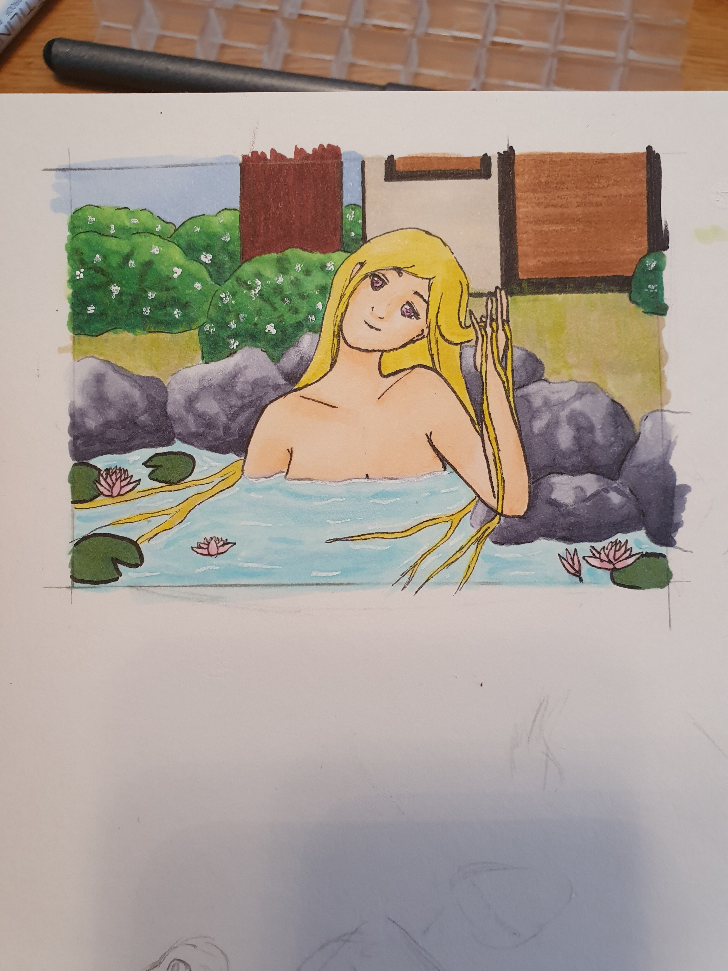@Lunila Sehr schön geworden die Szene, wirkt richtig entspannt :) Der Hintergrund passt auch und gerade der Oasen ist sehr hübsch geworden. Ich überlege gerade, ob sich unterhalb der Büsche und vielleicht der “hinteren/unteren” Haare (also die hinter Hals und Rücken fallen) noch einpaar leicht angedeutete Schatten ganz gut machen würden. Die Steine und Büsche selber haben durch die Schattierungen schon eine schöne Struktur, da wirken die Büsche im Kontrast auf der einheitlichen Wiese z.B. fast schon etwas aufgesetzt.