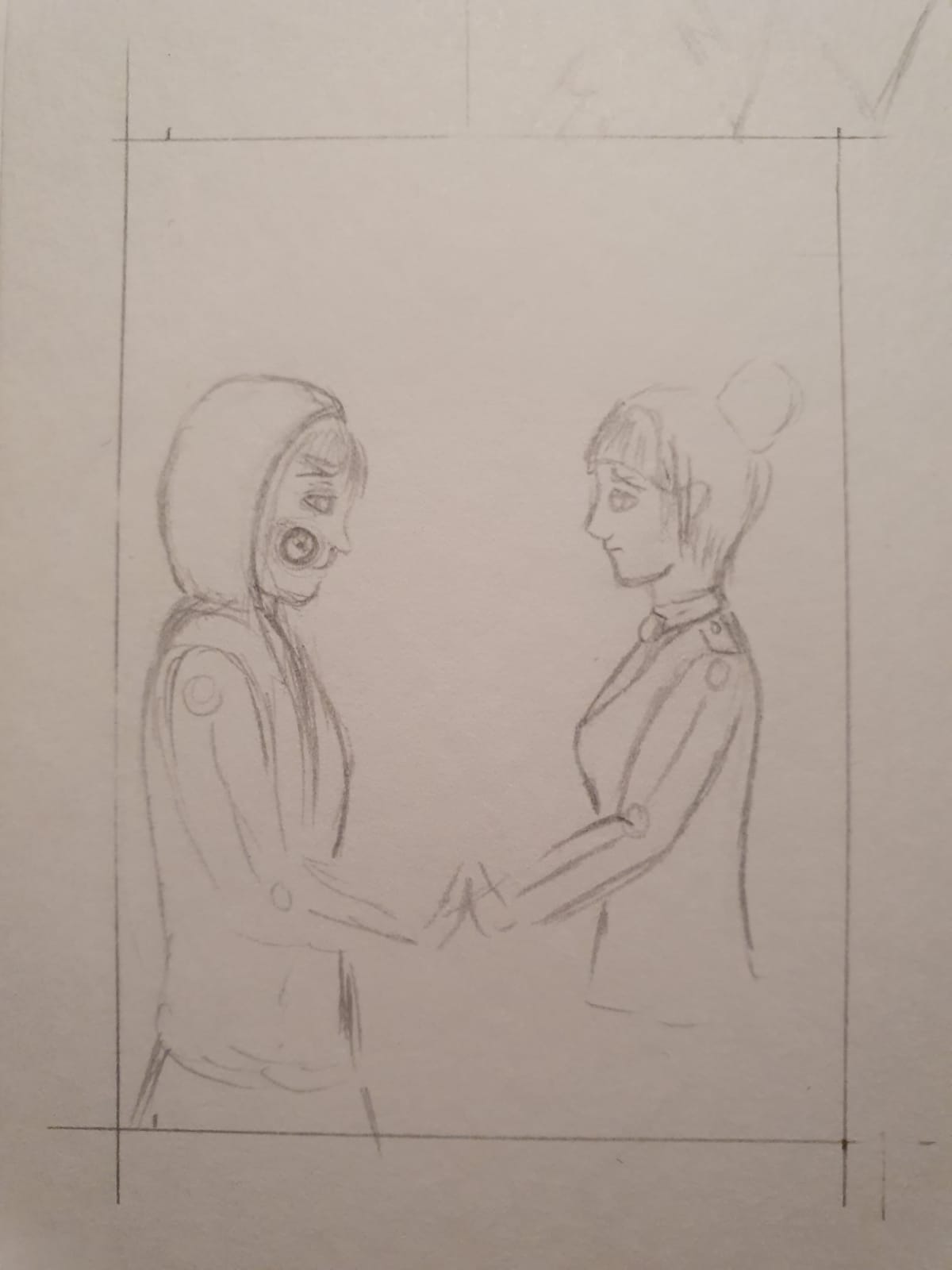 Vielleicht kannst du damit ja einfach etwas experimentieren :) Und wenn es mit der Seitenansicht/ Pose der beiden schwieriger ist kannst du auch da ja nochmal schauen, ob sich etwas anderes mehr anbietet. Prinzipiell finde ich die Idee der Gegenüberstellung so aber schon sehr schön :)