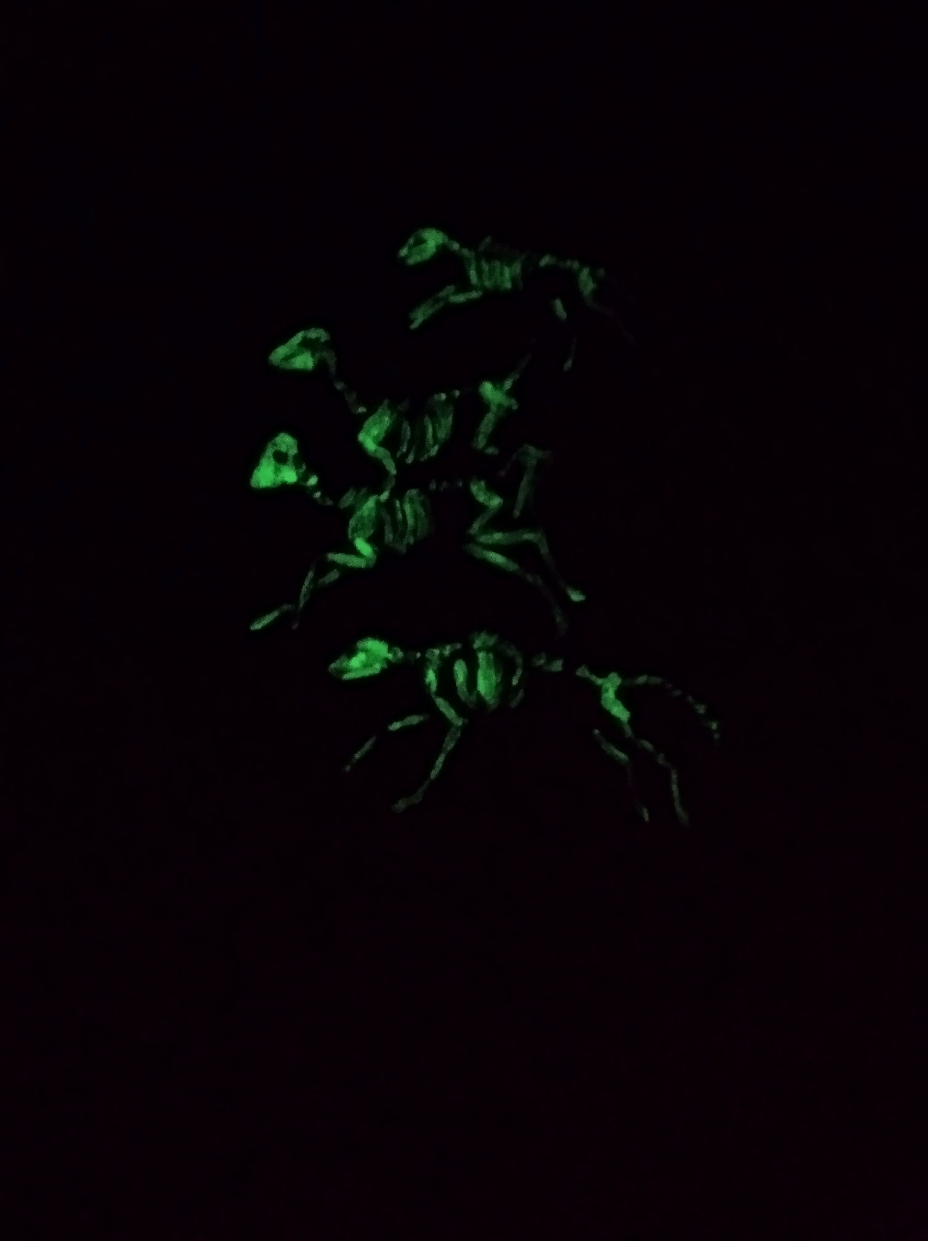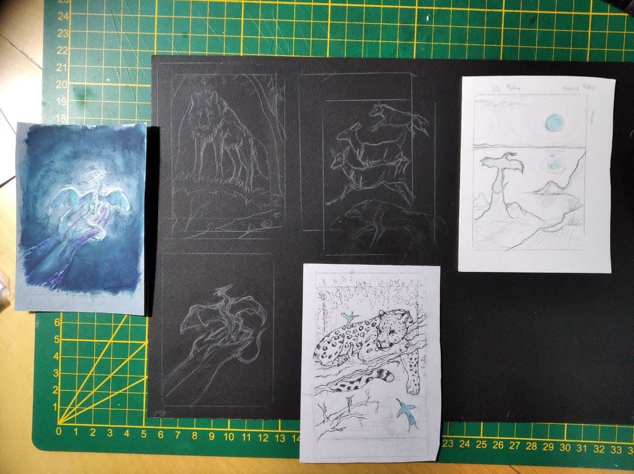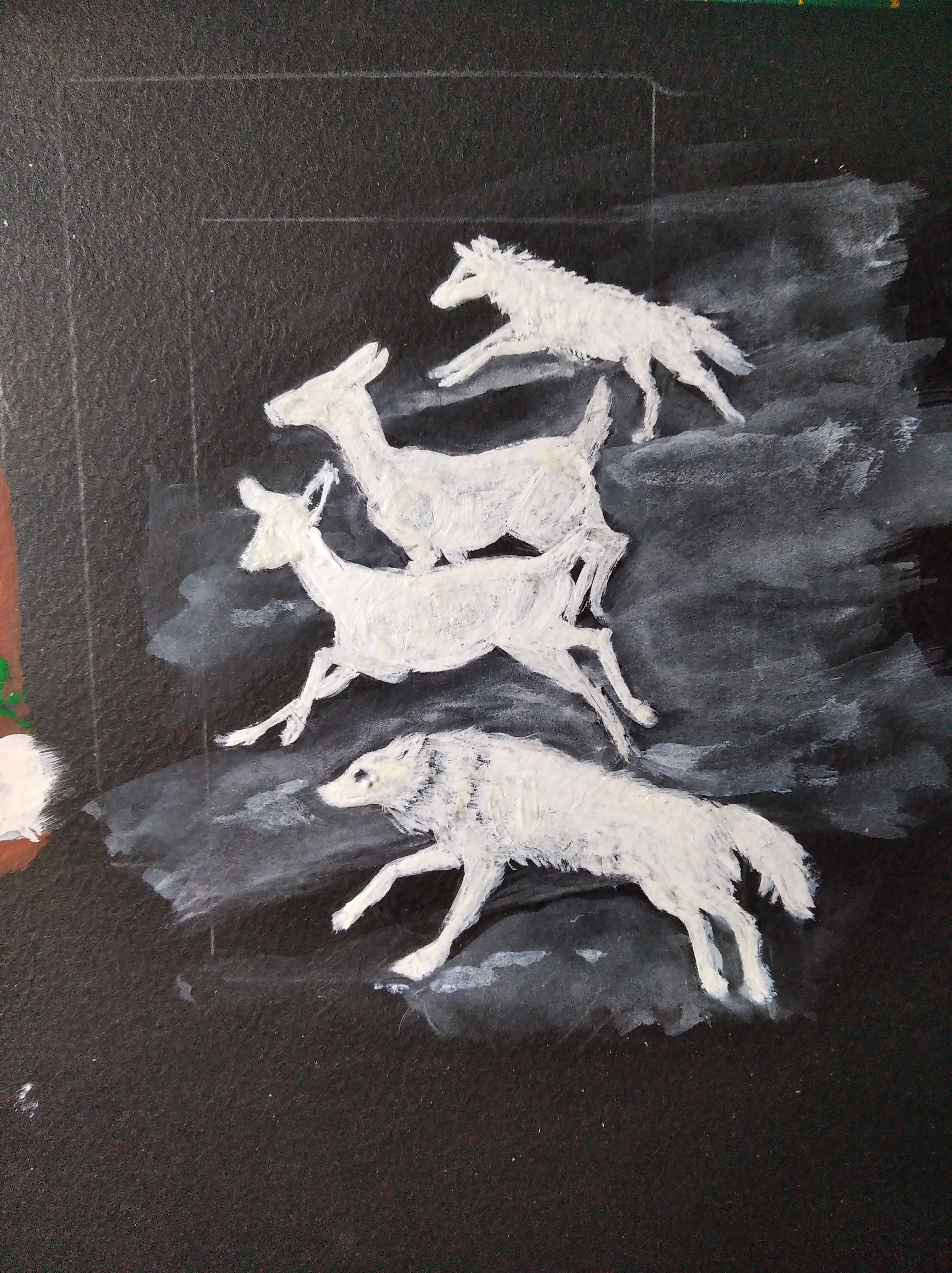 Wolf war erster Versuch, Hirsche und Wölfe als zweite. Und zwar als Blockartig gemalt, Wolf/Hirsche in weiß und mit der weißen Acryltusche dann Skelette, sodass die dann leuchten.