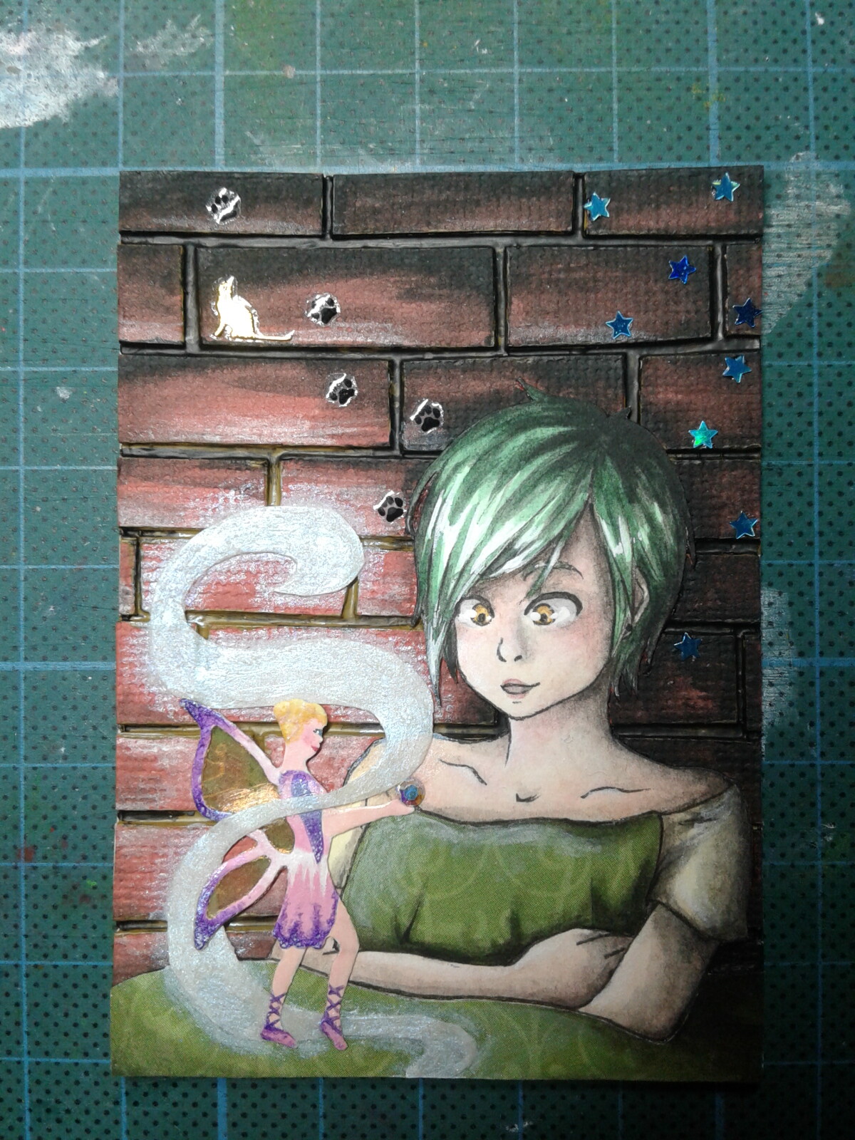 Hm, also das um die Elfe wird leider nix. Die ist teilweise erhöht aufgeklebt und es würde den Aufbau kaputt machen, wenn ich drumherum male und es würde mit den schichten nicht gut aussehen. Eigentlich ist auf ihren flügeln auf der rückseite der Folie auch was in grün aber das ist sehr dezent weil es vom Blau überstrahlt wird. Ich müsste also wirklich dick was vom Grün AUF die Elfe malen, damit mensch es überhaupt sieht oder was von der blauen Acryl-pigmentmischung nehmen aber beides würde dann komplett die koloration der Elfe kaputt machen :/