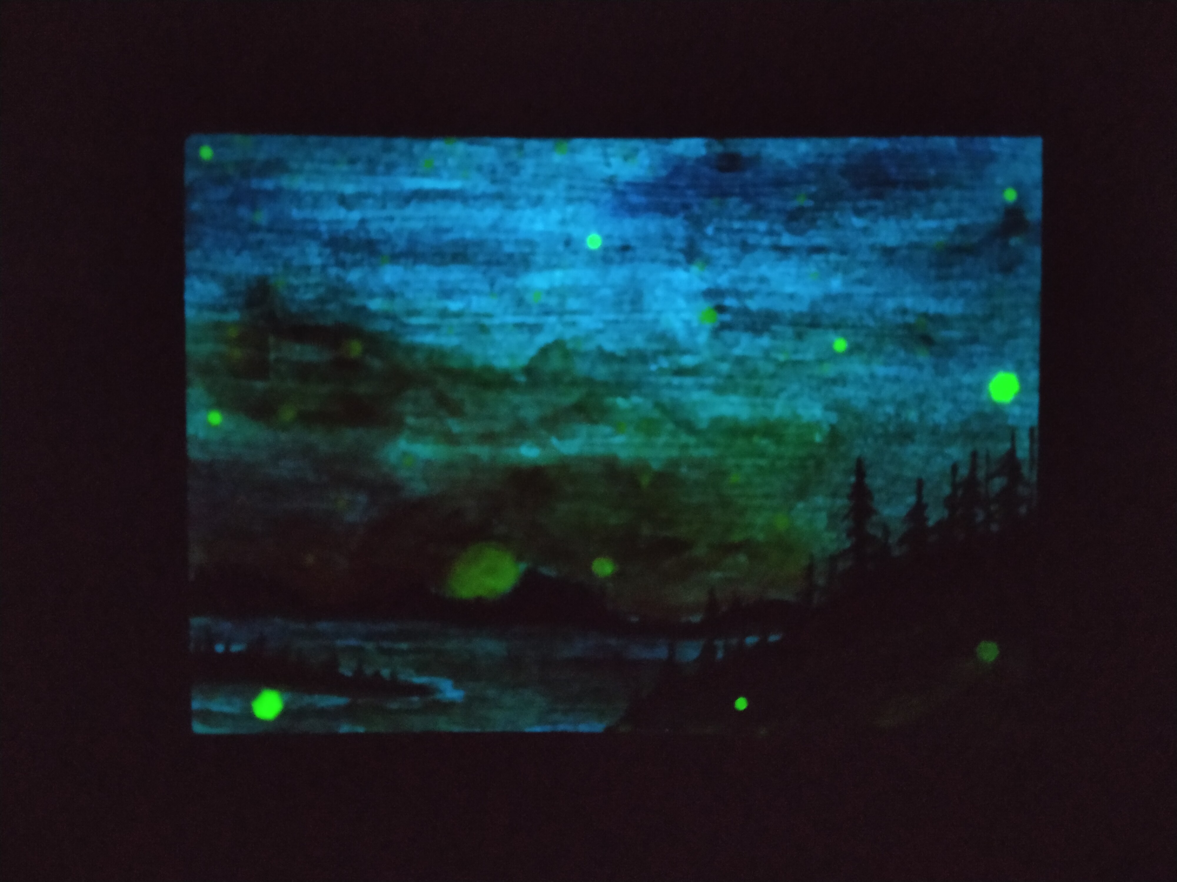 Sehr sehr schwach, das Grün wird einfach vom Blau überstrahlt. Ich habe leider nur Farbe/pigment zur Verfügung aber Nani schickt mir was von ihren Pailletten die ich dann statt/mit den Sternen arrangieren würde.