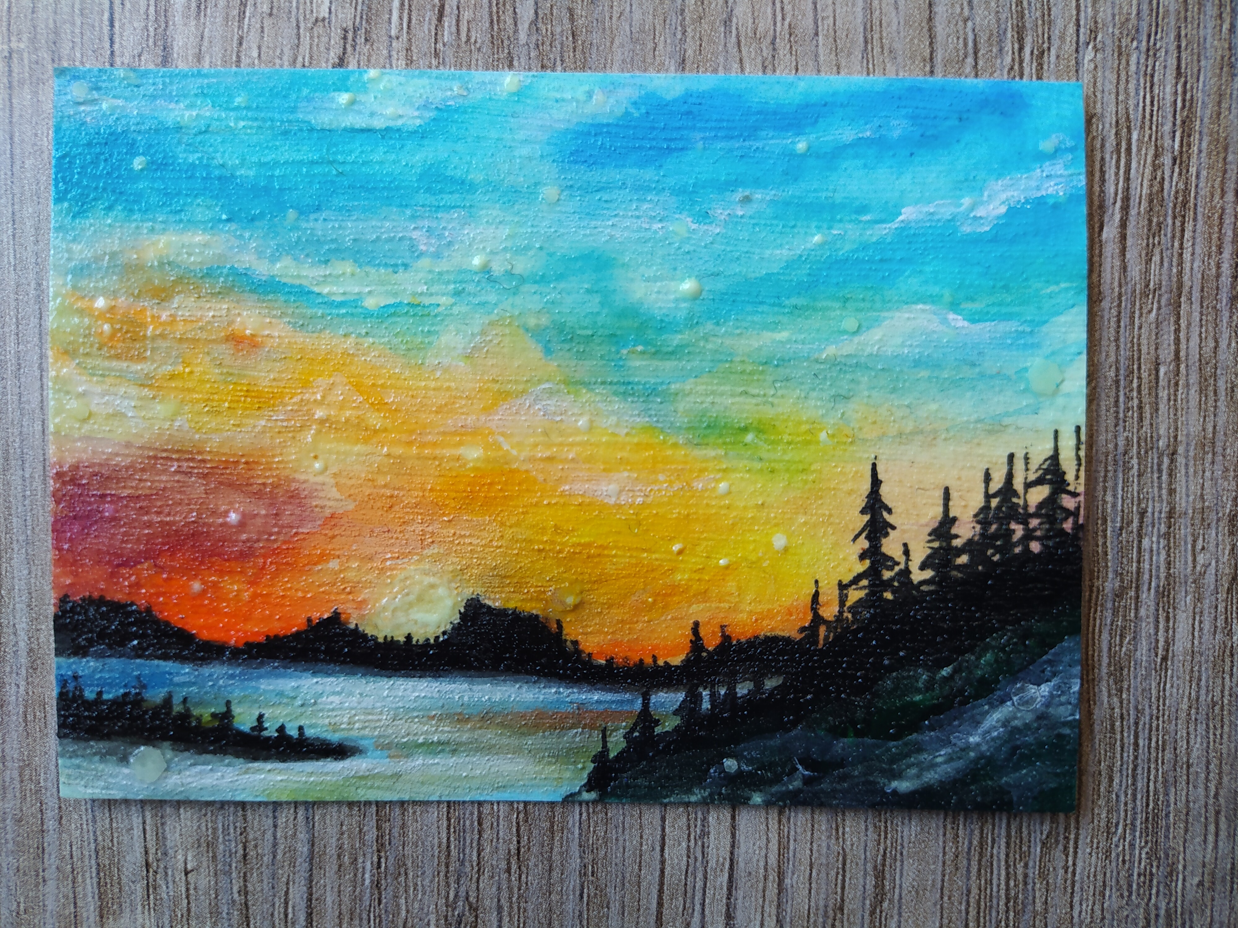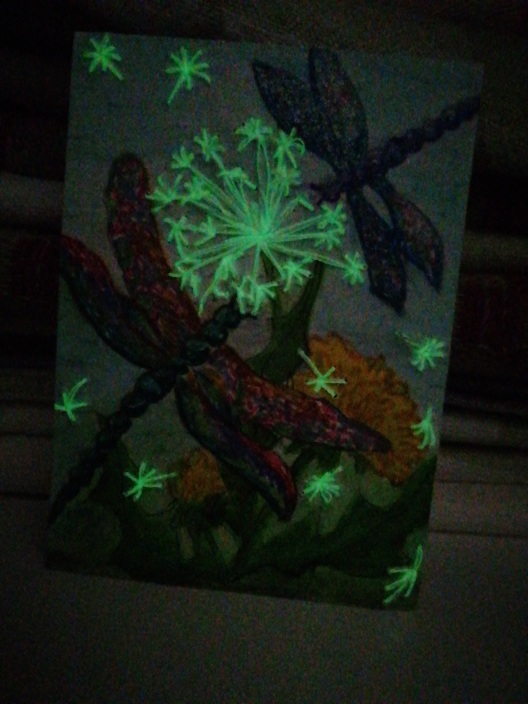 Und zwar. Sonnenuntergang, wo das leuchtende orangne und lilane Pigment eingearbeitet wird und dann, da starkes Licht, alle Highlights mit der nachleuchtenden Acrylfarbe bemalt, sodass, so die Hoffnung, wenn es dann im dunkeln zu sehen ist, quasi dann eine Mondszene wird.