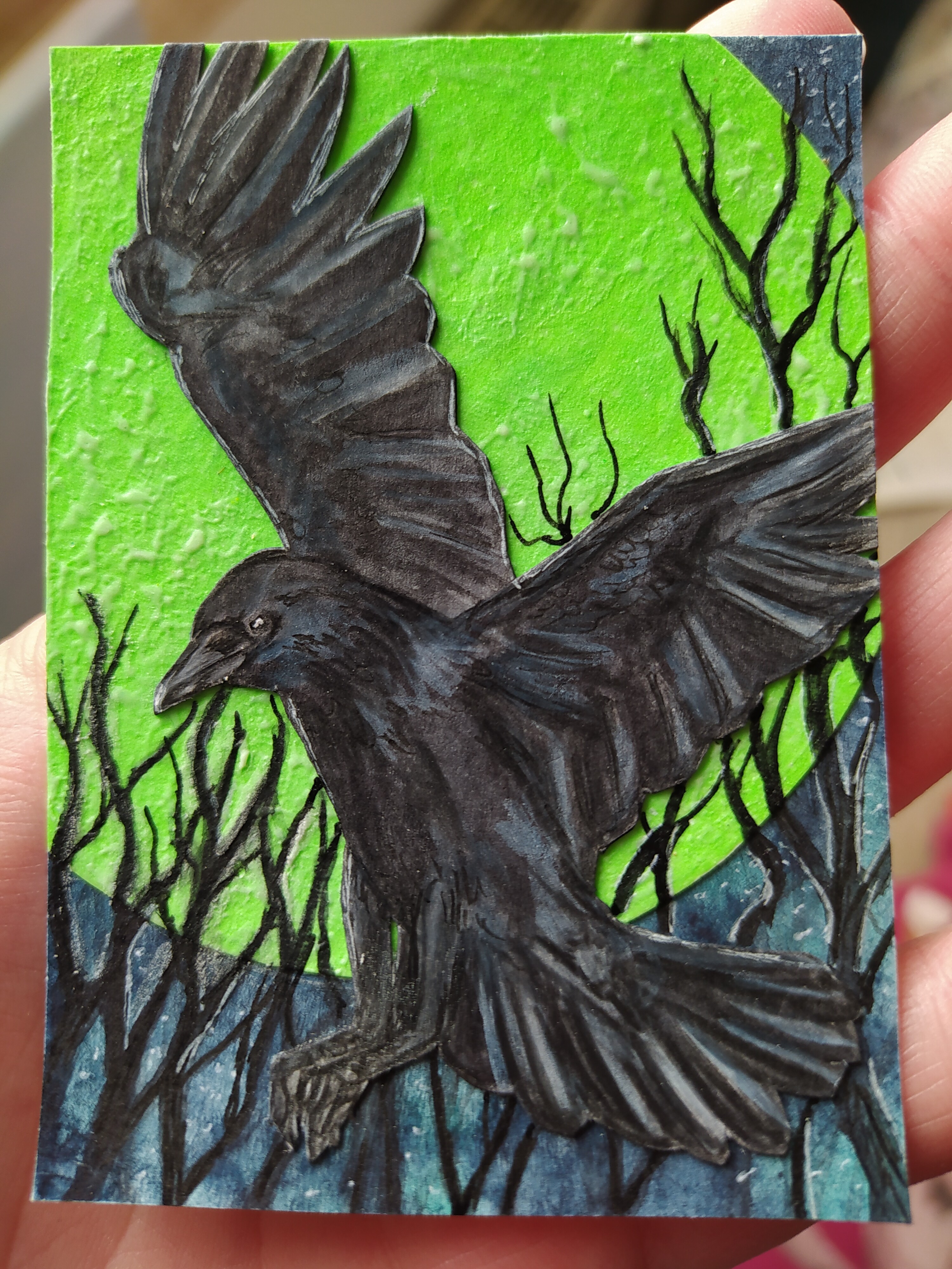 Leo hab ich etwas umgeschwenkt. Leuchten soll die Sillhouette im Wasser, Kolibris und Flecken und im Hintergrund dann Pailletten reinkleben.