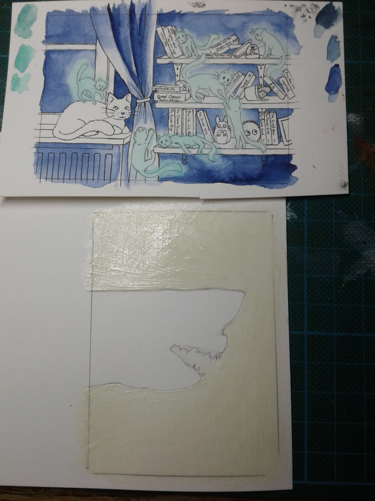 Und meine anderen beiden Karten. Ich hoffe das dritte Motiv wäre so zugelassen, das ziel ist den Hai mit gleichfarbigem Acryl auszumalen und dann eine alte und zerkratzte Folie (und eventuell eine Hand mit Taschenlampe) wie eine Glasscheibe davor zu kleben. So das mensch das richtige Motiv, also den Hai nur sieht wenn es im dunkeln leuchtet. :3