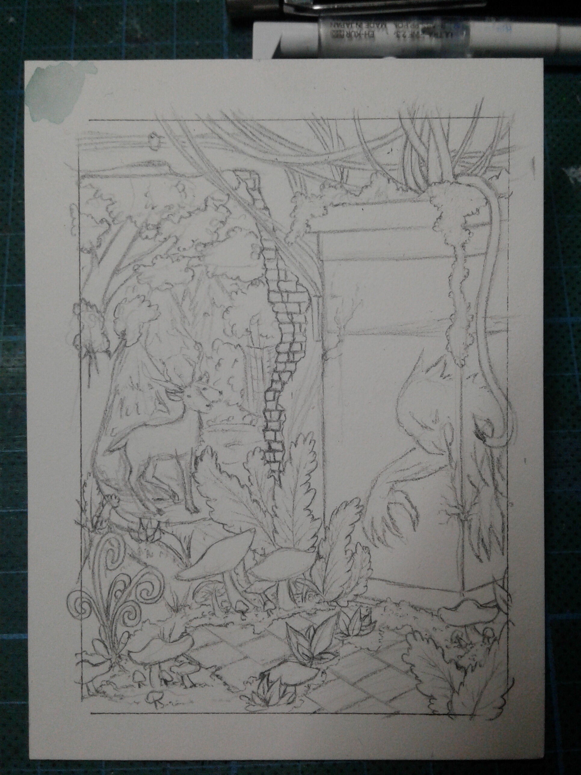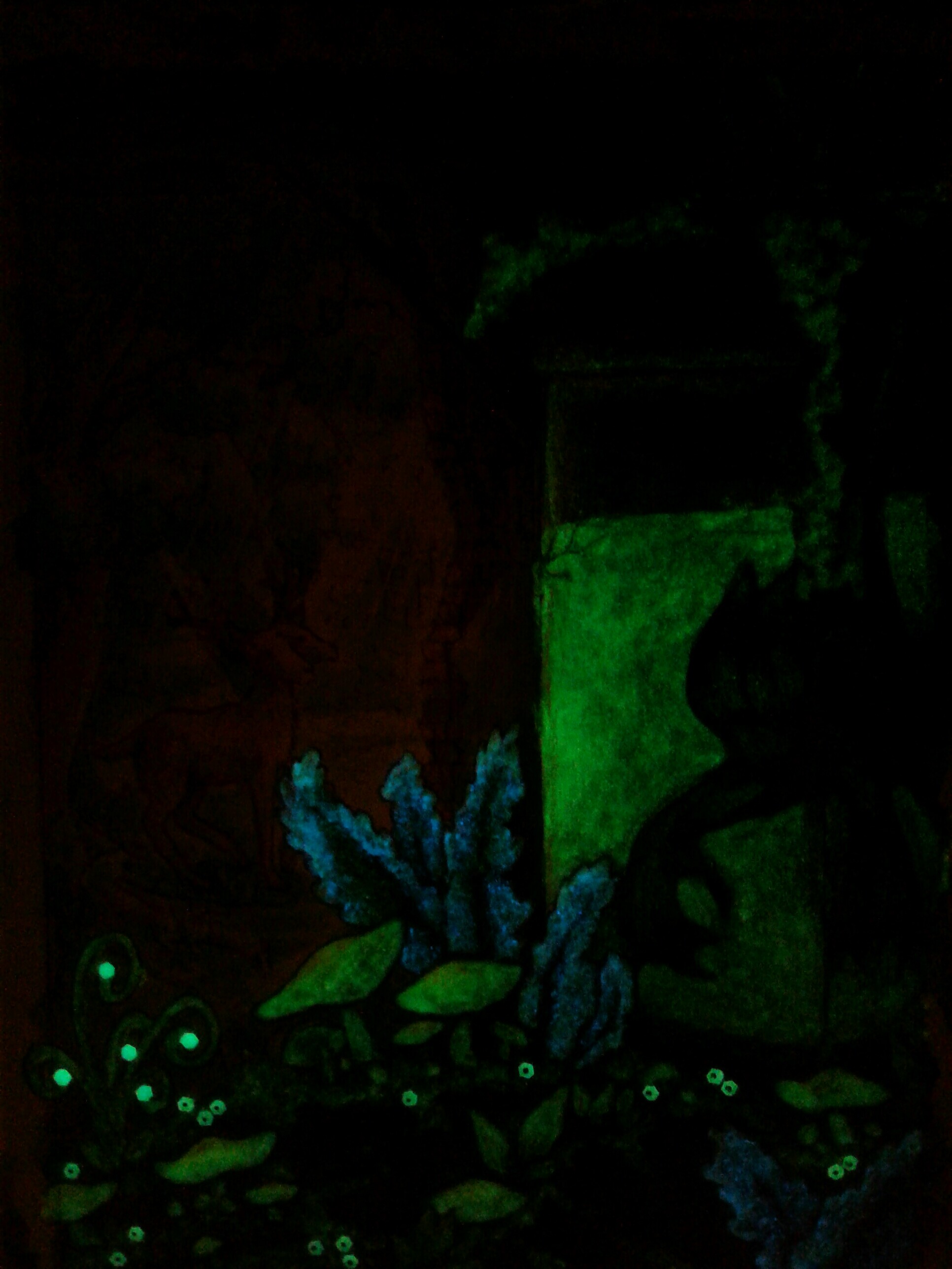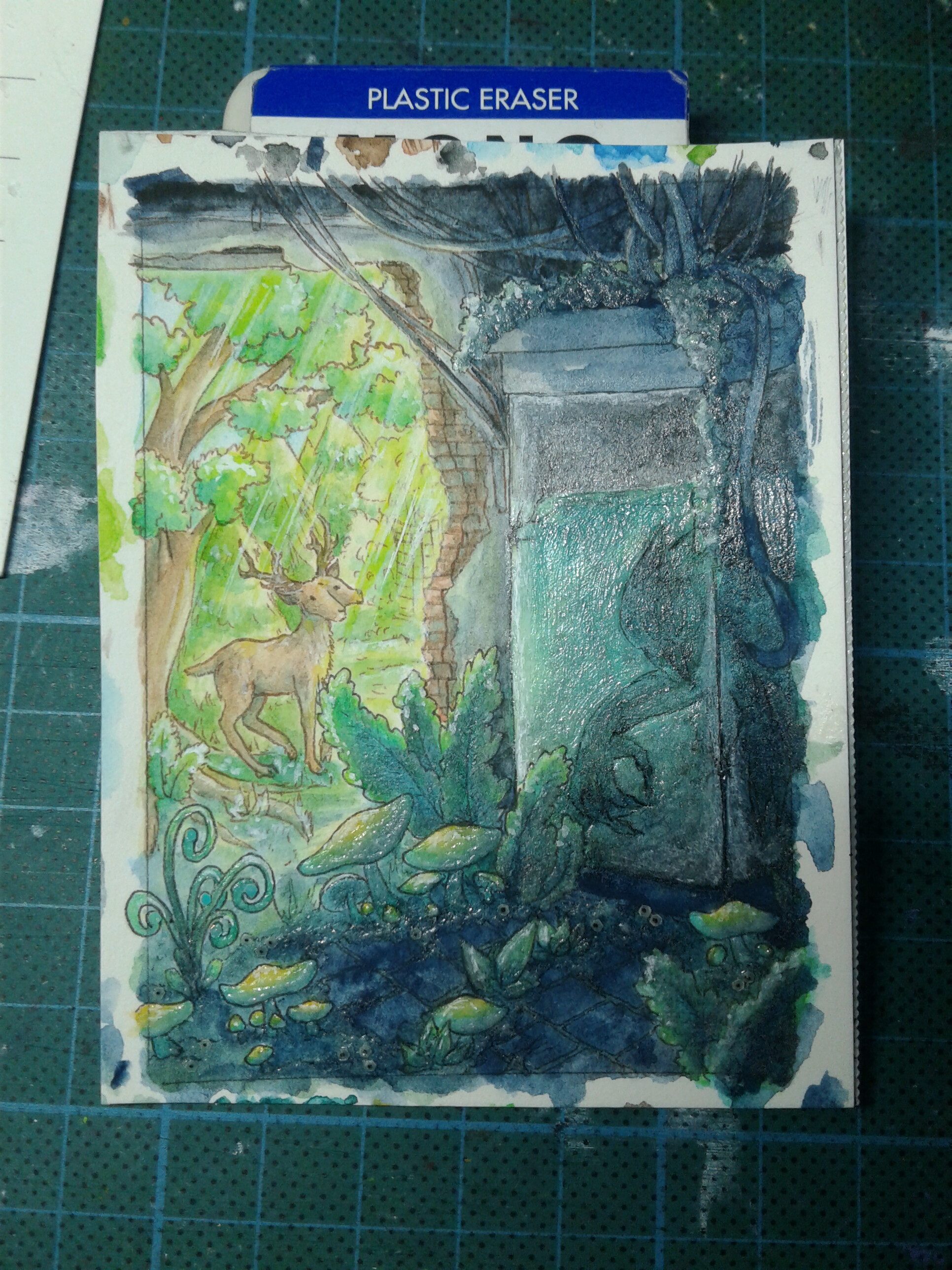 Und das hier wäre dann die neue Karte. Am Tag soll der Fokus mehr auf dem hellen Hintergrund und dem Hirsch liegen, im dunkeln leuchten dann die Flüssigkeit im Tank und die Pflanzen und Pilze im Vordergrund weil die was von der ausgelaufenen Substanz absorbiert haben. :3