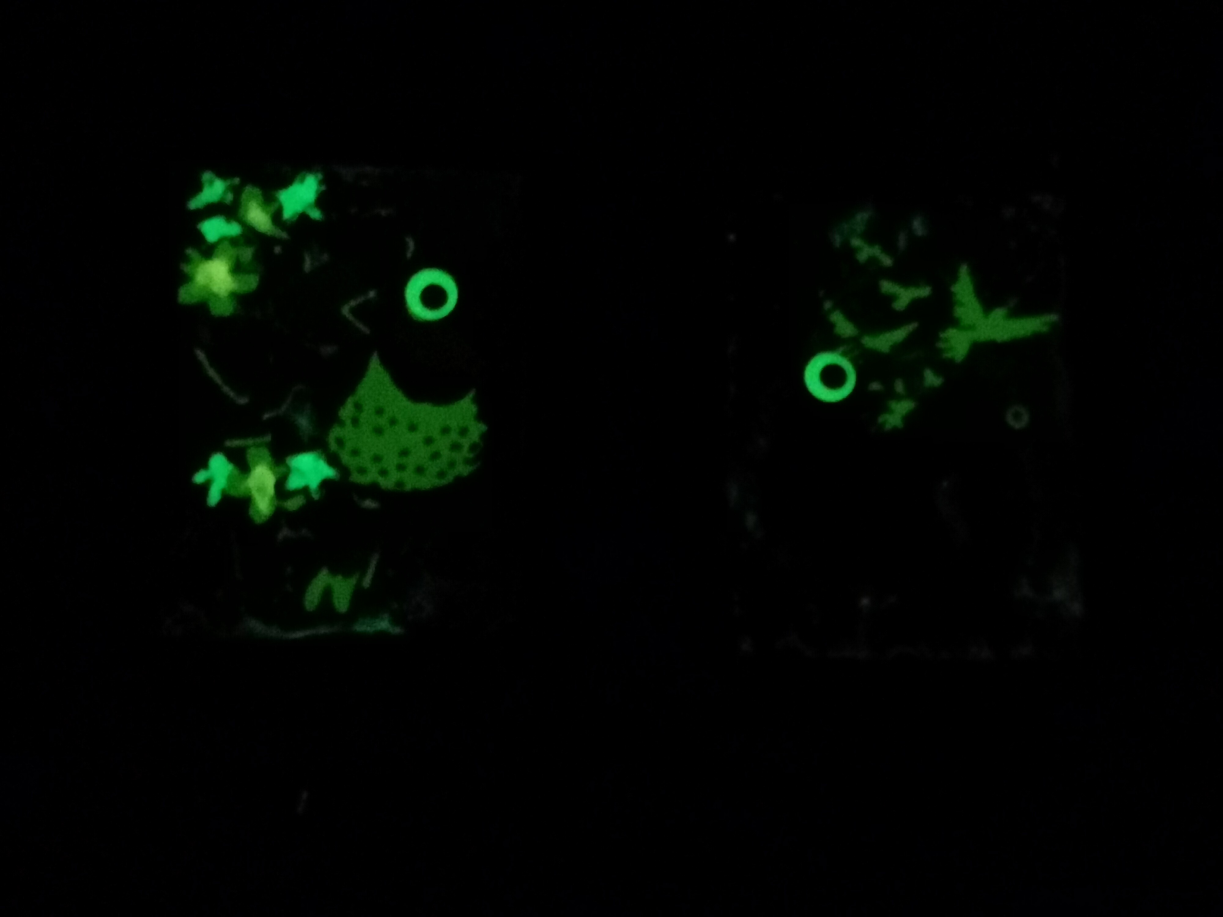 Hier wäre die Karte im dunkeln, das Moos am boden, die Konturen der kreatur und einige stellen die jetzt kaum zu sehen sind leuchten aber eigentlich noch etwas mehr, das war das beste was ich aus meiner Kamera rausbekommen hab