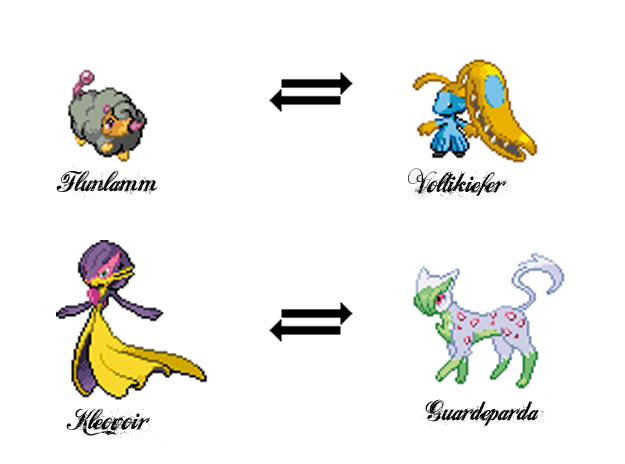 Ich werde diese 4 Pokemon kombinieren und daraus 2 Fusionen erstellen. Diese Zeichne ich euch in beiden Varianten und schicke sie euch zu sobald sie fertig sind. Die kann unter Umständen ein paar Tage dauern, bitte habt daher ein klein wenig Geduld mit mir.