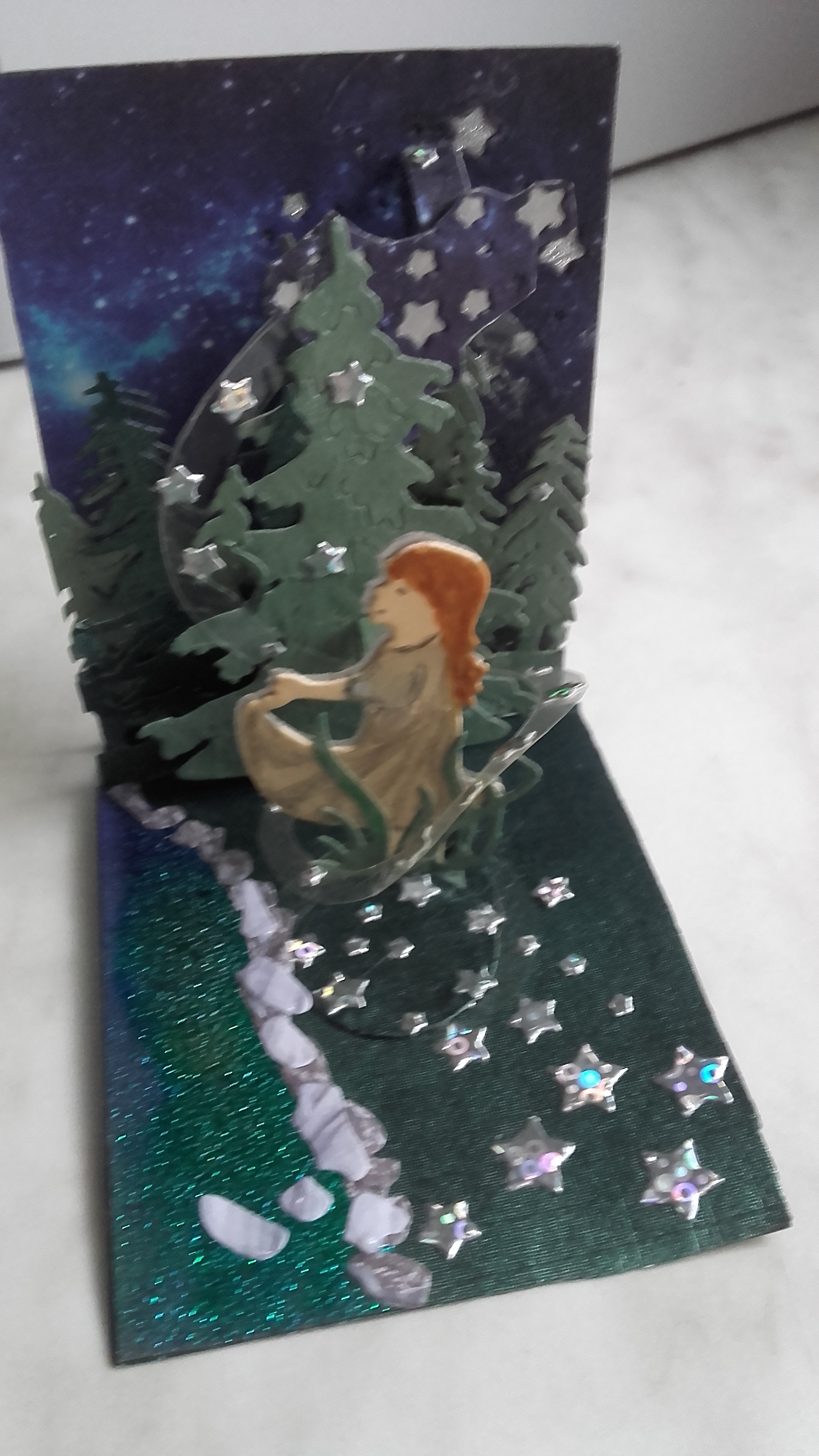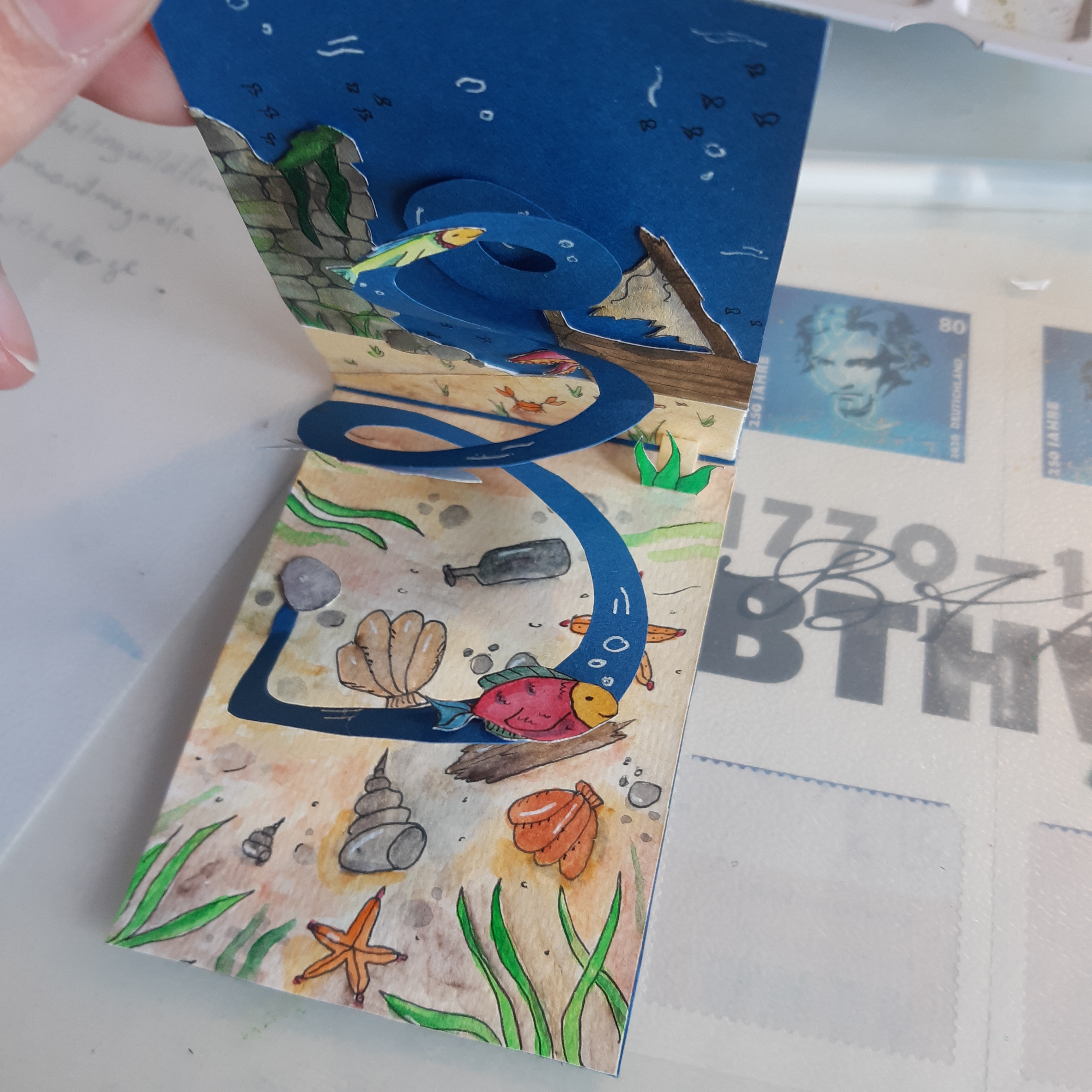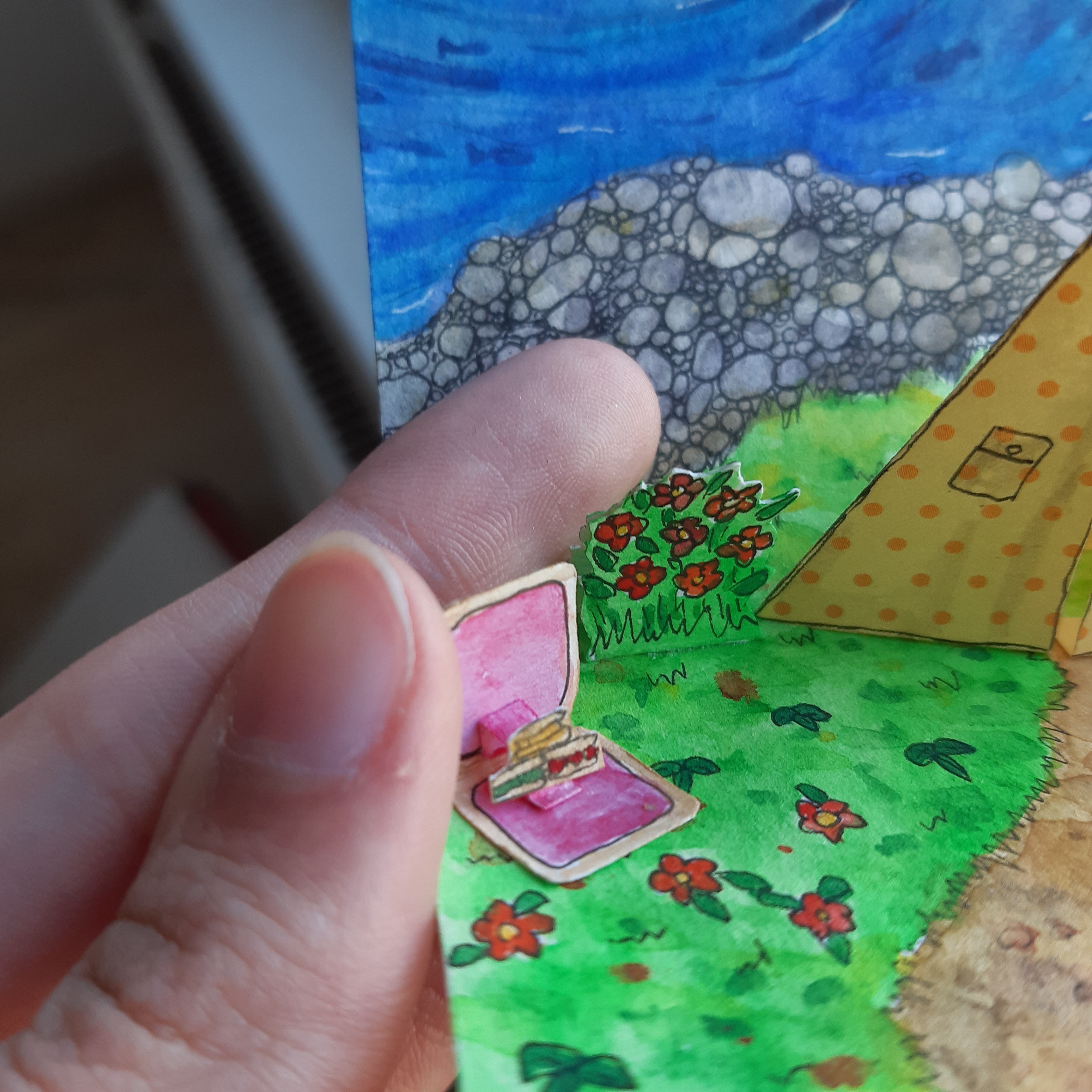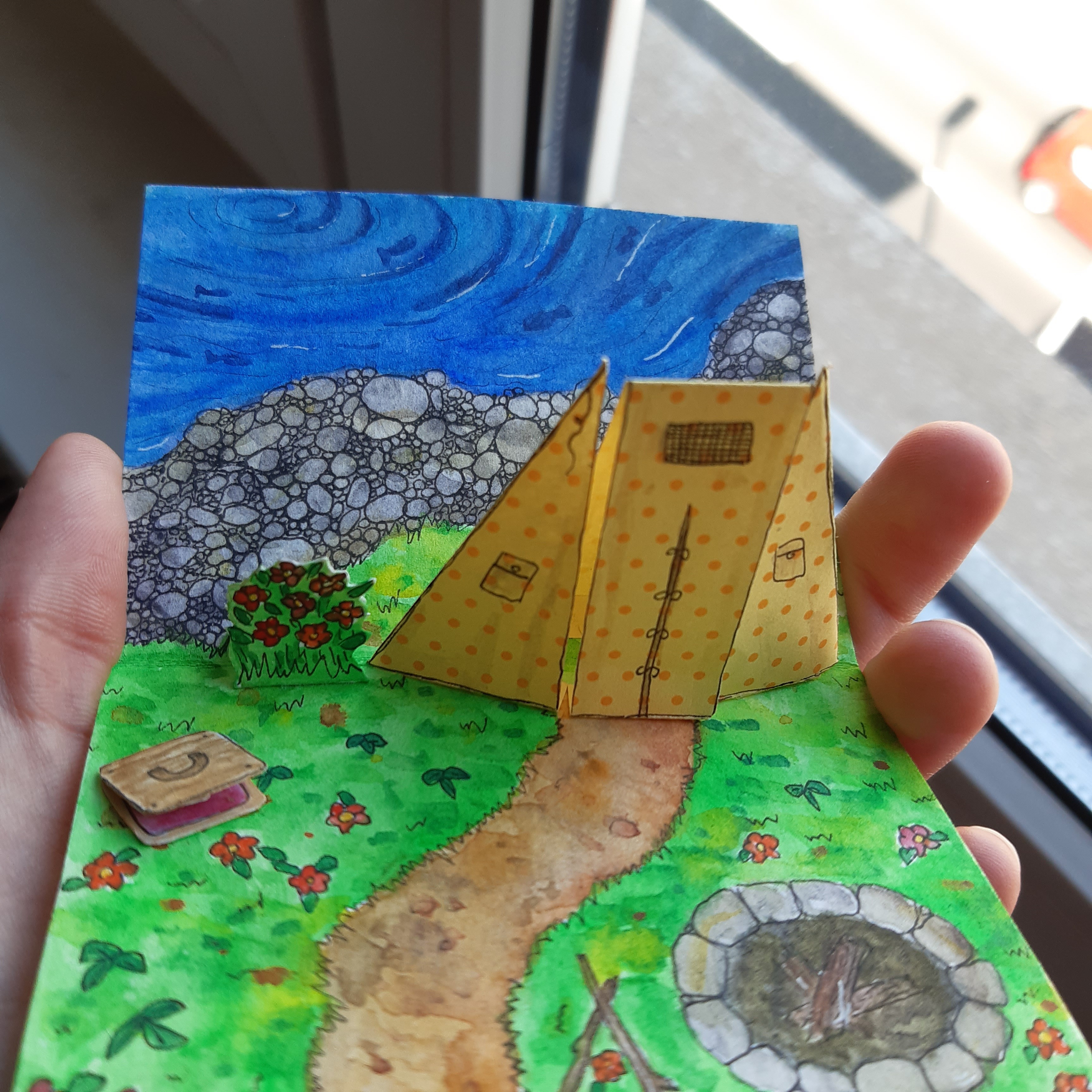 @Glitzermond du darfst auch definitiv stolz sein! Das ist keine einfache Technik und das kleine Zelt ist auf jeden Fall sehr hübsch geworden :) Mit kommt die Karte insgesamt noch ein wenig leer vor durch die großen Flächen, vielleicht ein paar Fische im Wasser oder ein paar Campingsachen? Die kannst du ja problemlos gebastelt einfügen. Durch die komplexe Technik musst du nicht zwingend mehr Pop-Up-Elemente einbringen, was ich mir aber, falls du es versuchen willst sehr gut vorstellen kann: Einen Koffer, eine Kiste, einen Picknickkorb o.a. auf die Grünfläche setzen, den man nochmal separat aufklappen kann (also manuell, mehr direkte Mechanik einzufügen dürfte schwierig sein) da könntest du dann auch noch einmal etwas aufpopen lassen, als Karte in der Karte quasi . Wahrscheinlich etwas friemelig aber den Effekt denke ich mir großartig :) und du könntest es ja im Grunde erstmal separat basteln und nur einfügen, falls es klappt damit der Karte nichts passiert.