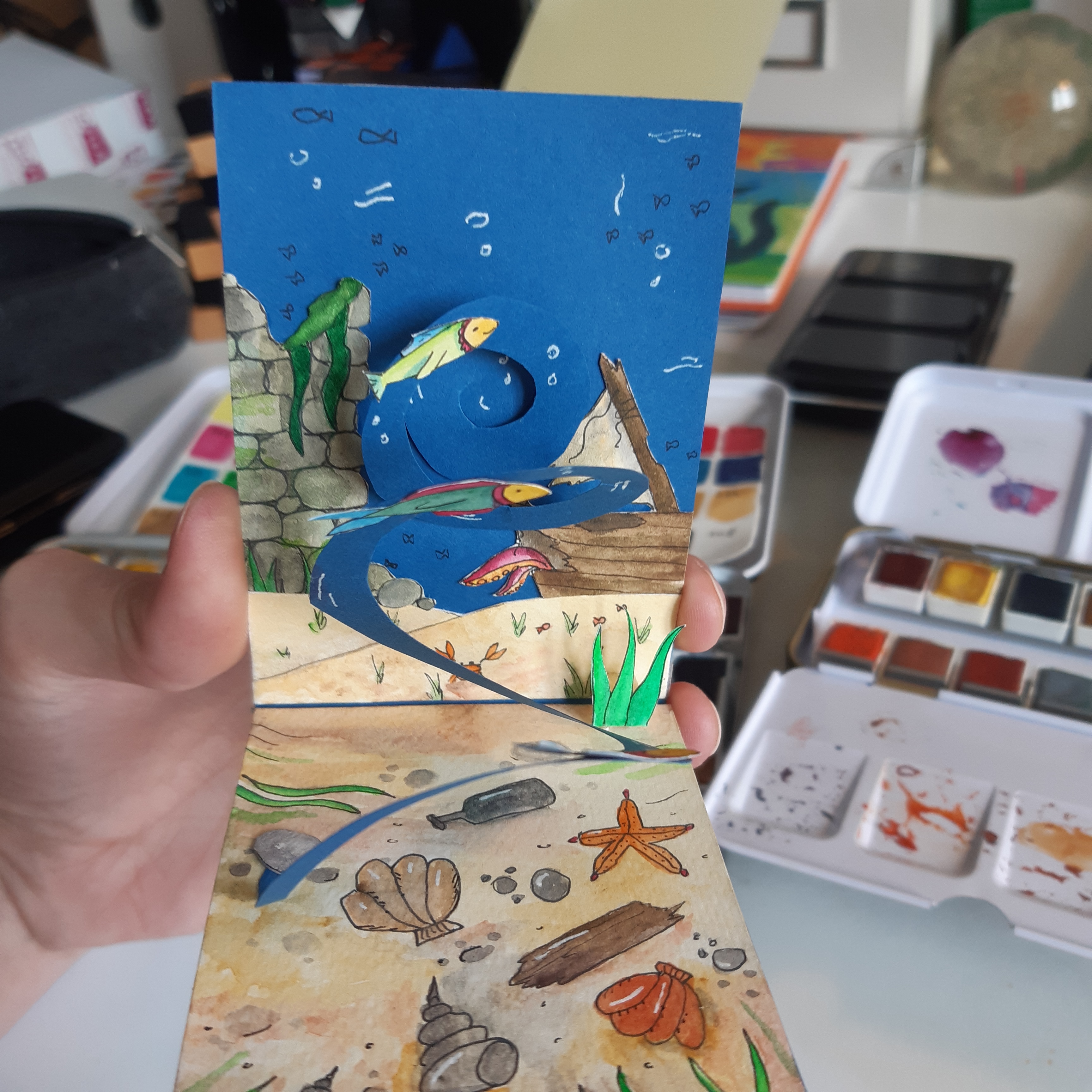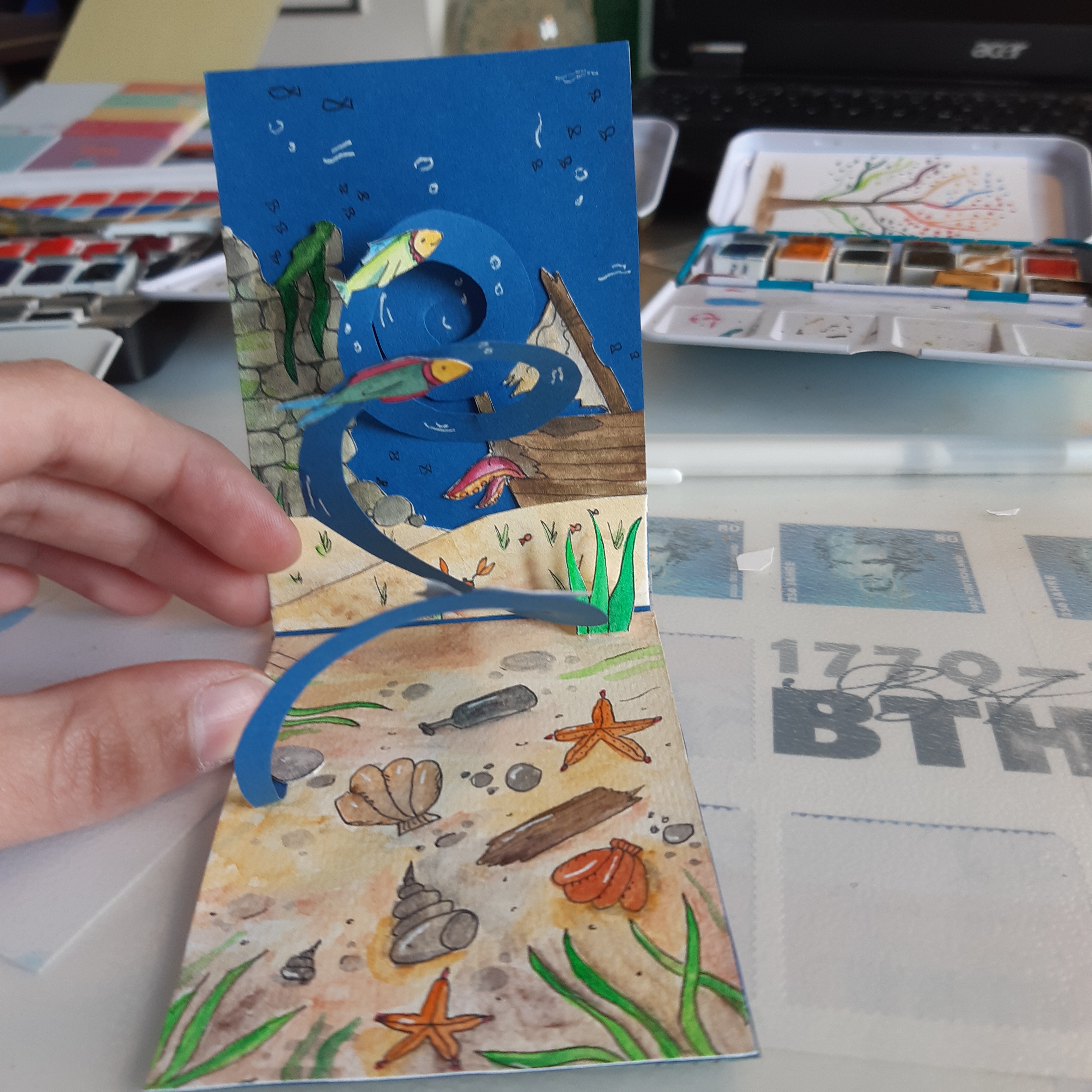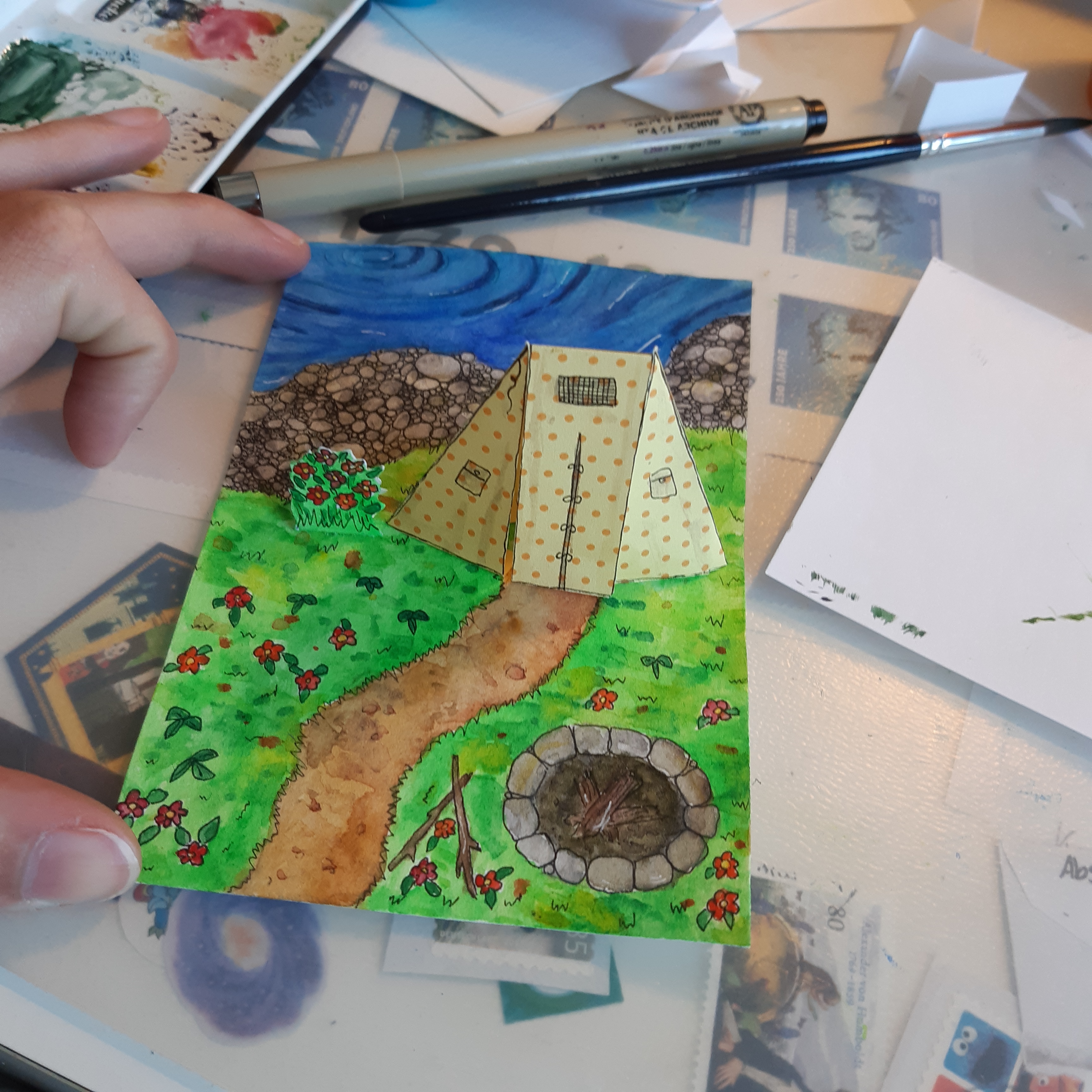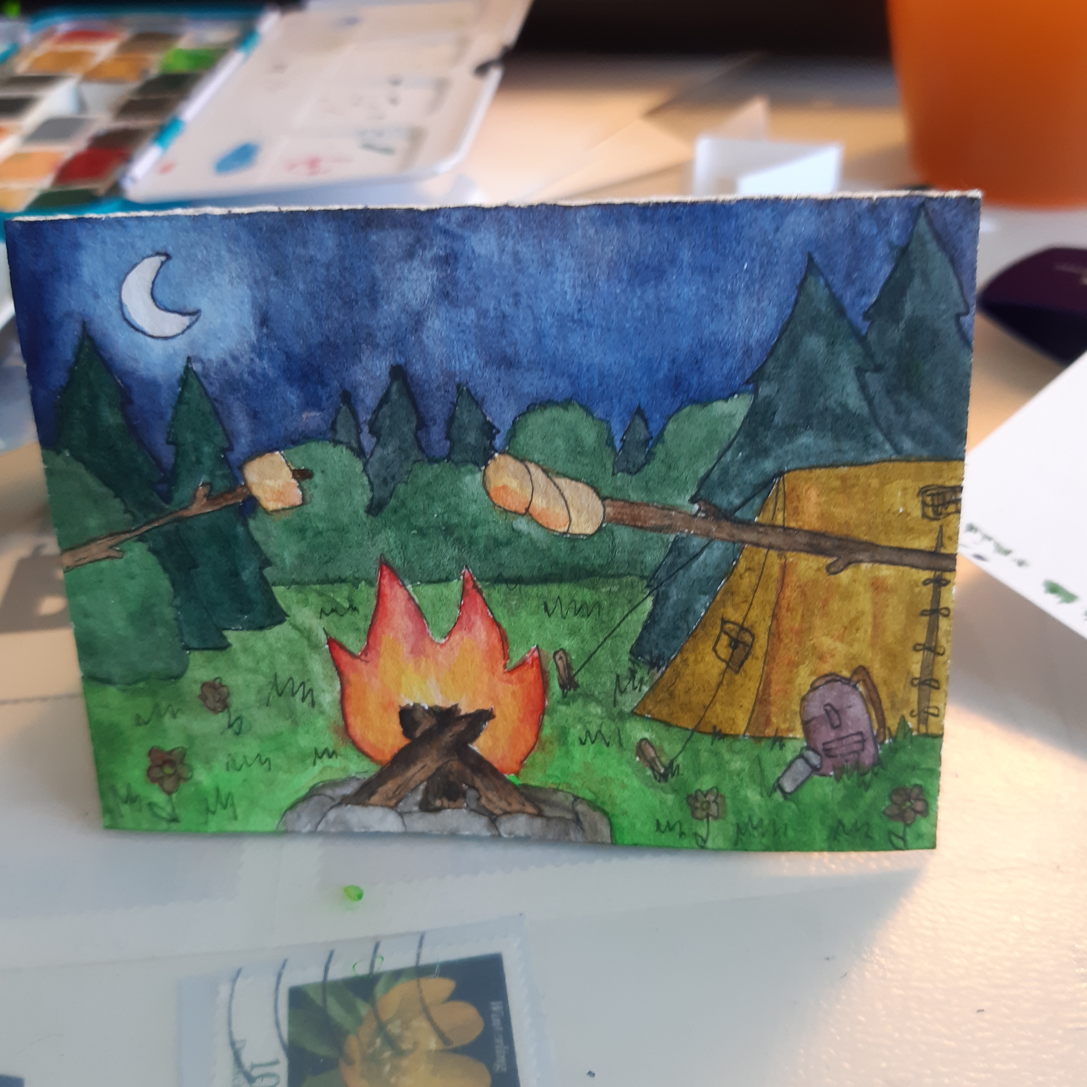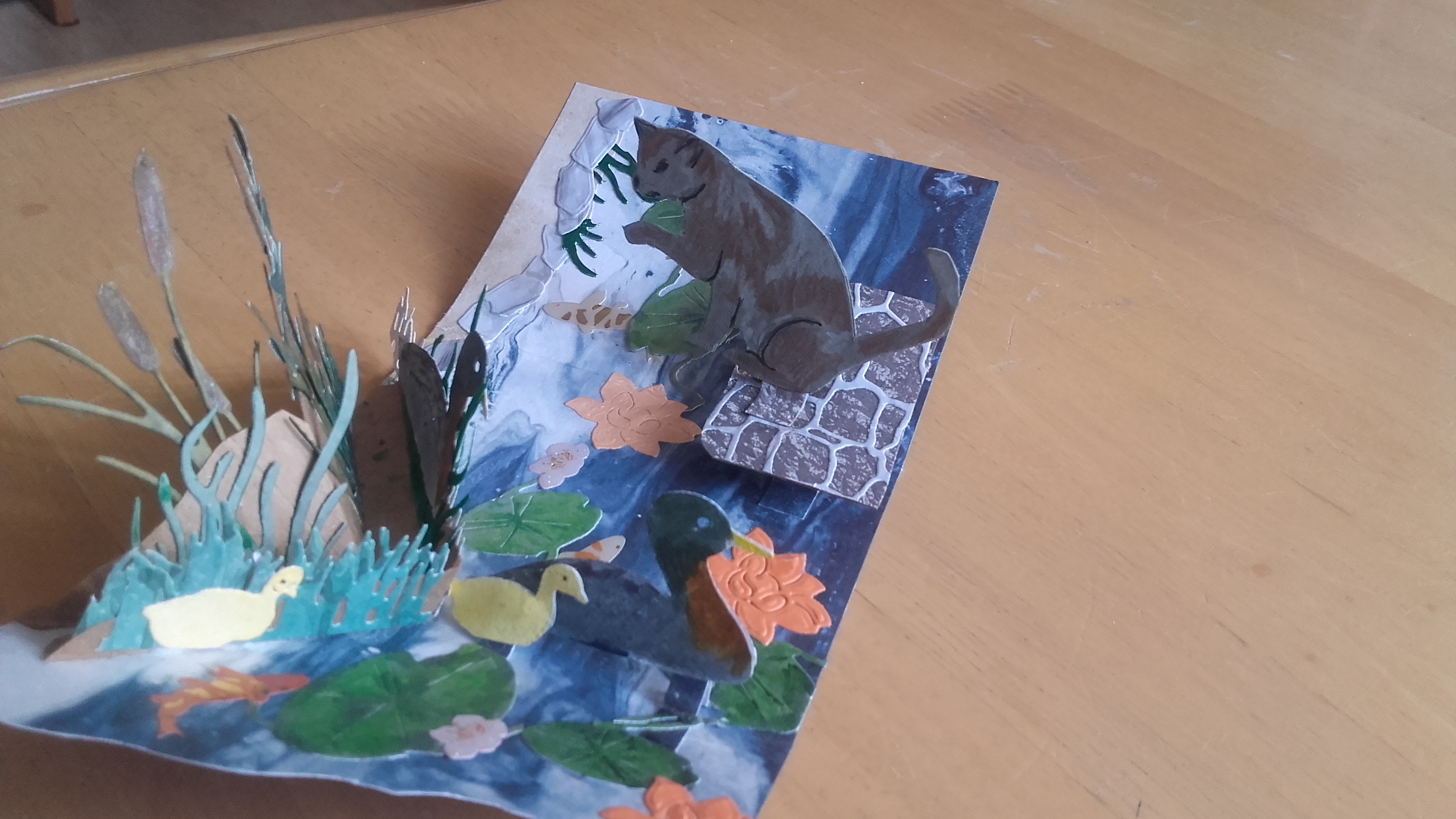 @Glitzermond du darfst auch definitiv stolz sein! Das ist keine einfache Technik und das kleine Zelt ist auf jeden Fall sehr hübsch geworden :) Mit kommt die Karte insgesamt noch ein wenig leer vor durch die großen Flächen, vielleicht ein paar Fische im Wasser oder ein paar Campingsachen? Die kannst du ja problemlos gebastelt einfügen. Durch die komplexe Technik musst du nicht zwingend mehr Pop-Up-Elemente einbringen, was ich mir aber, falls du es versuchen willst sehr gut vorstellen kann: Einen Koffer, eine Kiste, einen Picknickkorb o.a. auf die Grünfläche setzen, den man nochmal separat aufklappen kann (also manuell, mehr direkte Mechanik einzufügen dürfte schwierig sein) da könntest du dann auch noch einmal etwas aufpopen lassen, als Karte in der Karte quasi . Wahrscheinlich etwas friemelig aber den Effekt denke ich mir großartig :) und du könntest es ja im Grunde erstmal separat basteln und nur einfügen, falls es klappt damit der Karte nichts passiert.