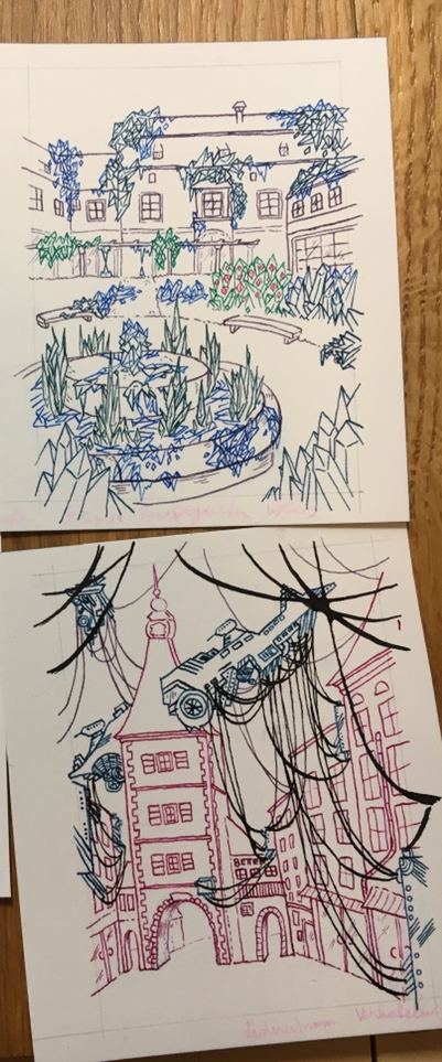 Aufwändige Architektur erfordert tausend kleine Lines, die dann aber im Weg sind, wenn man flächig Farbe verteilen will, um eine bestimmte Lichtstimmung hinzukriegen. Ich sage das als Aquarellfan selten- aber irgendwie vermisse ich gerade mein Graphic Tablet. XD