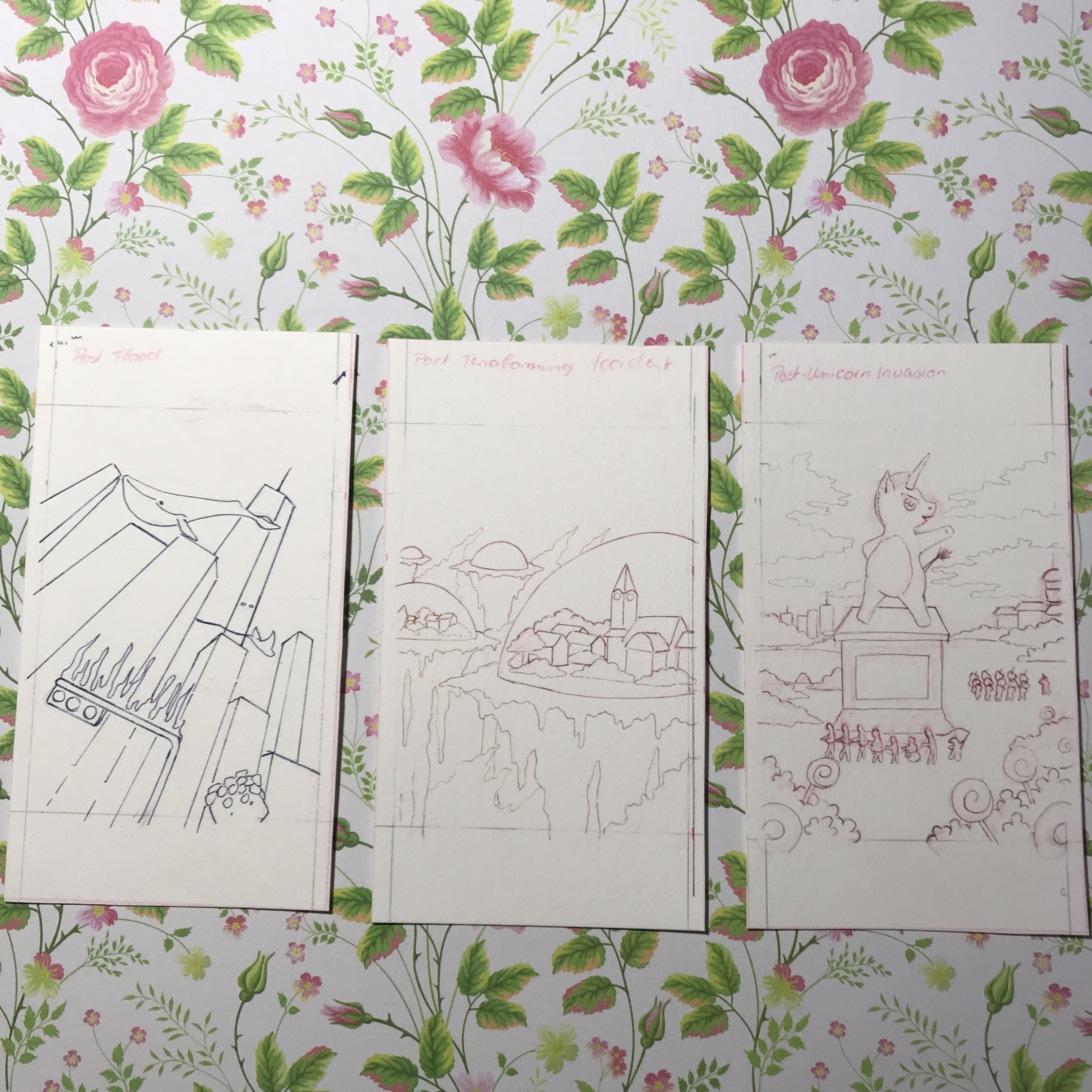 Wir hätten einmal eine große Flut, eine zerstörte Erdoberfläche nach einem von Menschen verursachten Unfall und das schlimmste Szenario ever… Invasion der Pummeleinhörner (das Einhorn soll eine Statue sein)