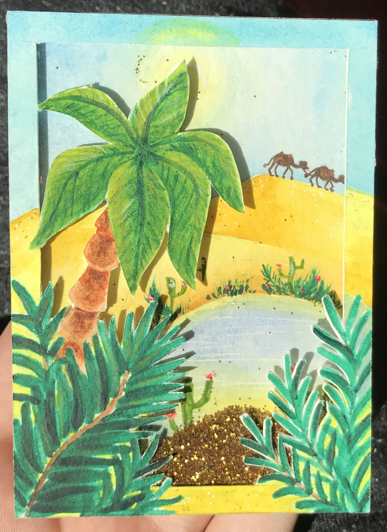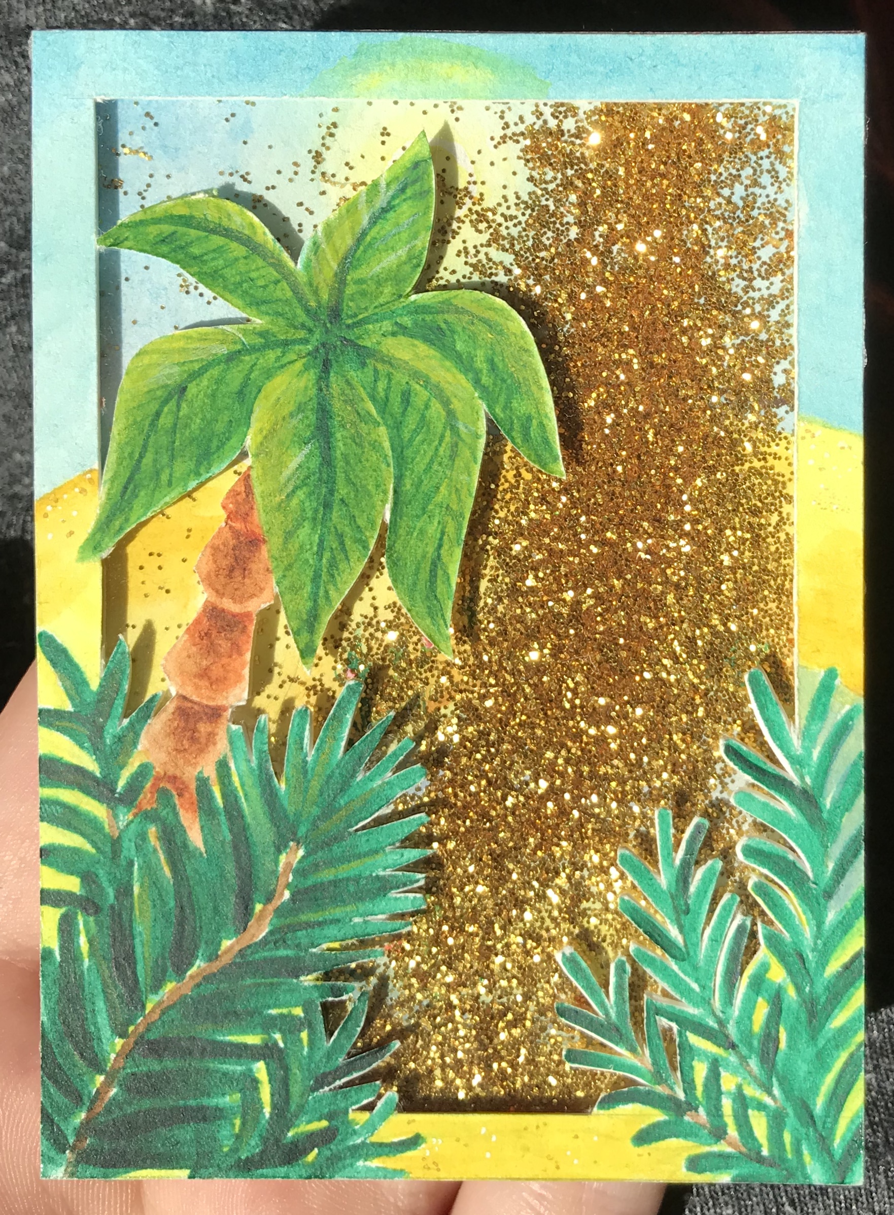Ich nutze doppelseitige klebeband; wenn das Motiv fertig und die Karte bereit ist zum ausschneiden, Decke ich die gesamte Rückseite damit ab, schneide die Aussparung aus und klebe dann die Folie auf. So spart man sich einen Arbeitsschritt und muss nicht mit der Folie rumfrimeln.