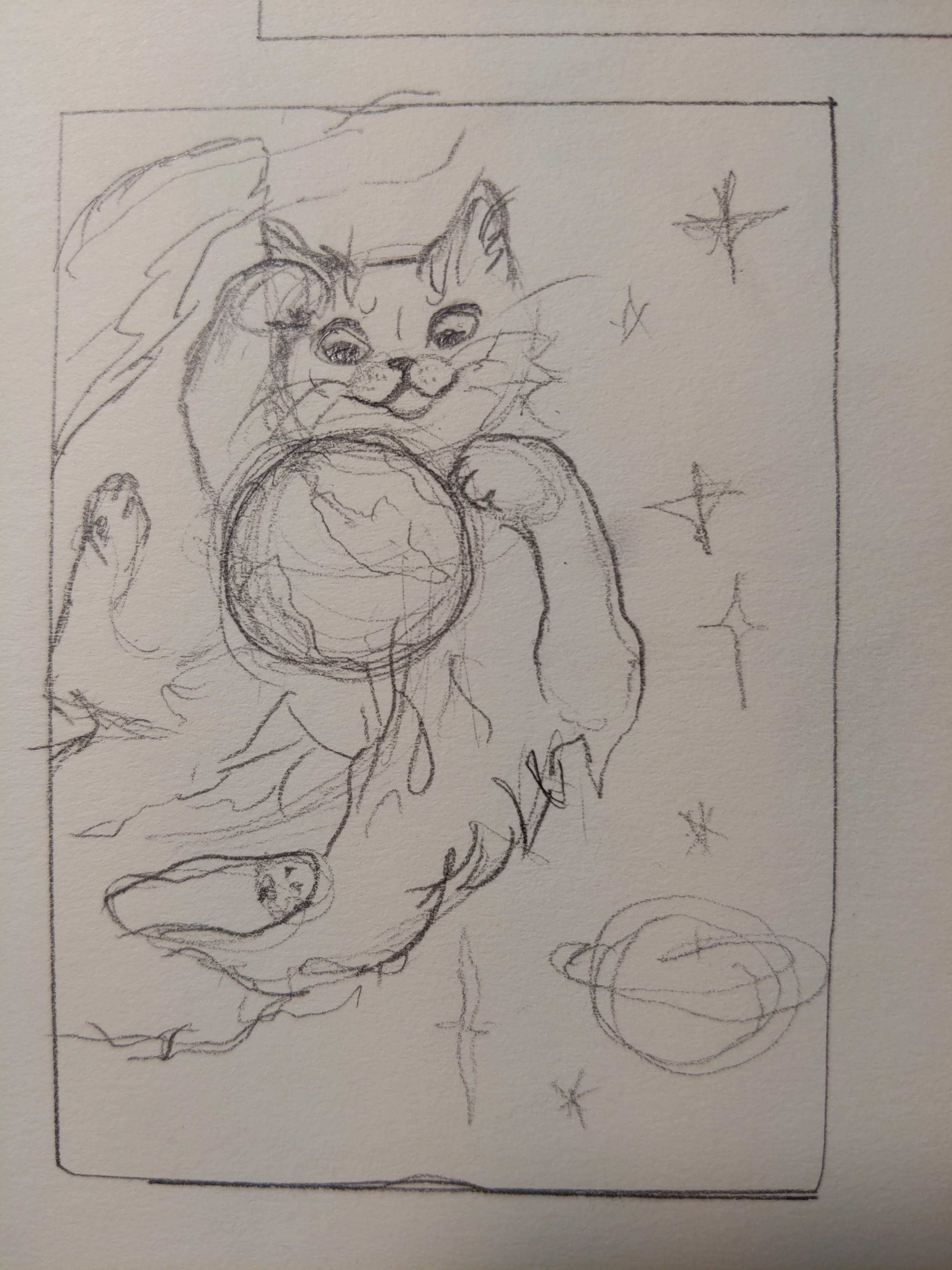Also ich habe schon paar Ideen; z.B. eine “Weltenerschafferkatze” (Meine Vorstellung hierbei ist, dass die Katze den Planet/Stern sozusagen zwischen den Pfoten hat und “Neues kreiert”.) So ungefähr ^^’