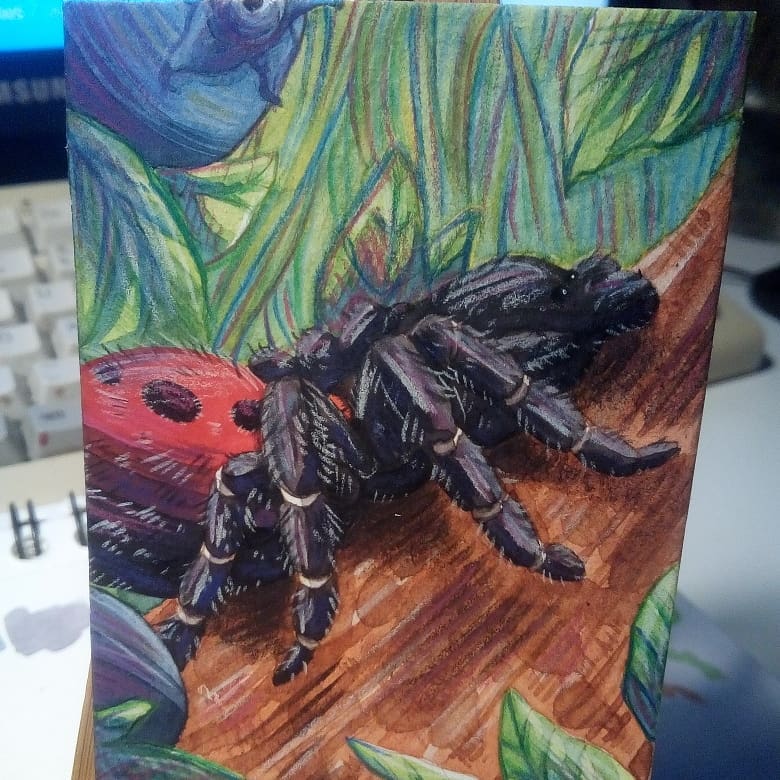 Also ich wollte eigentlich nur mal kurz fragen, was ihr zu der Karte hier sagt. Ich habe Maratus speciosus auf schwarzem Tonkarton gemalt, den Hinterleib mit Perlglanz ĂŒberzogen. Eigentlich mag ich den harten Kontrast zum Schwarz des Papieres, aber gleichzeitig âschwebtâ die Spinne ja schon. Hat jemand von euch vielleicht eine Idee, was man da noch machen könnte oder seid ihr der Meinung, dass ich auf gar keinen Fall mehr daran herumwerkeln soll?