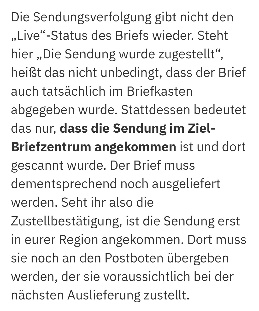 Wobei es wirklich irreführend ist, wenn es auf zugestellt steht, aber deswegen nicht unbedingt schon im Briefkasten sein muss.