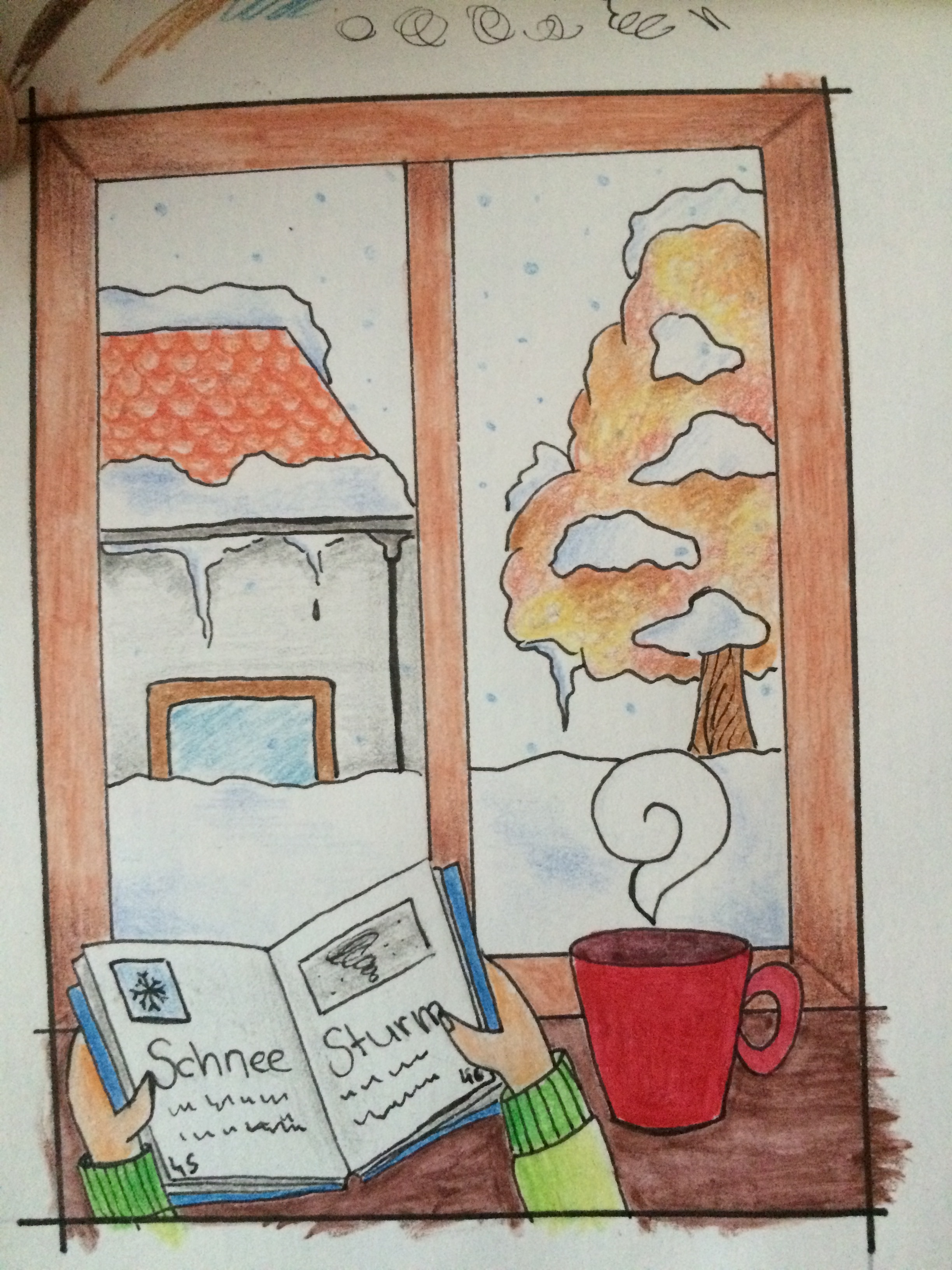 Prinzipiell eine schöne Idee, auch mit dem Blick aus dem Fenster. Du hast das Problem aber selber schon angesprochen: es ist „nach“ einem Schneesturm und wie in der Themenbeschreibung erläutert, sollte bei euren Umsetzungen der Sturm als solcher noch erkennbar sein :) Besser wäre es, wenn man durch das Fenster den noch tobenden Schneesturm sehen könnte.