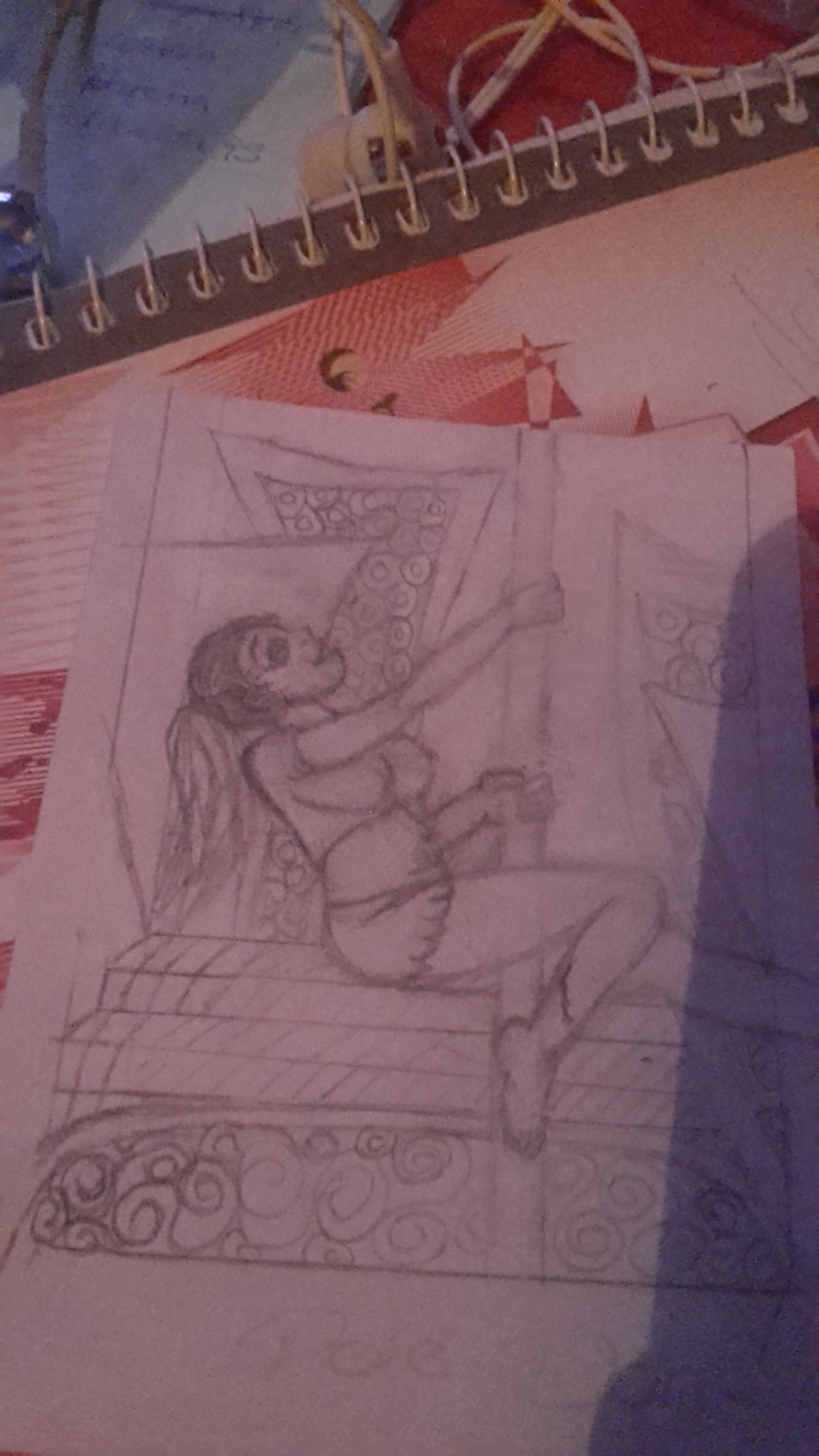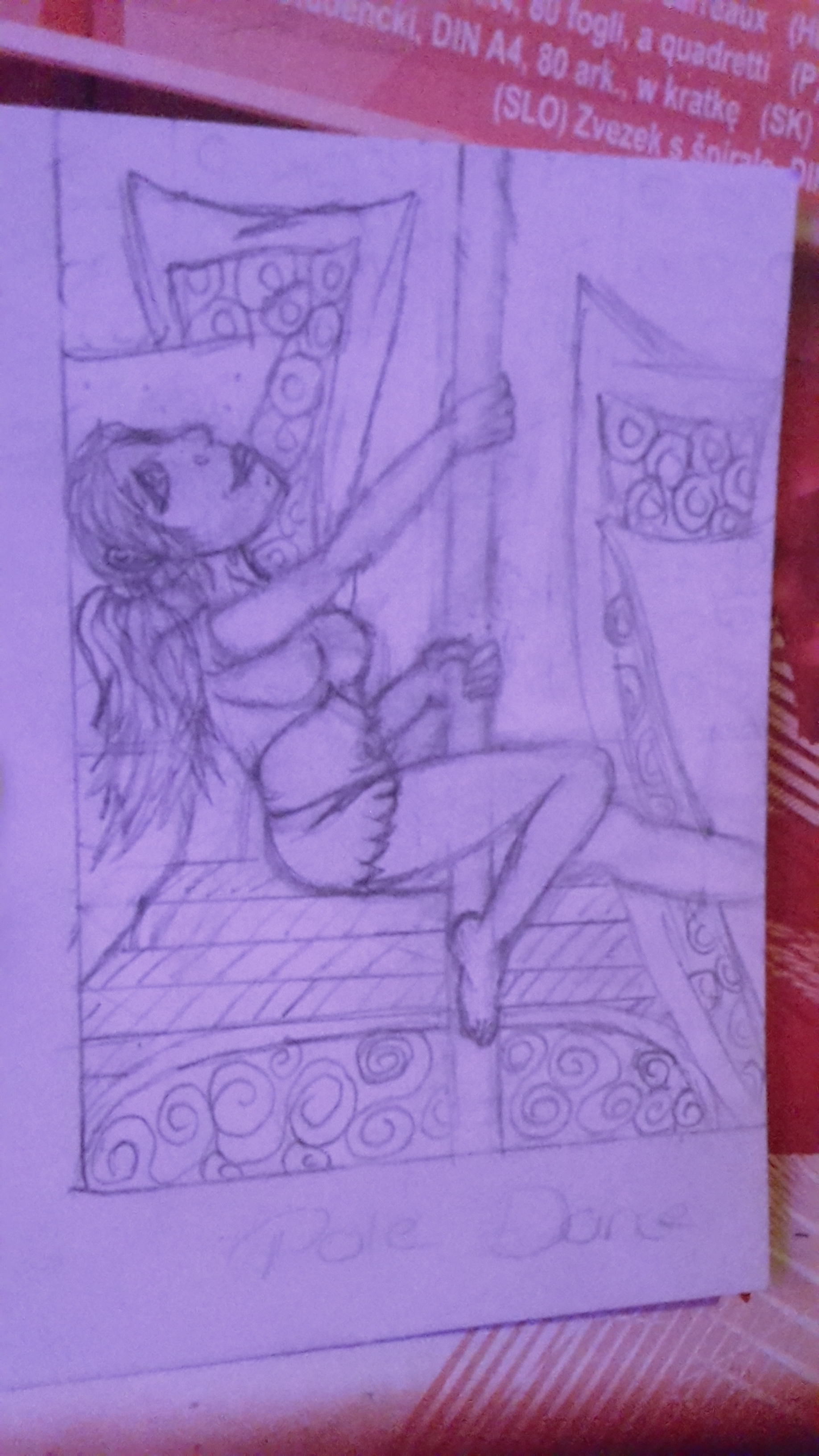 Ich habe deine Pose leicht abgeändert, weil sie für mich nicht ganz schlüssig war (die Beine haben auf mich so gewirkt, als wolle sie posieren, während der Oberkörper eher so wirkt, als wolle sie sich auf die Stange zu oder an der Stange hinauf ziehen. Ich habe die Version mit einer Pose genommen, weil ich mich nicht gut genug mit Pole Dance auskenne um die Bewegeung hinzukriegen). Du musst das natürlich nicht so übernehmen, es war nur für mich so sinniger beim zeichnen.