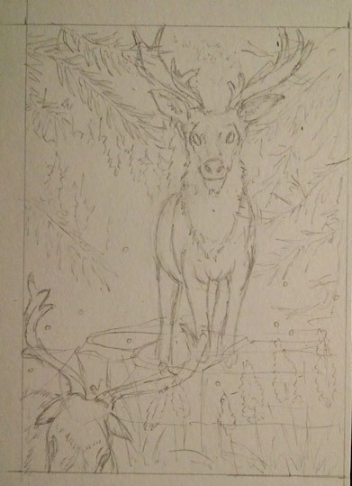 Ansonsten hätte ich hier meine Zeichnung für die zweite Karte Kat. Spielszenen mit Hircine als Geisterhirsch. Ich werde wahrscheinlich ohne Lines arbeiten, da das sonst die geisterhafte Erscheinung zerstören könnte.