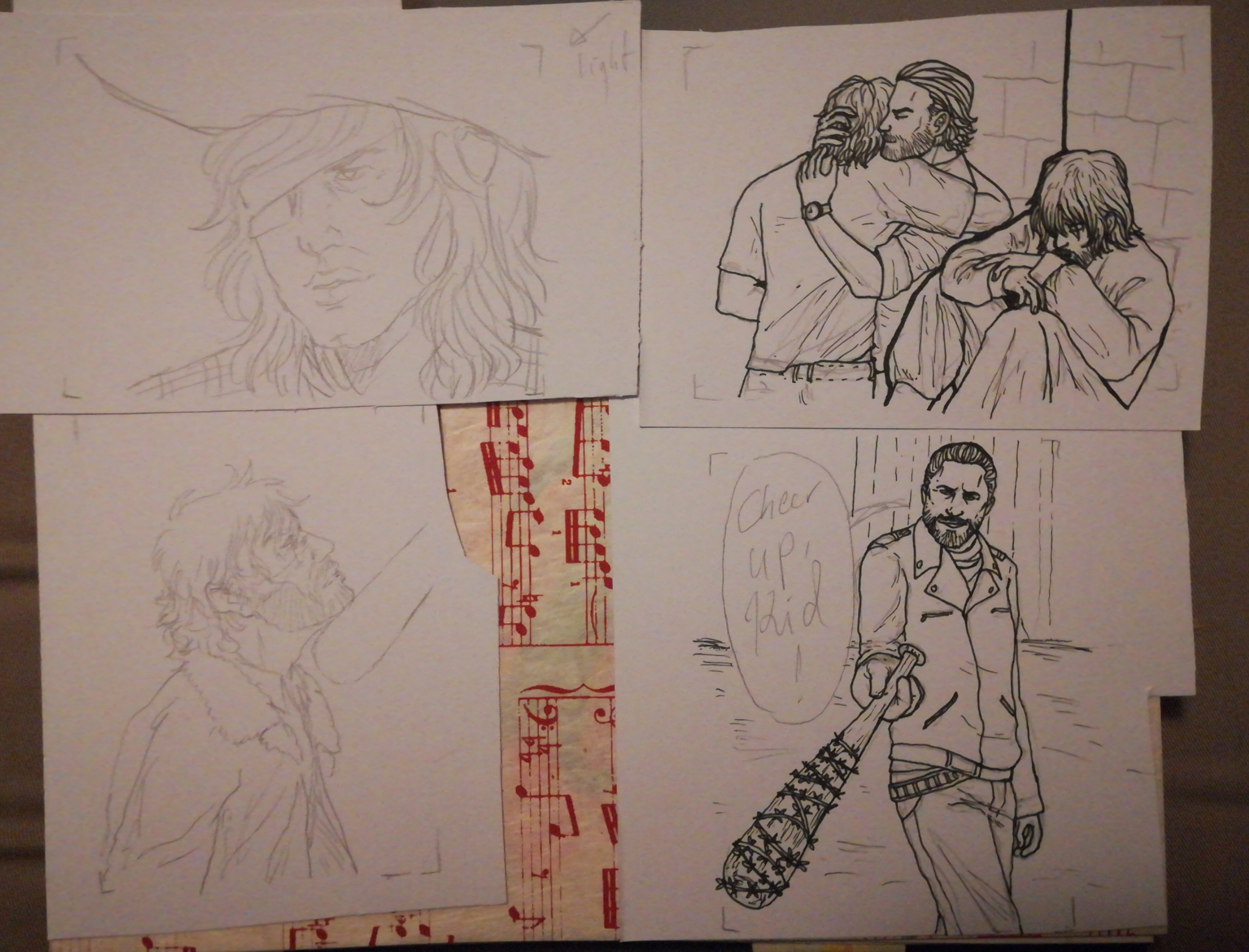 Ich muss mich zwischen Rick, Negan, Carl, Dwight und Daryl entscheiden für meine Karten und hab schon mal die erste Idee die mir in den Sinn kam festgehalten. Ich finde es immer schwer auf so kleinem Format mehr als zwei Leute unterzubringen. ><