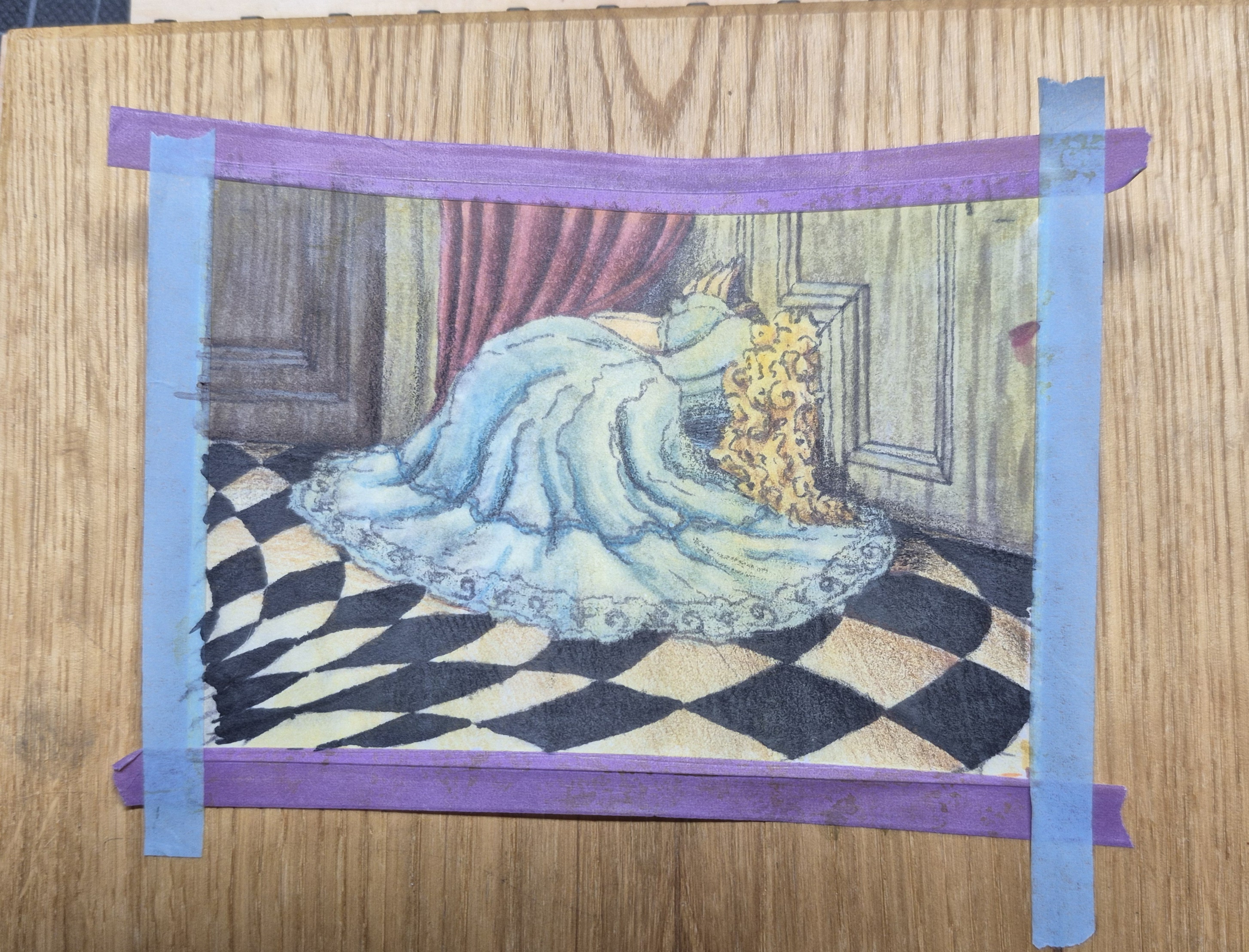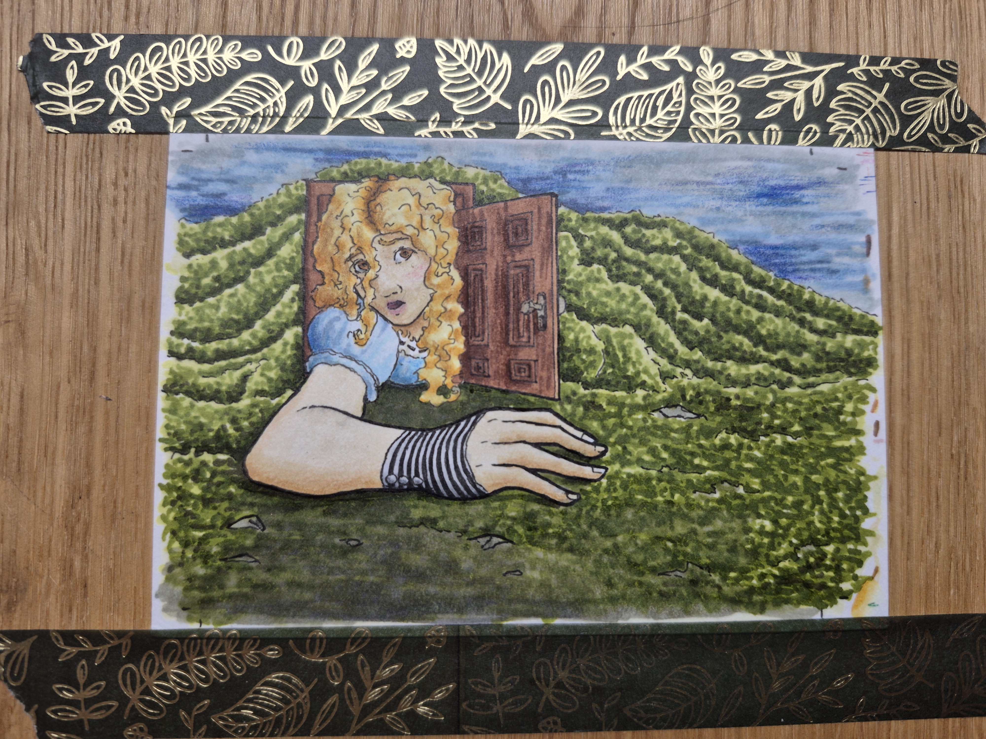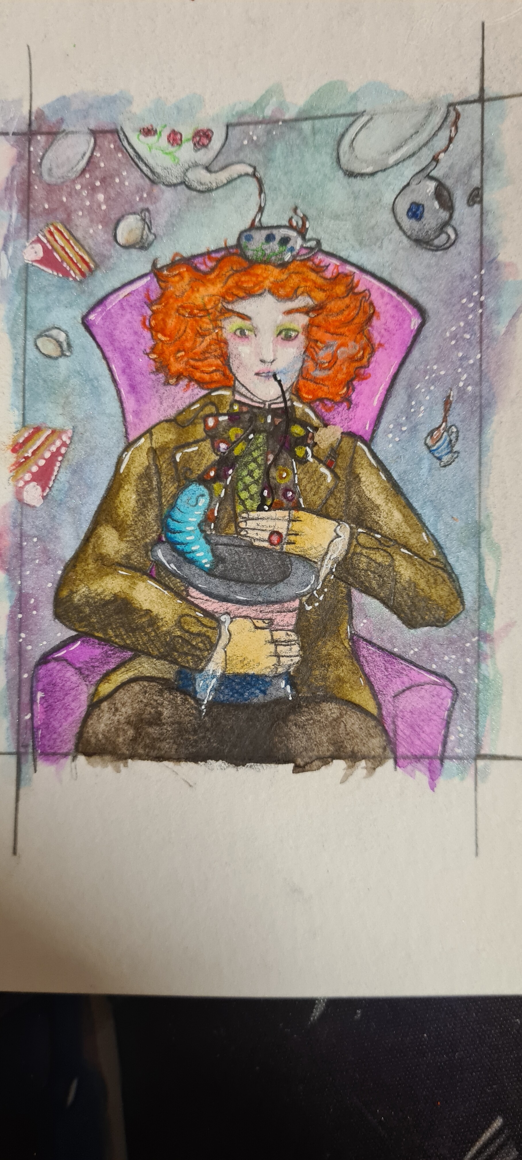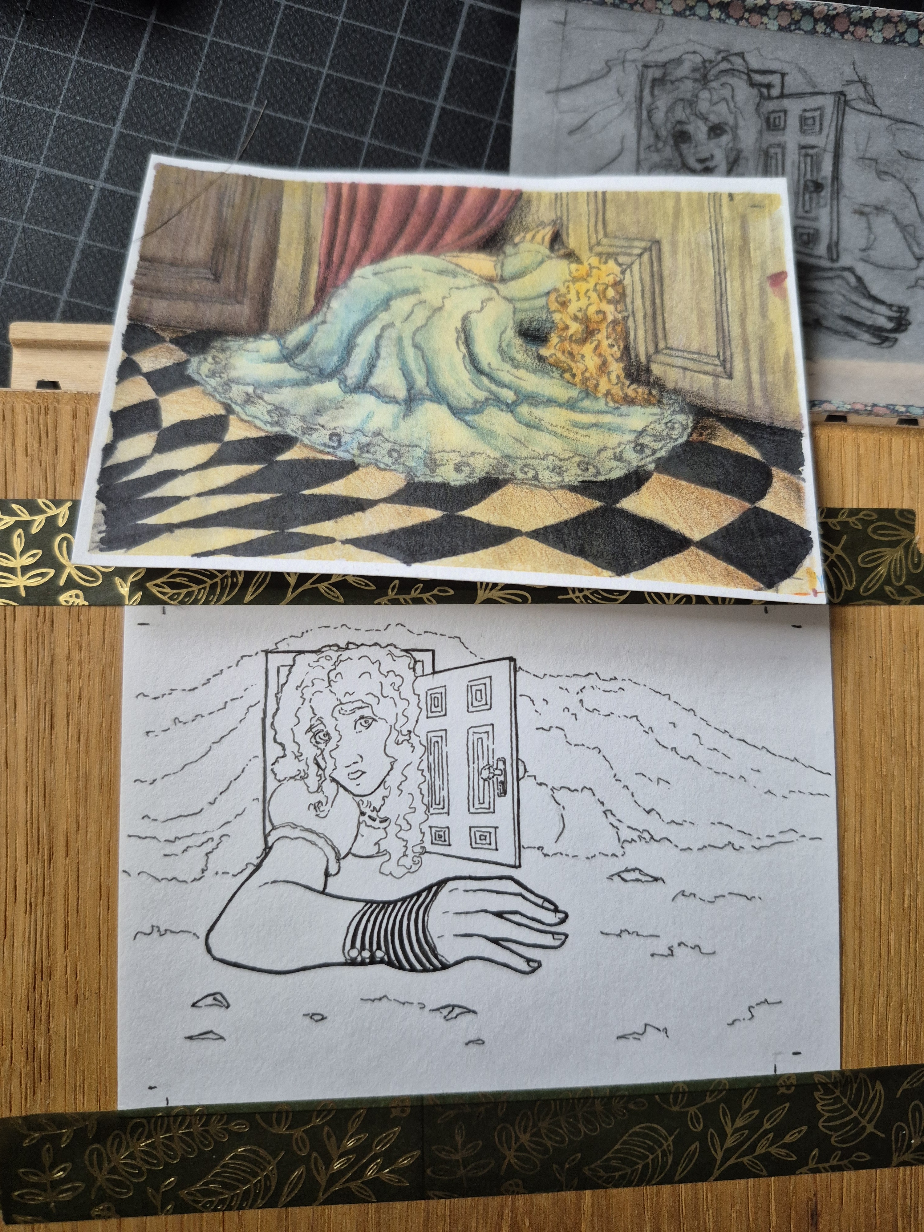 Ich hab m7ch endlich aufraffen können, die Alice-Karte anzugehen. Natürlich hab ich einen neuen Stift ausprobiert… er stellte sich leider als nicht wasserfest heraus 🥲, aber ich denke, die blassen Lines sind eigentlich ganz nice für die dämmrig beleuchtete Eingangshalle. Hab da jetzt Aquarell, Copic und Buntstift verwendet.