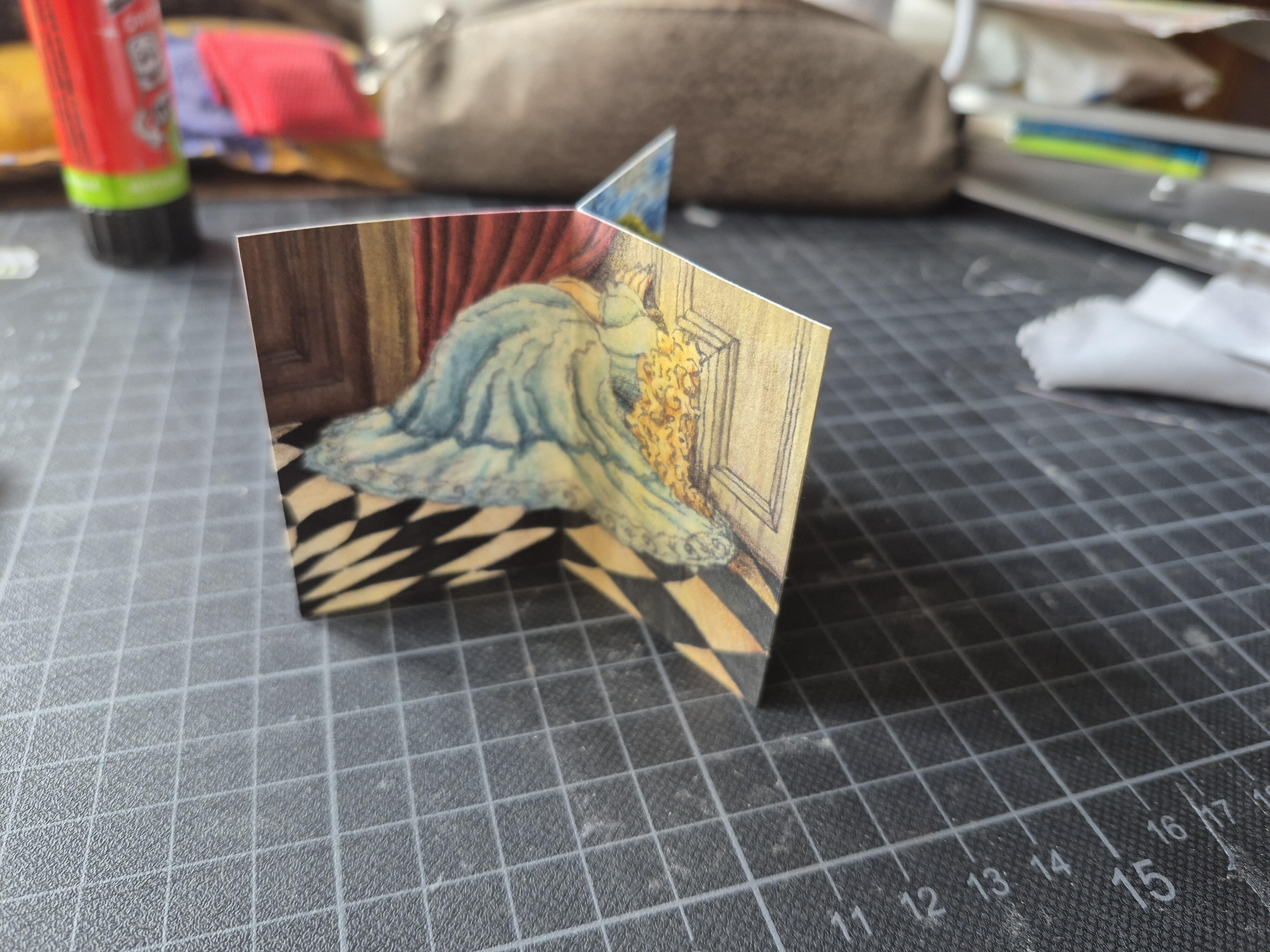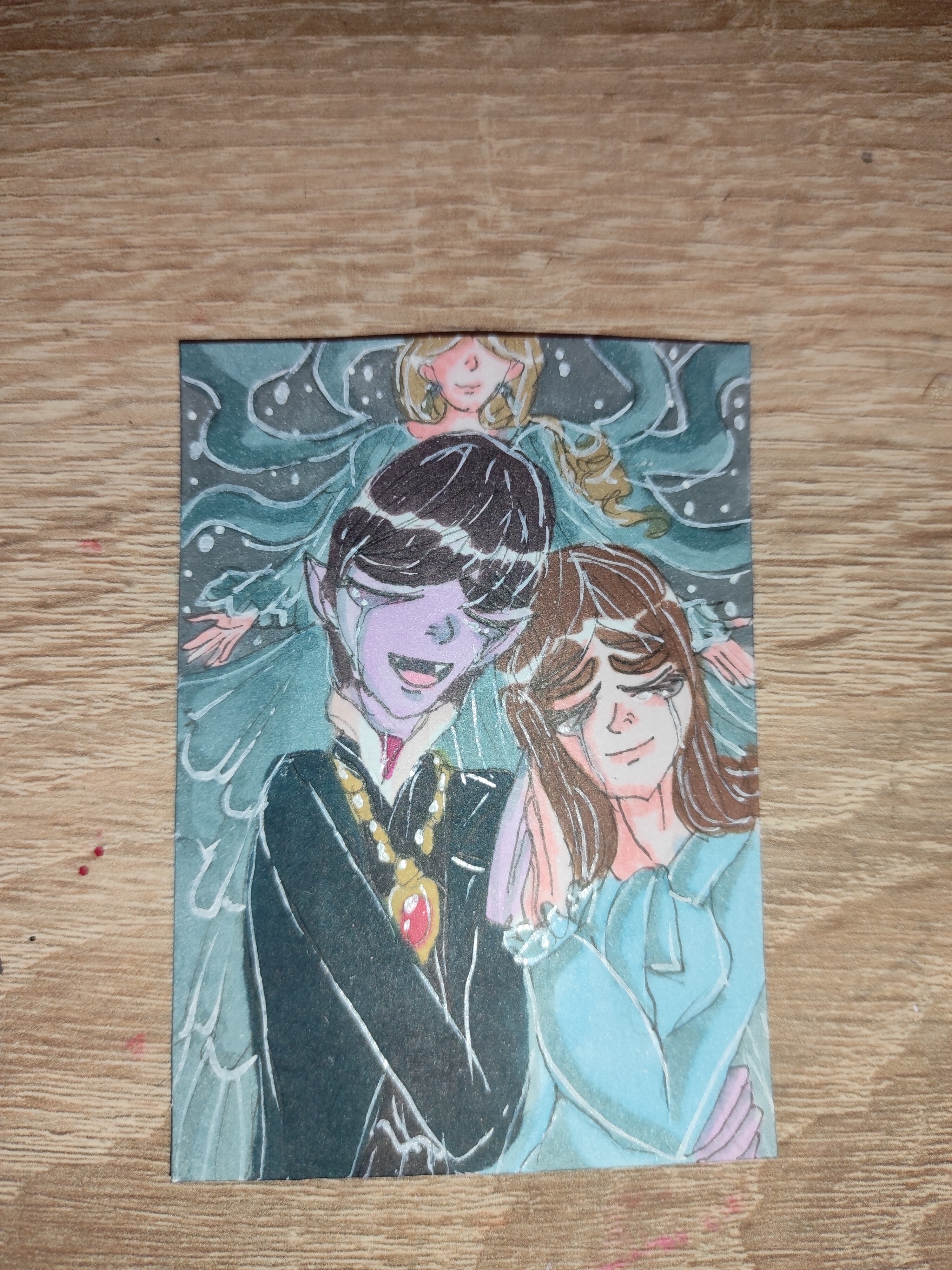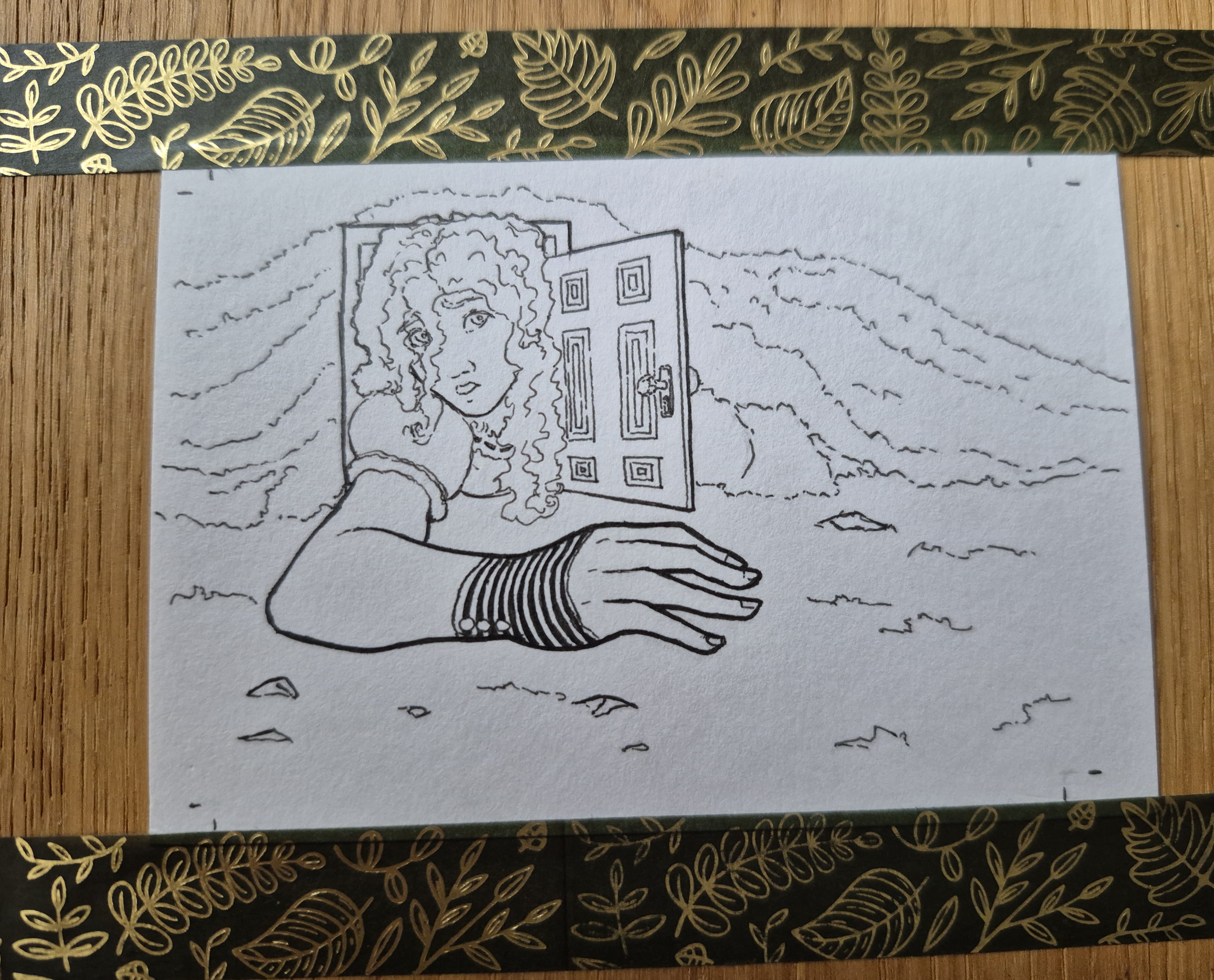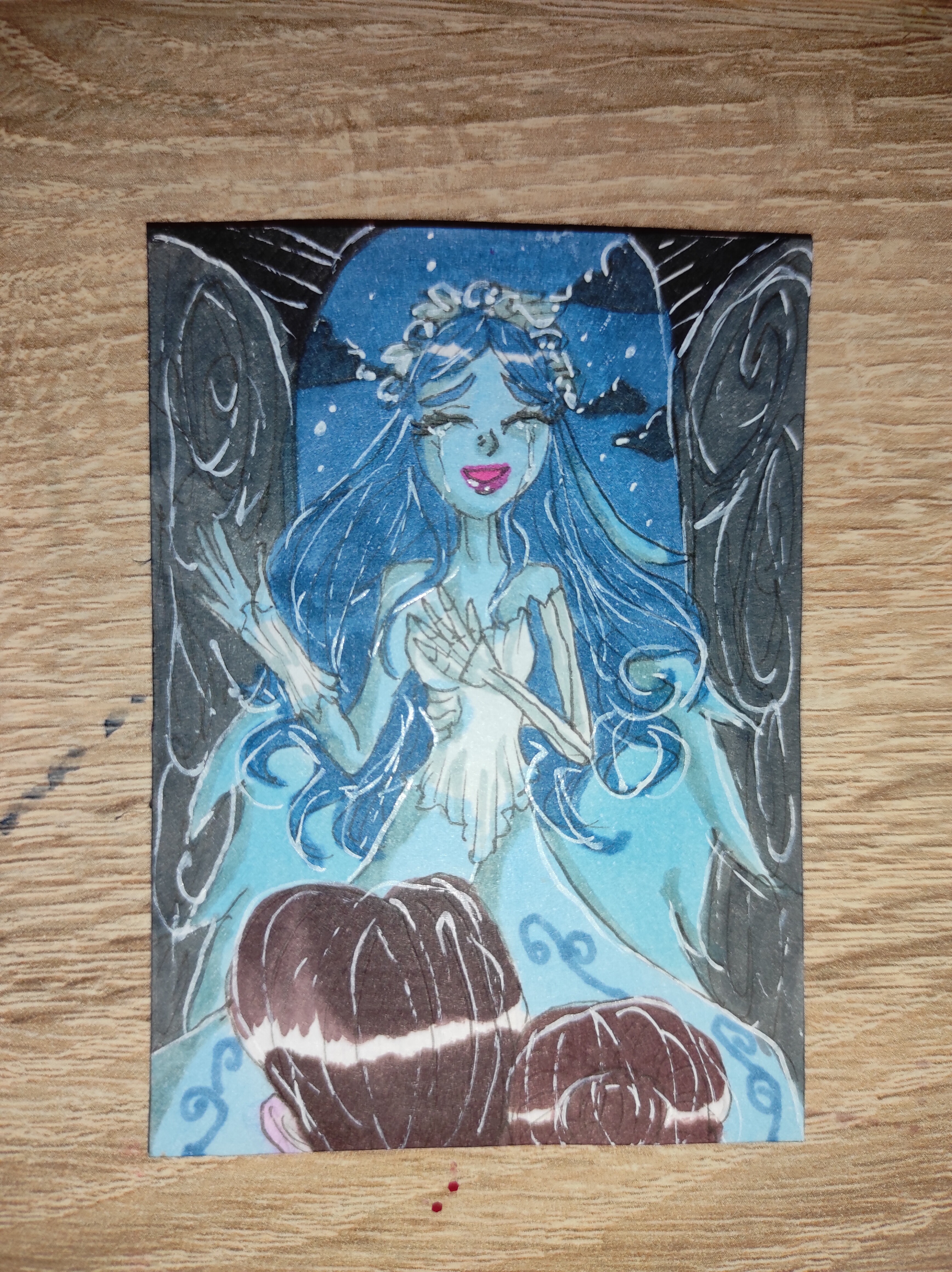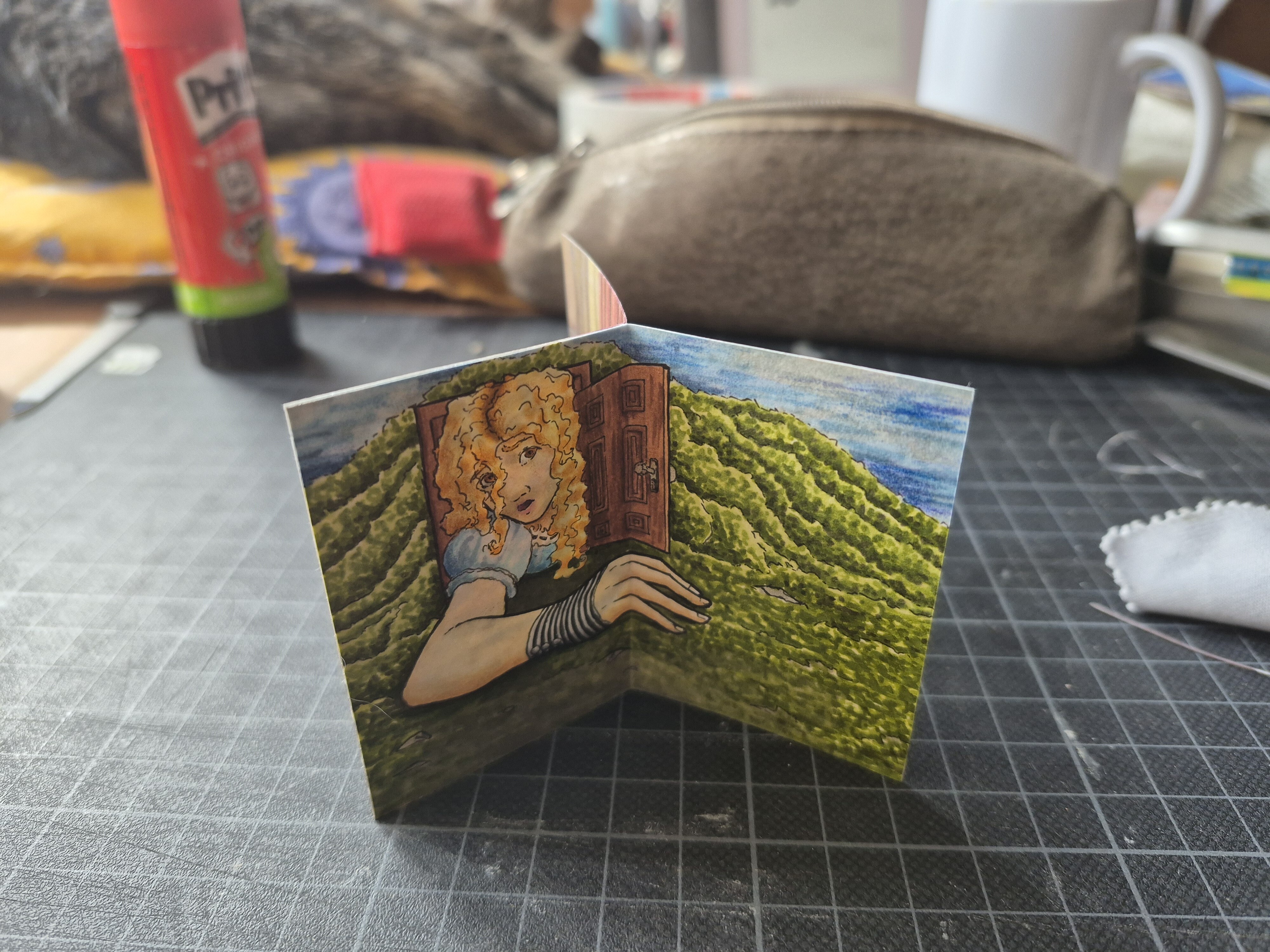 Ich hab m7ch endlich aufraffen können, die Alice-Karte anzugehen. Natürlich hab ich einen neuen Stift ausprobiert… er stellte sich leider als nicht wasserfest heraus 🥲, aber ich denke, die blassen Lines sind eigentlich ganz nice für die dämmrig beleuchtete Eingangshalle. Hab da jetzt Aquarell, Copic und Buntstift verwendet.
