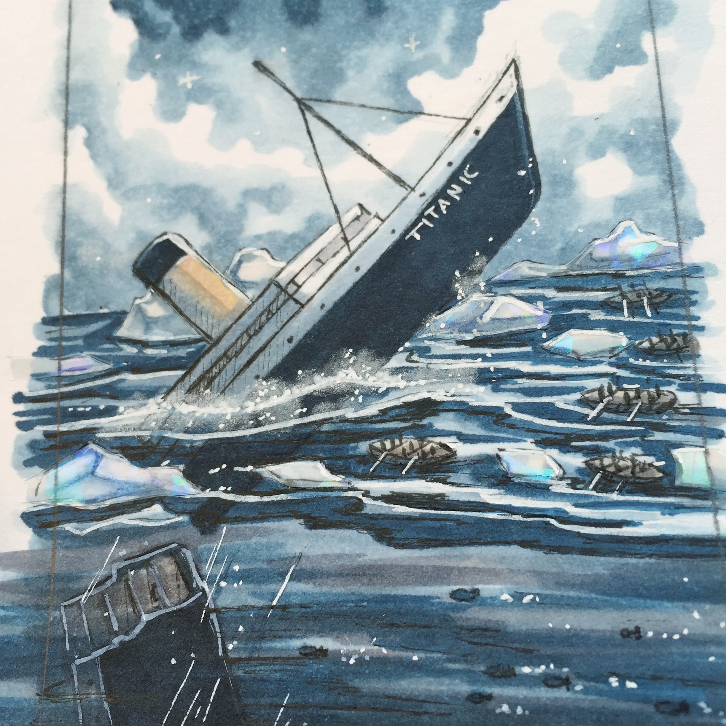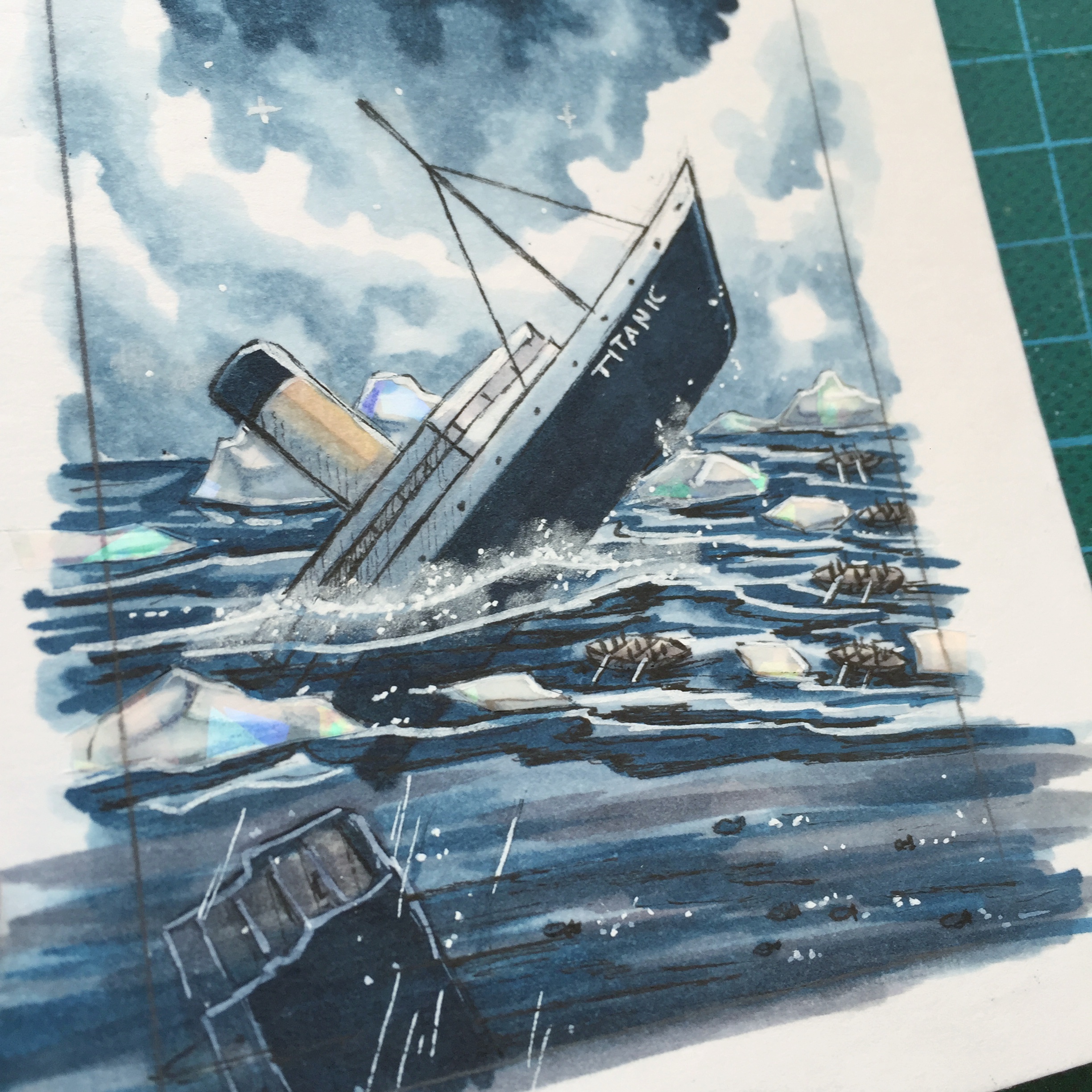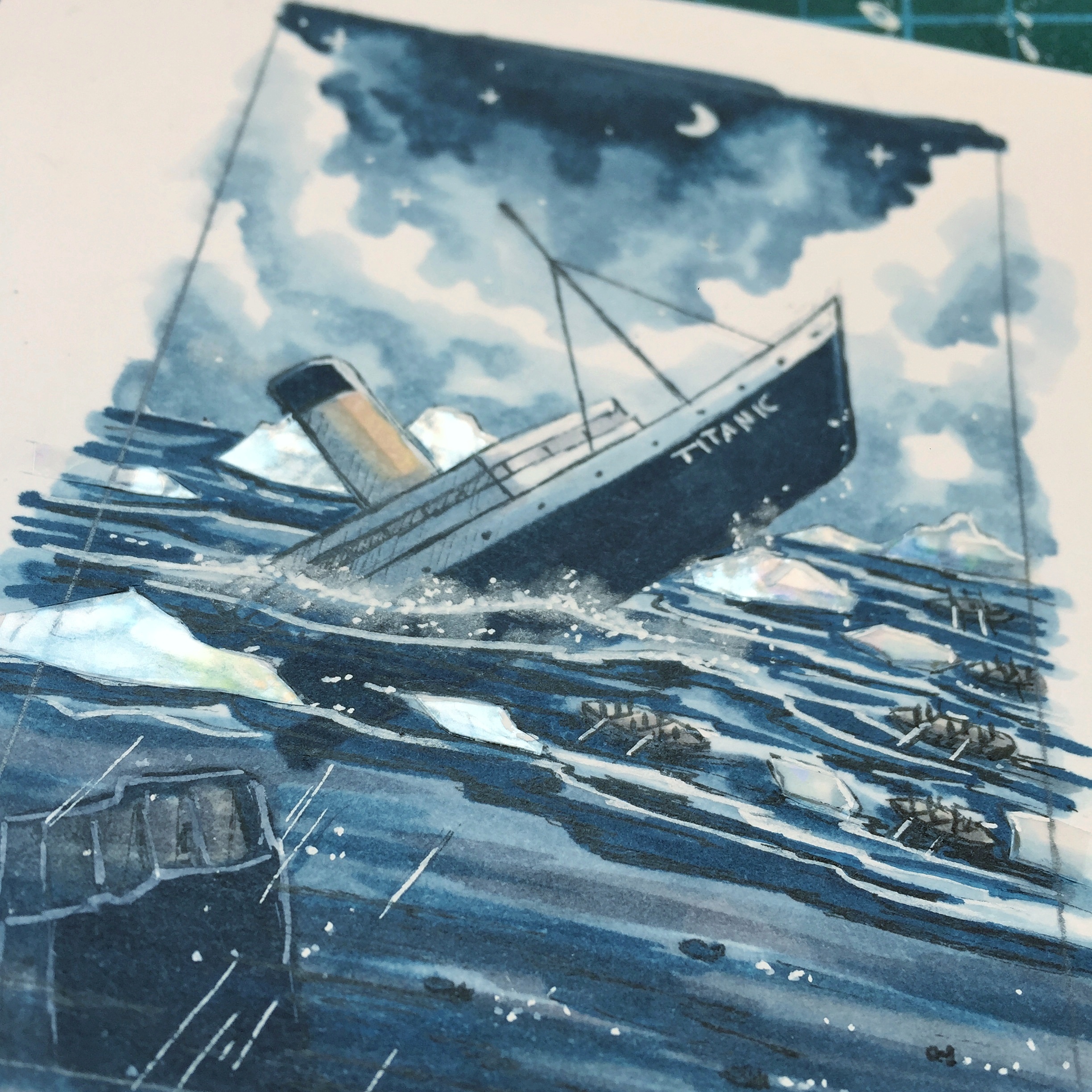 Erste Karte steht auch bei mir. Die meisten Bilder bei Google zeigen, dass während des sinkens der Titanic noch Strom im Schiff war aus diesem Grund ist die Titanic hier beleuchtet