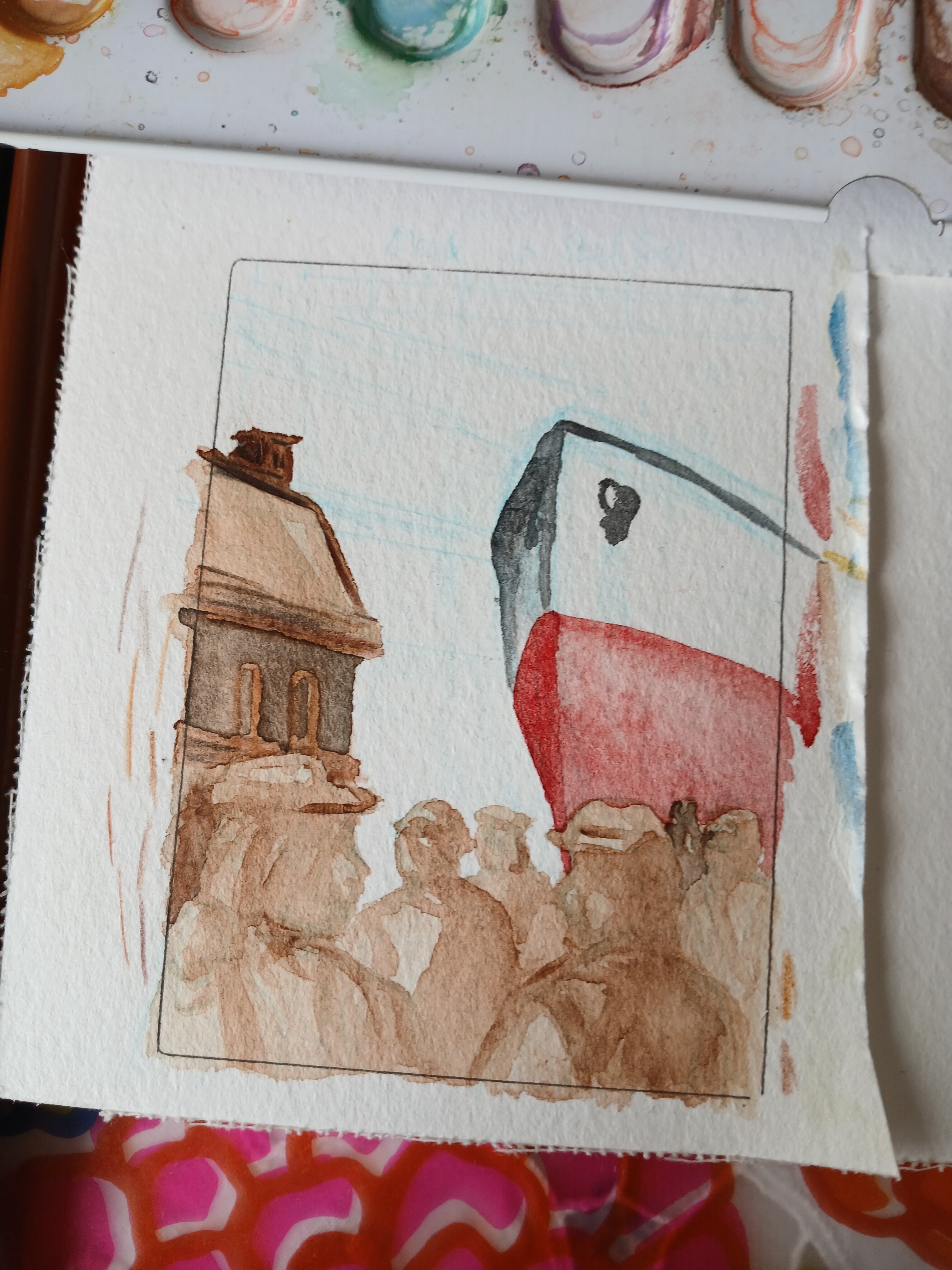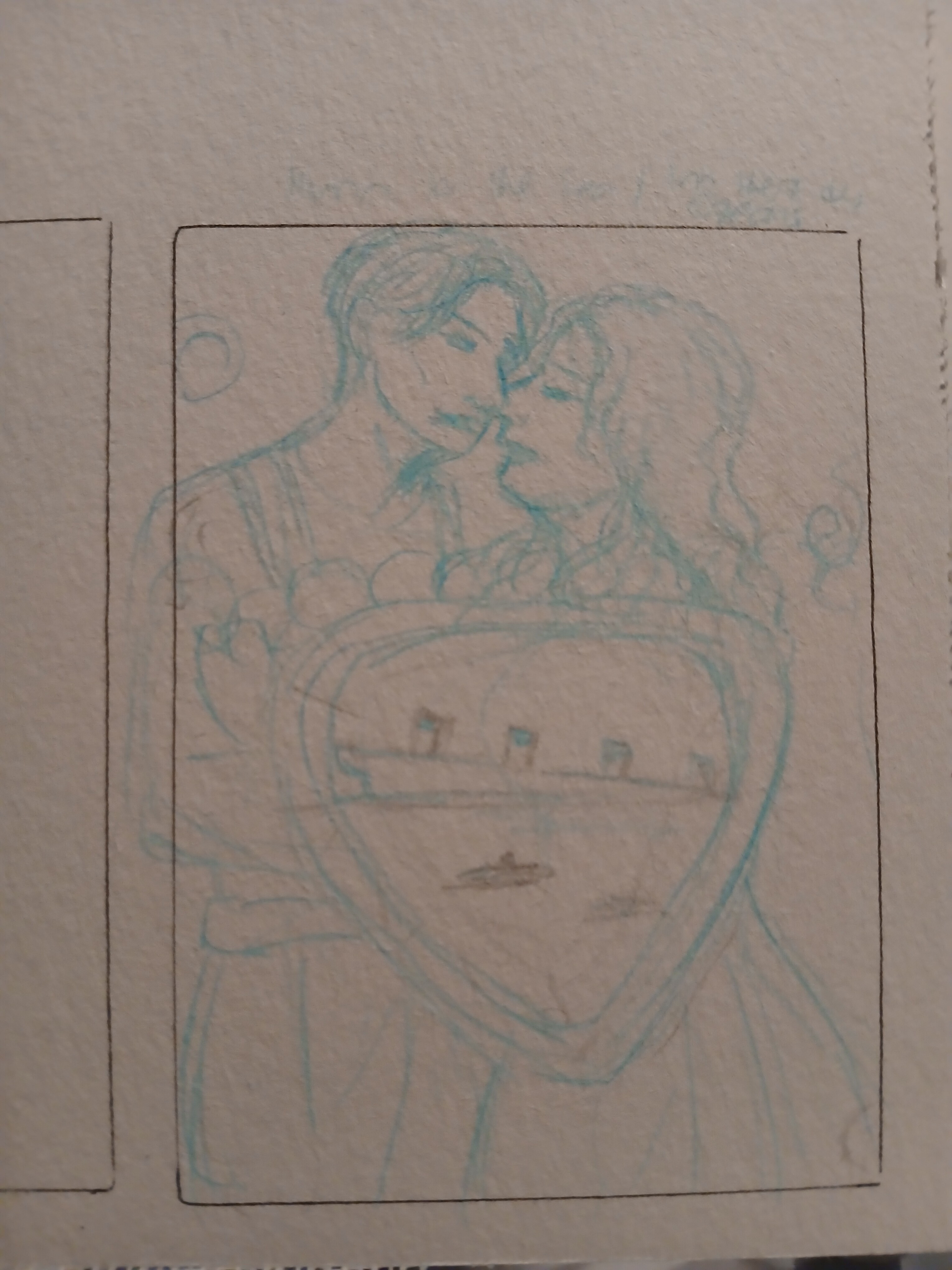 Im Vordergrund das Herz mit sinkendem Schiff darin, im Hintergrund Jack und Rose, die ich in einem Farbton belassen will, damit such das Herz abhebt.