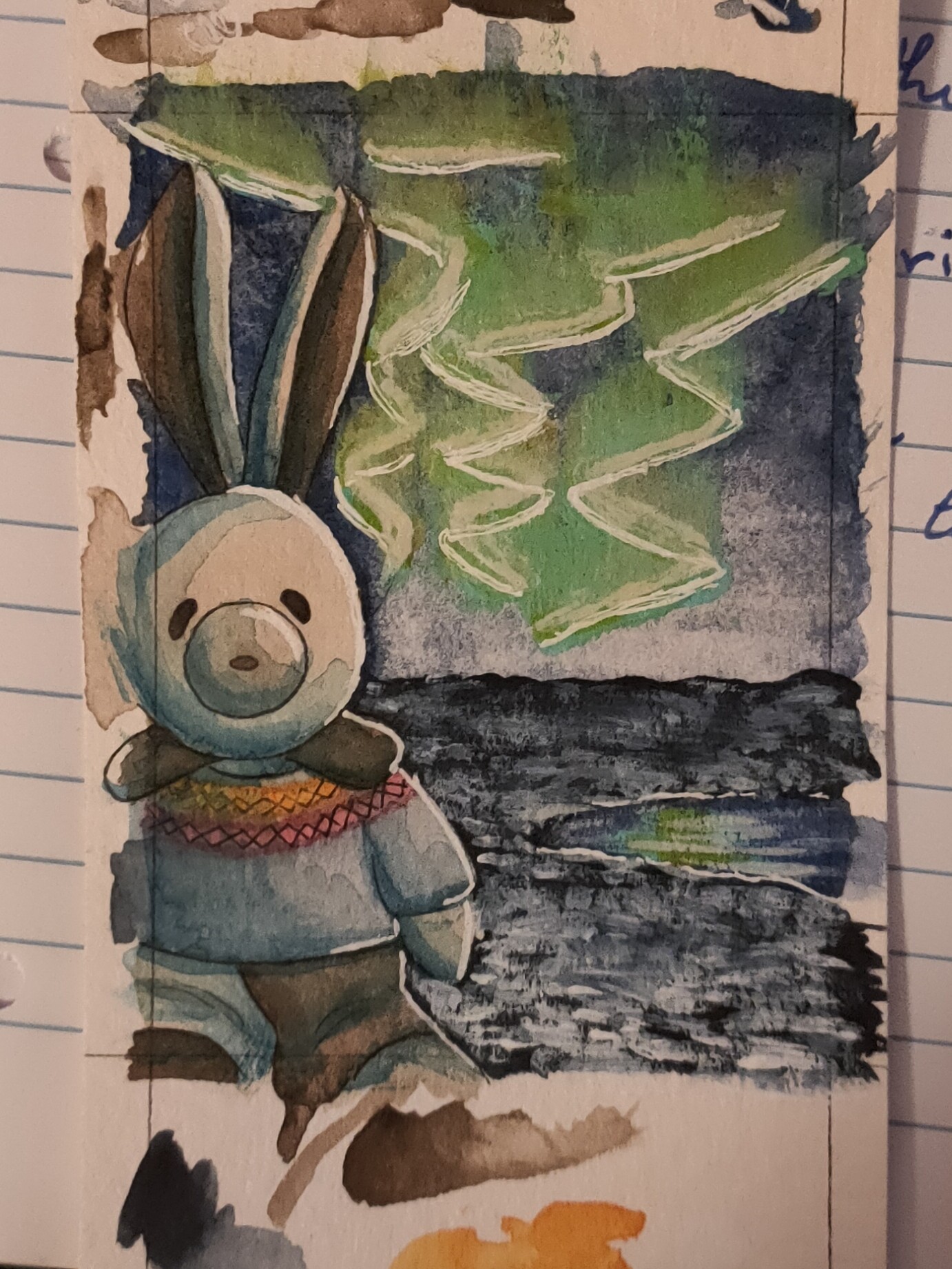 Huhu, das hier wäre meine 3. Karte wenn so zugelassen. Hasi in Island mit Nordlichtern und typischen Islandpullover. Sie ist noch nicht ganz fertig, aber heute schaff ich nicht mehr. Ich bin so müde, ich könnte im Stehen einschlafen…