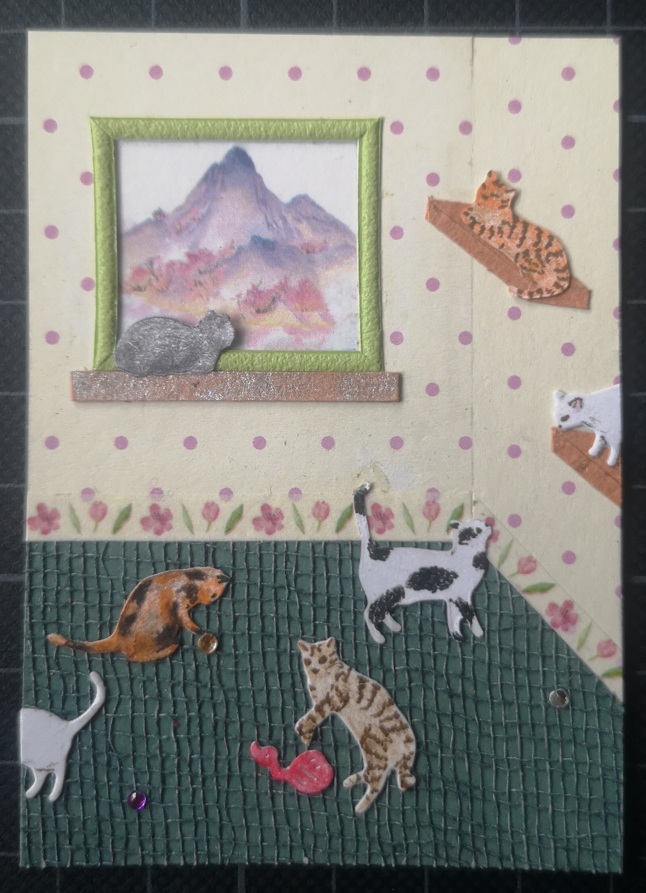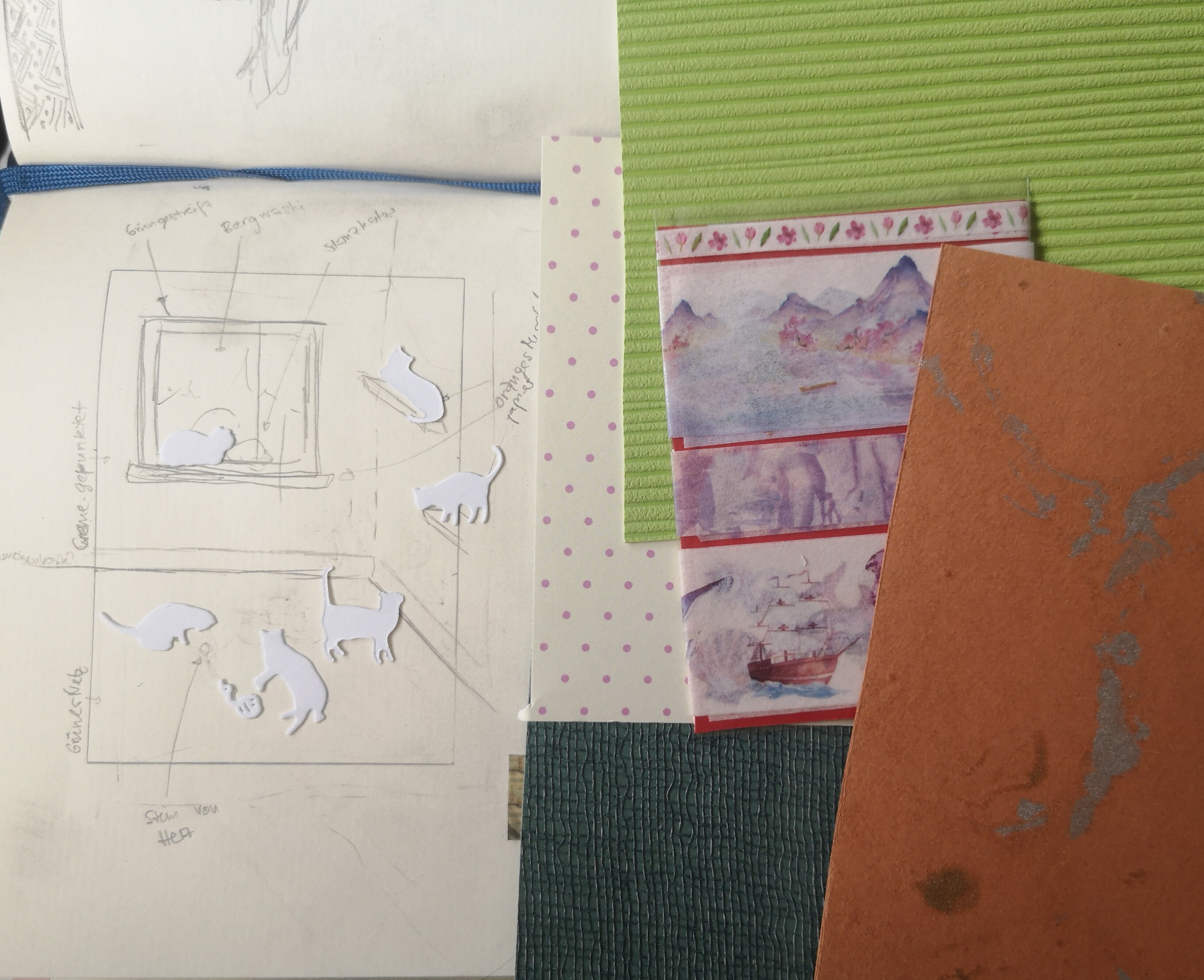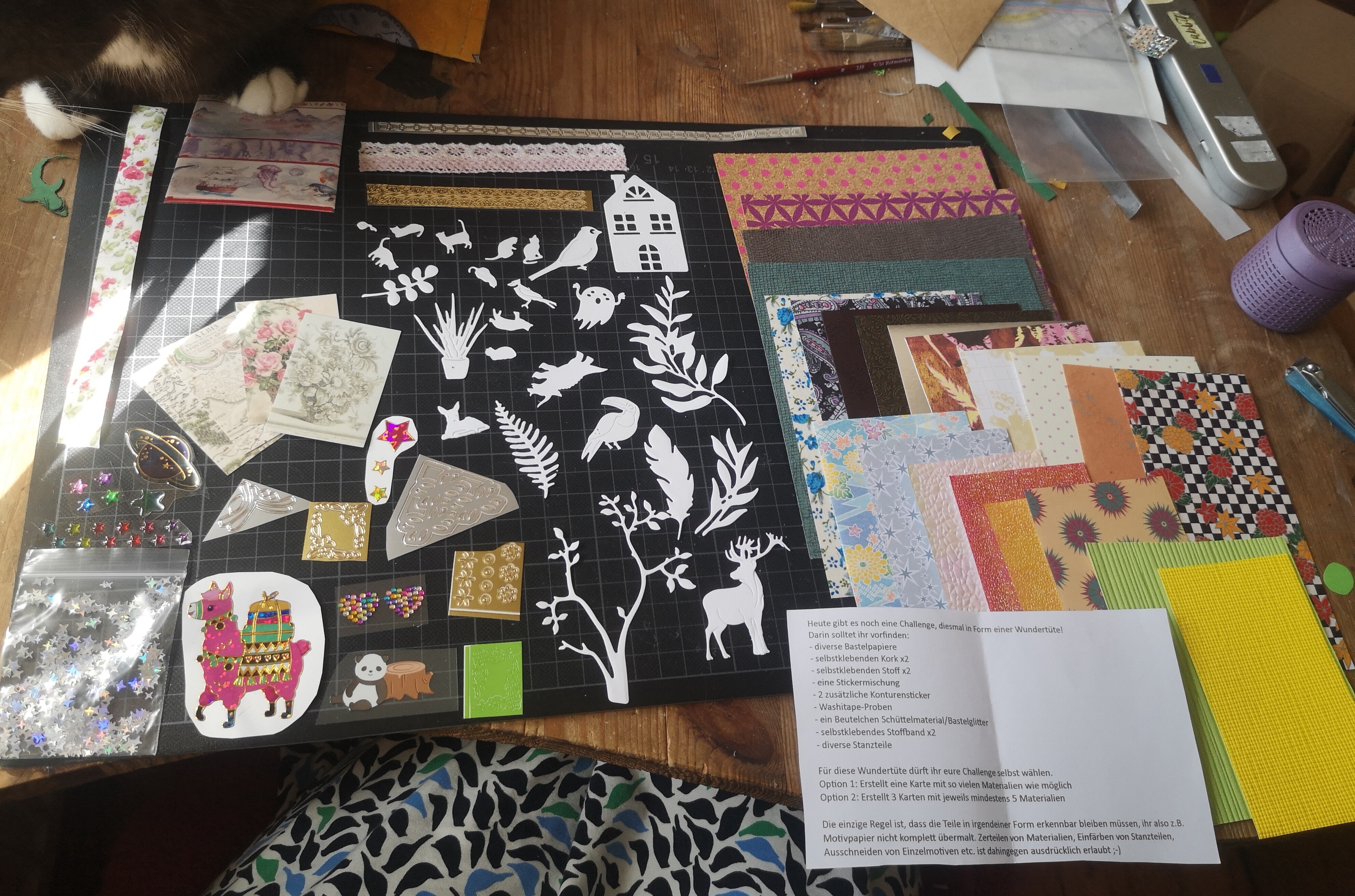 Wäre eine Katzenpension in den Bergen. Insgesamt würden die sechs nebendran gelegten Materialien mit sieben Stanzteilen und einem partiellen Sticker verwendet werden. Das wãren dann vierzehn verwendete Teile. Zumindest ist das meine erste Idee. Ich bin mit den vielen bunt gemusterten Sachen etwas überfordert xD