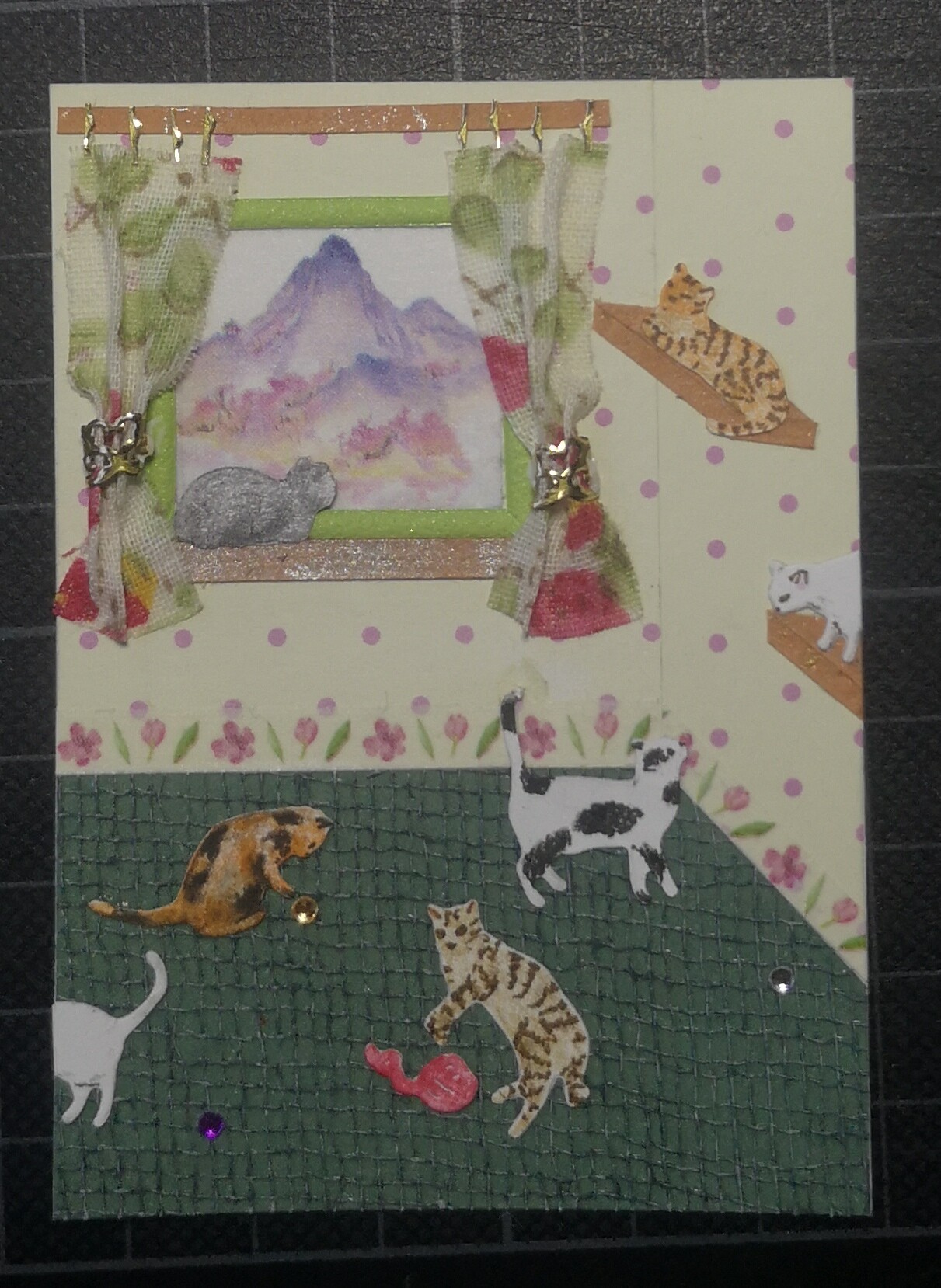 Die Karte sieht jetzt mit den Vorhängen wirklich viel besser aus, ich finde es echt schön, wie sie die anderen Farben der Karte nochmal aufgreifen. Finde es auch sehr cool, wie du die Struktur der grünen Tapete für den Fensterrahmen genutzt hast.