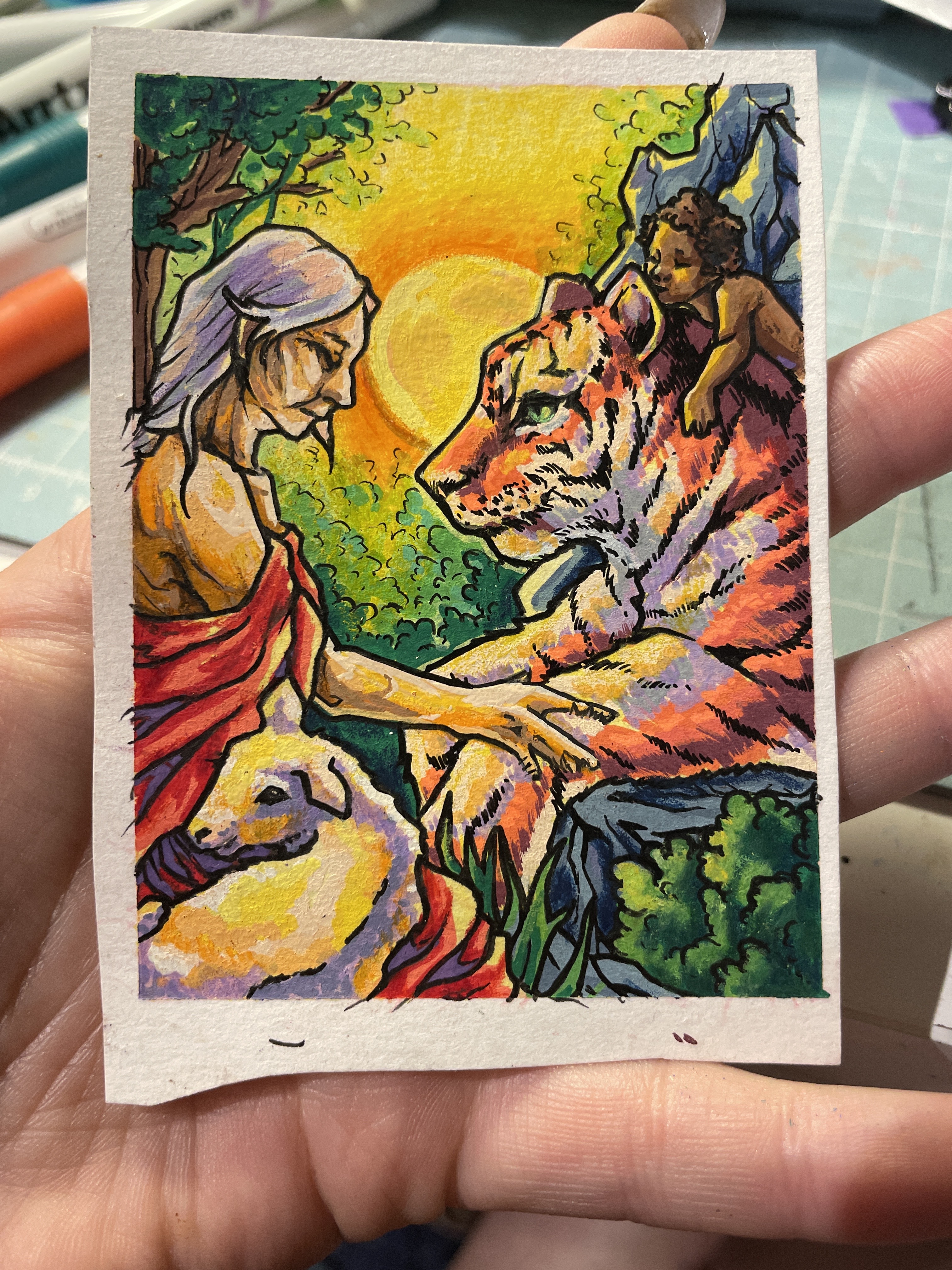 Für die unifarbenere Karte denk ich gerade über ein Einhorn auf einer Lichtung nach. Herausforderung hier wären ja das Farbreduzierte Arbeiten, aber auch Tiefgang in der Landschaft so wie definitiv Pferd.