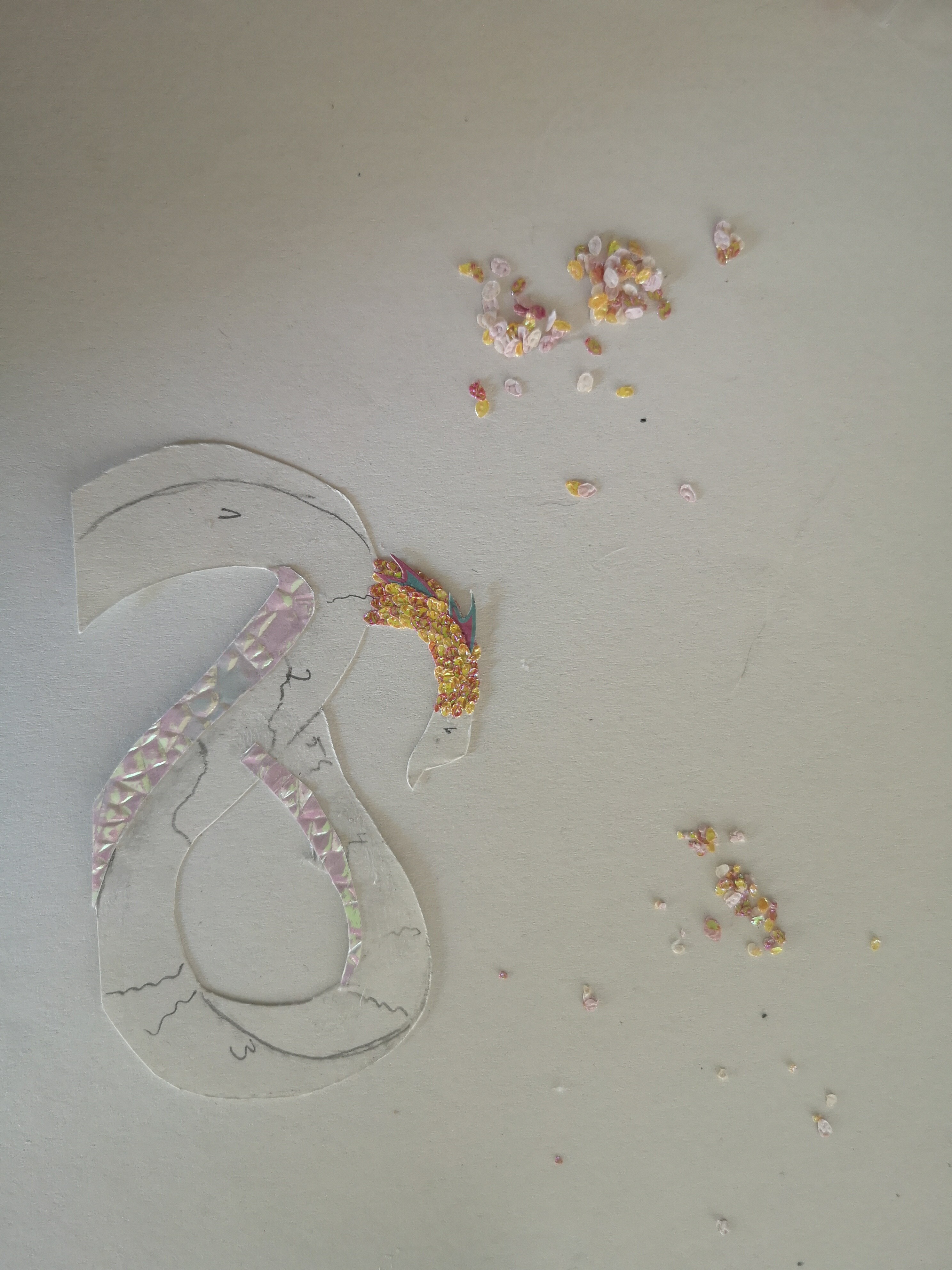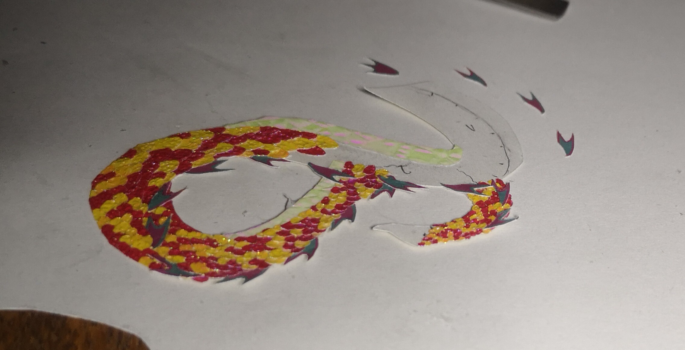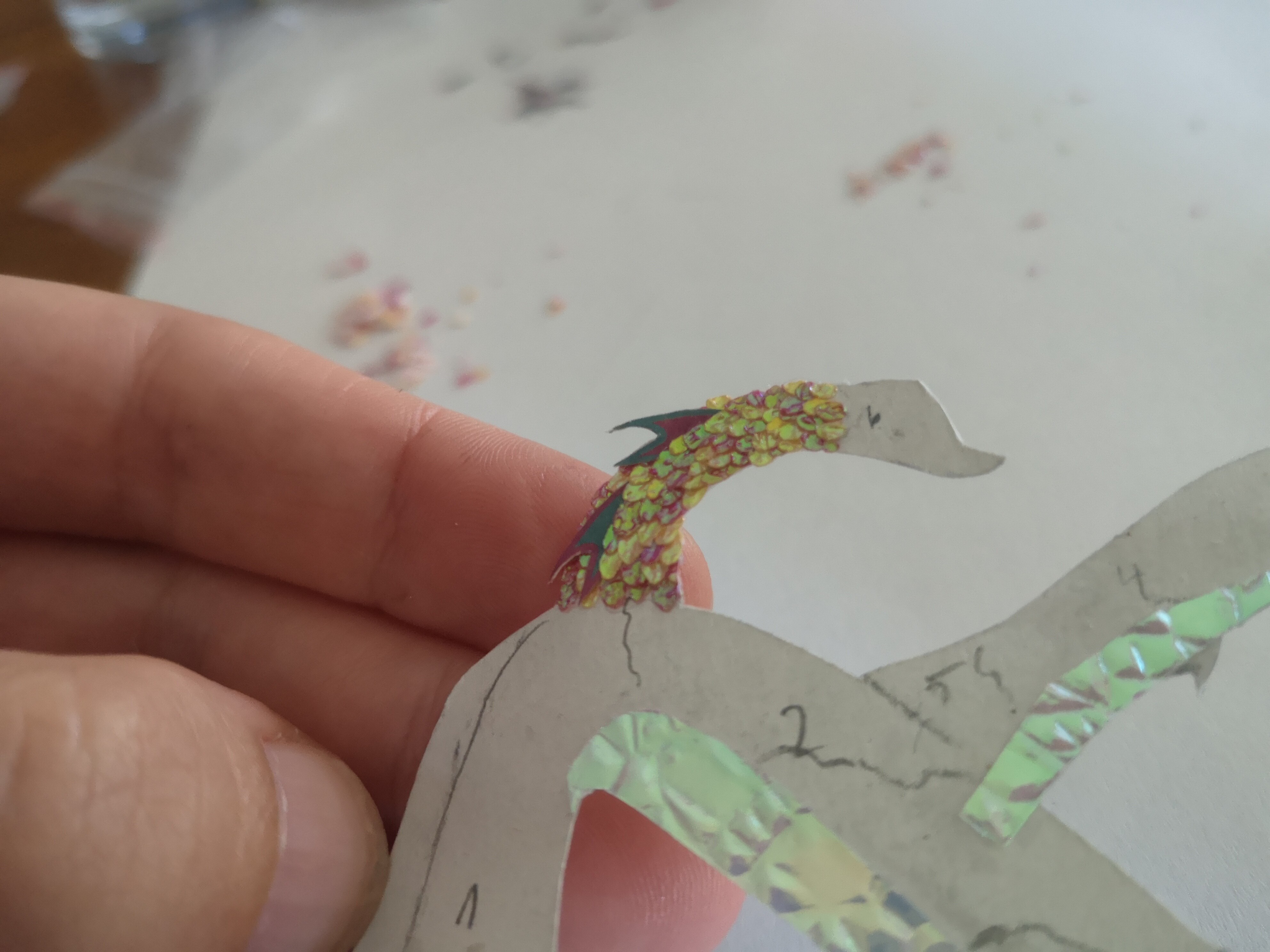 Bin grad am Schuppen aufkleben. Hab das erste Teilsegment vom Hals fast fertig, aber es dauert voll xD Aber ich bin sehr zufrieden mit der Wirkung