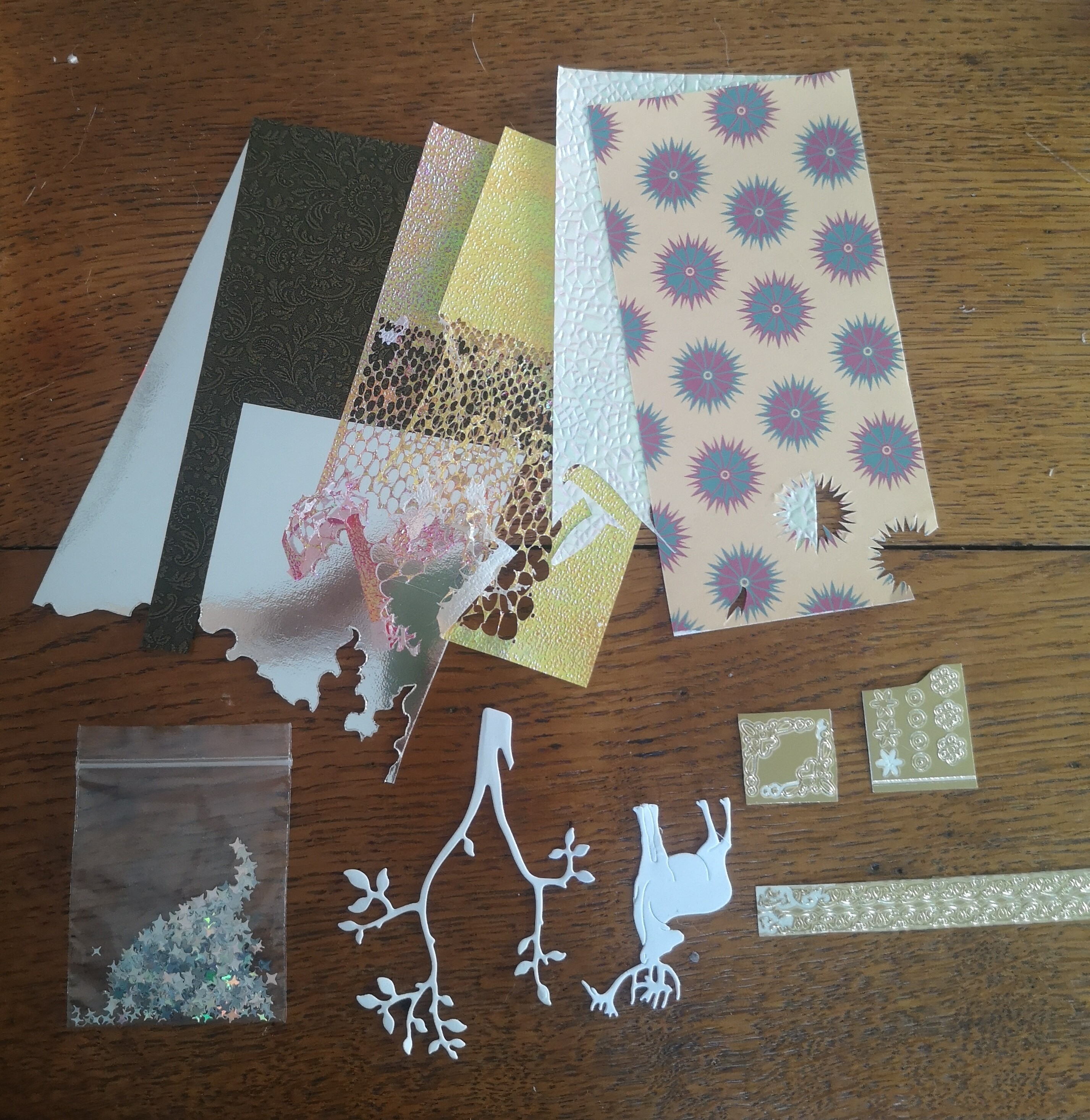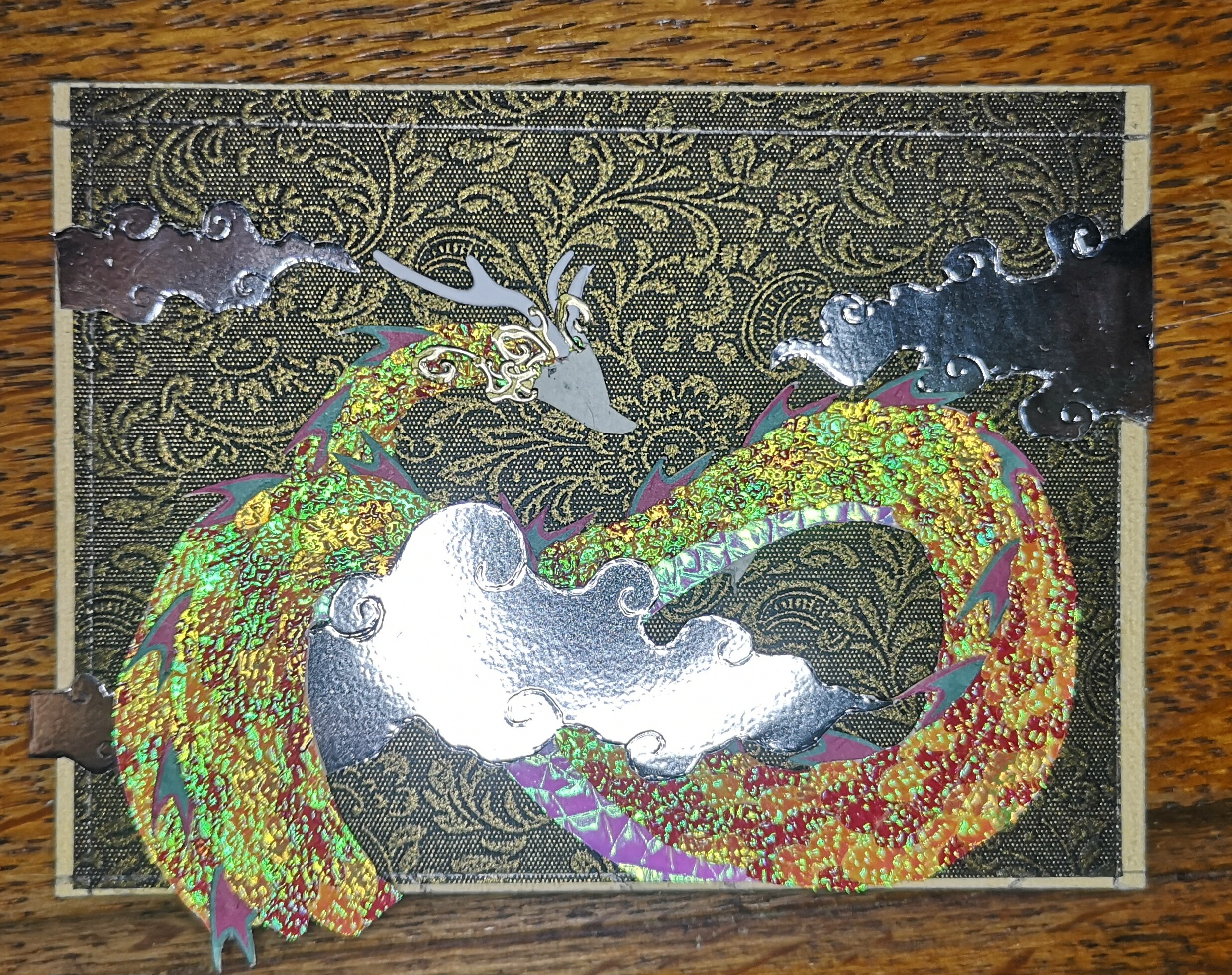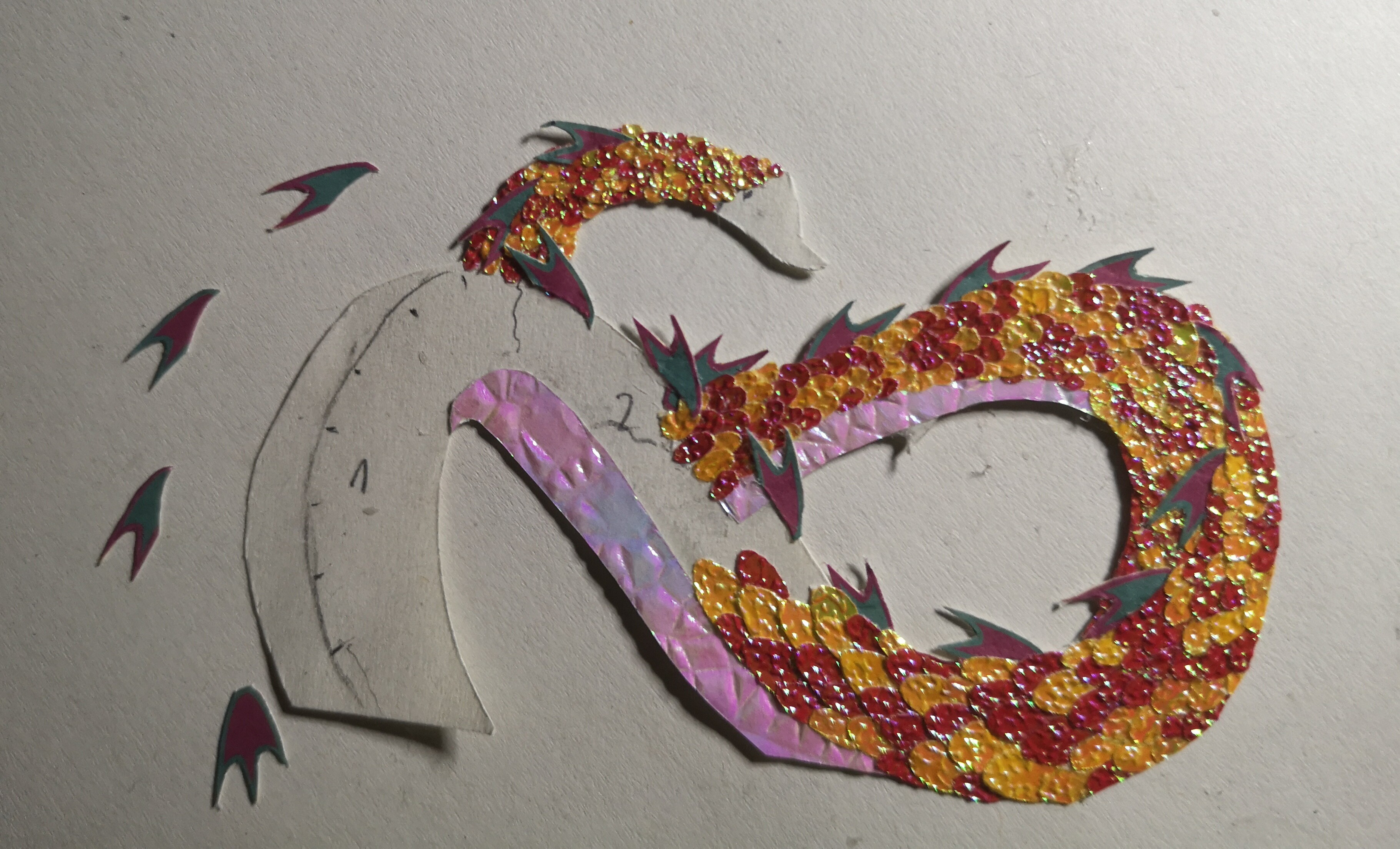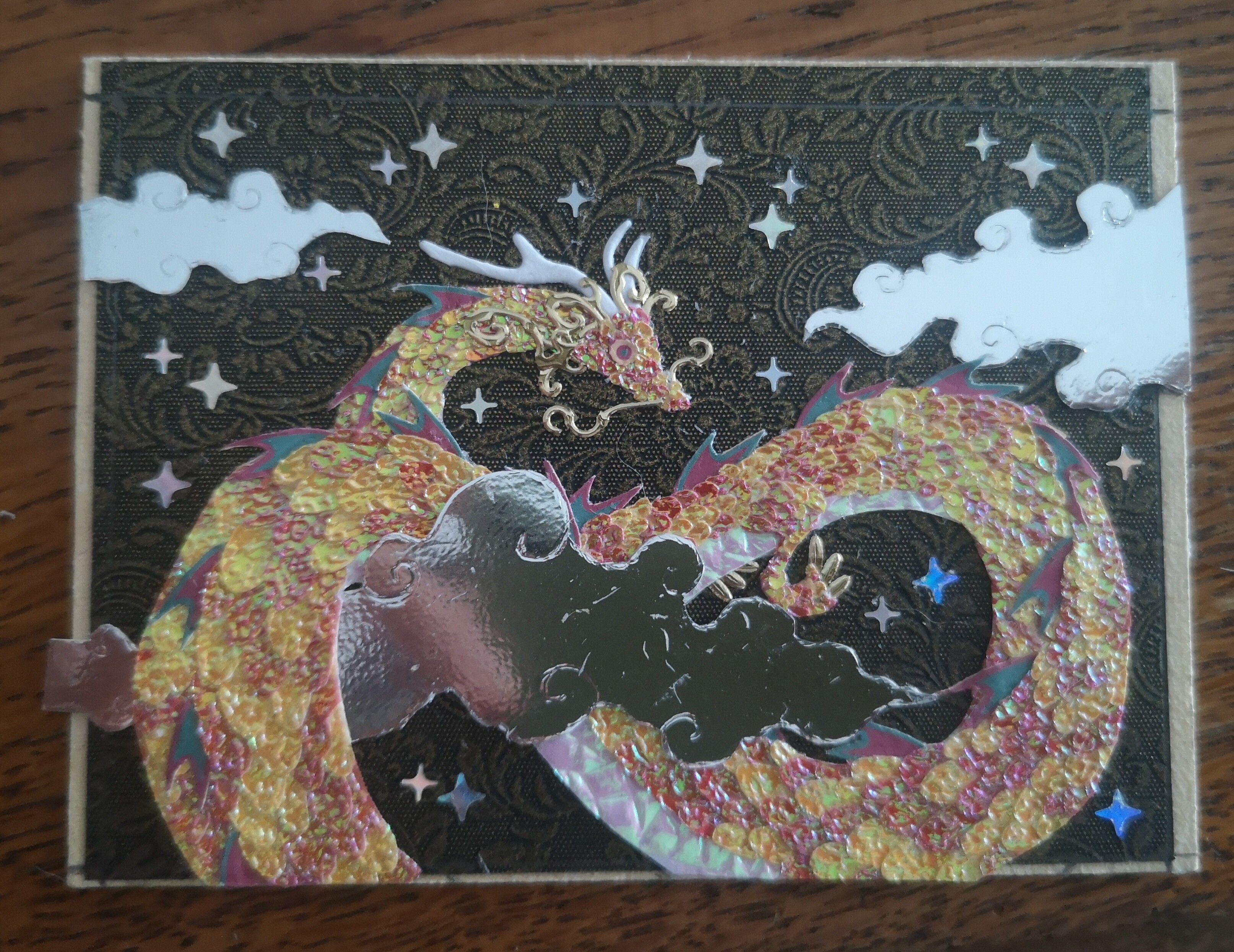 Ich hab jetzt beim Drachen alles aufgeklebt. Die Karte schimmert, funkelt und glitzert jetzt fast komplett xD