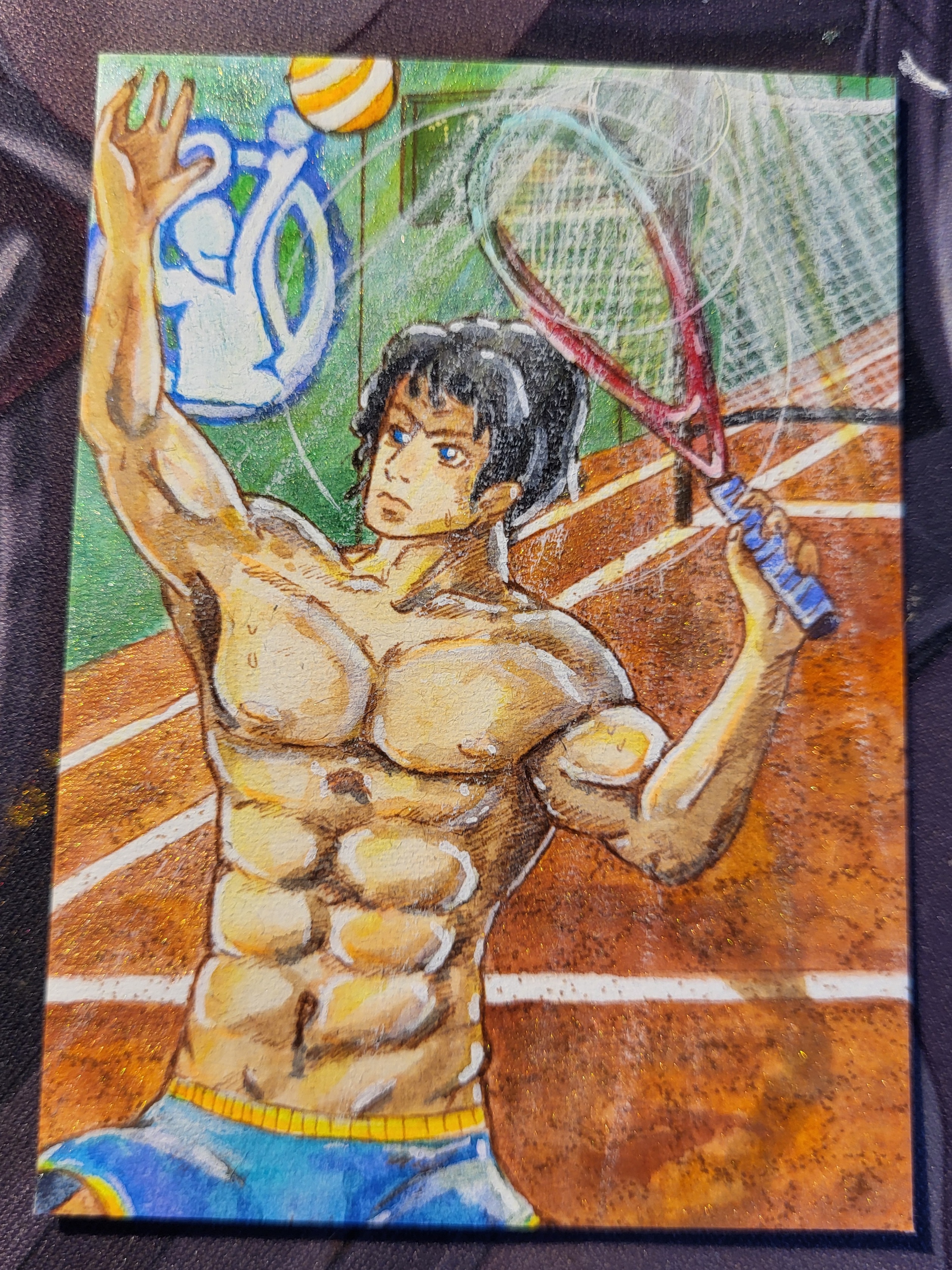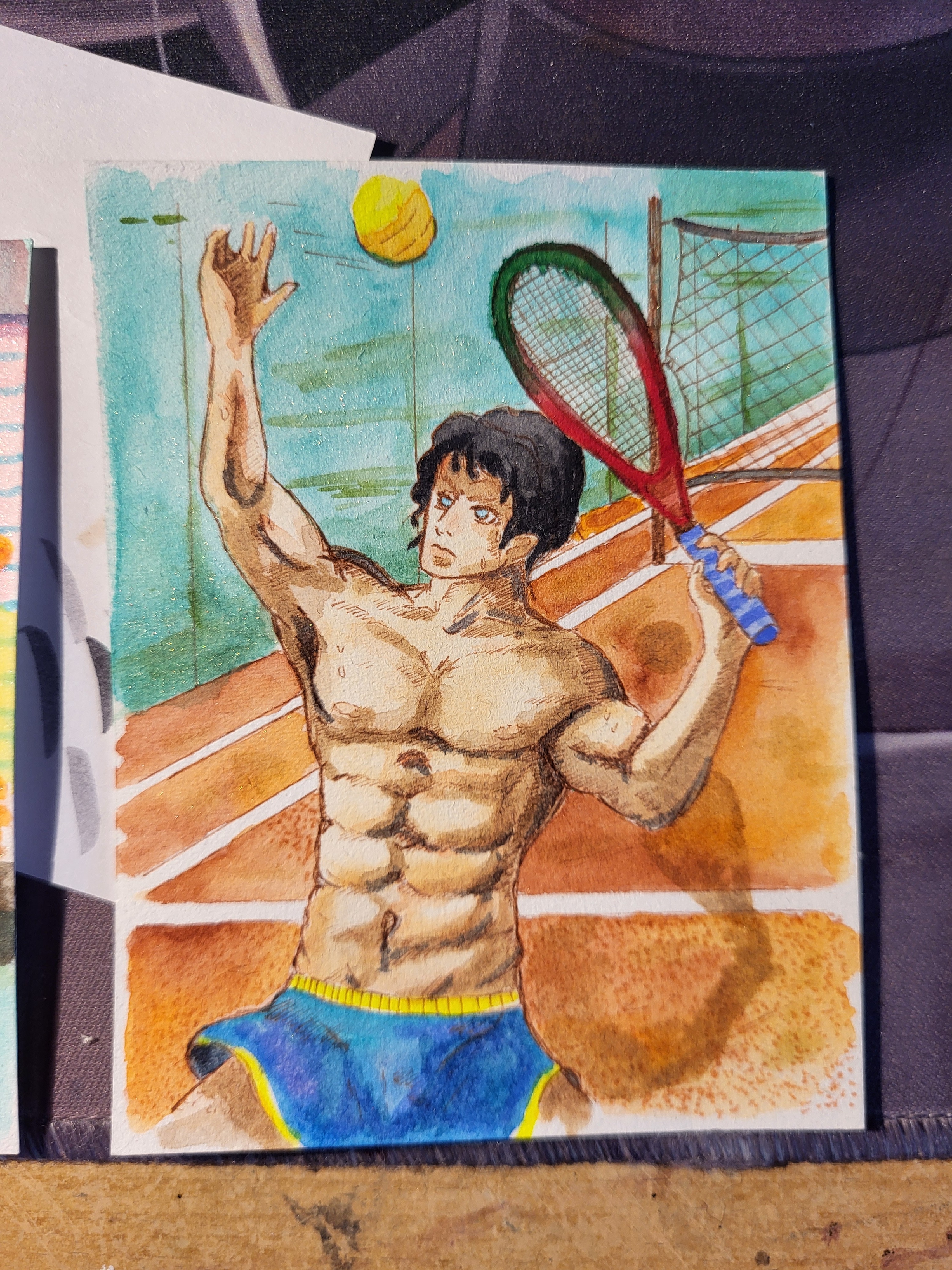 Da mir Skizze 2 zu statisch ist habe ich noch eine dynamische Pose versucht. Hier mit einem Mann der zum Aufschlag bei Tennis ausholt. Es ist so warm in der Halle… Da ist oben ohne mal ne Ausnahme