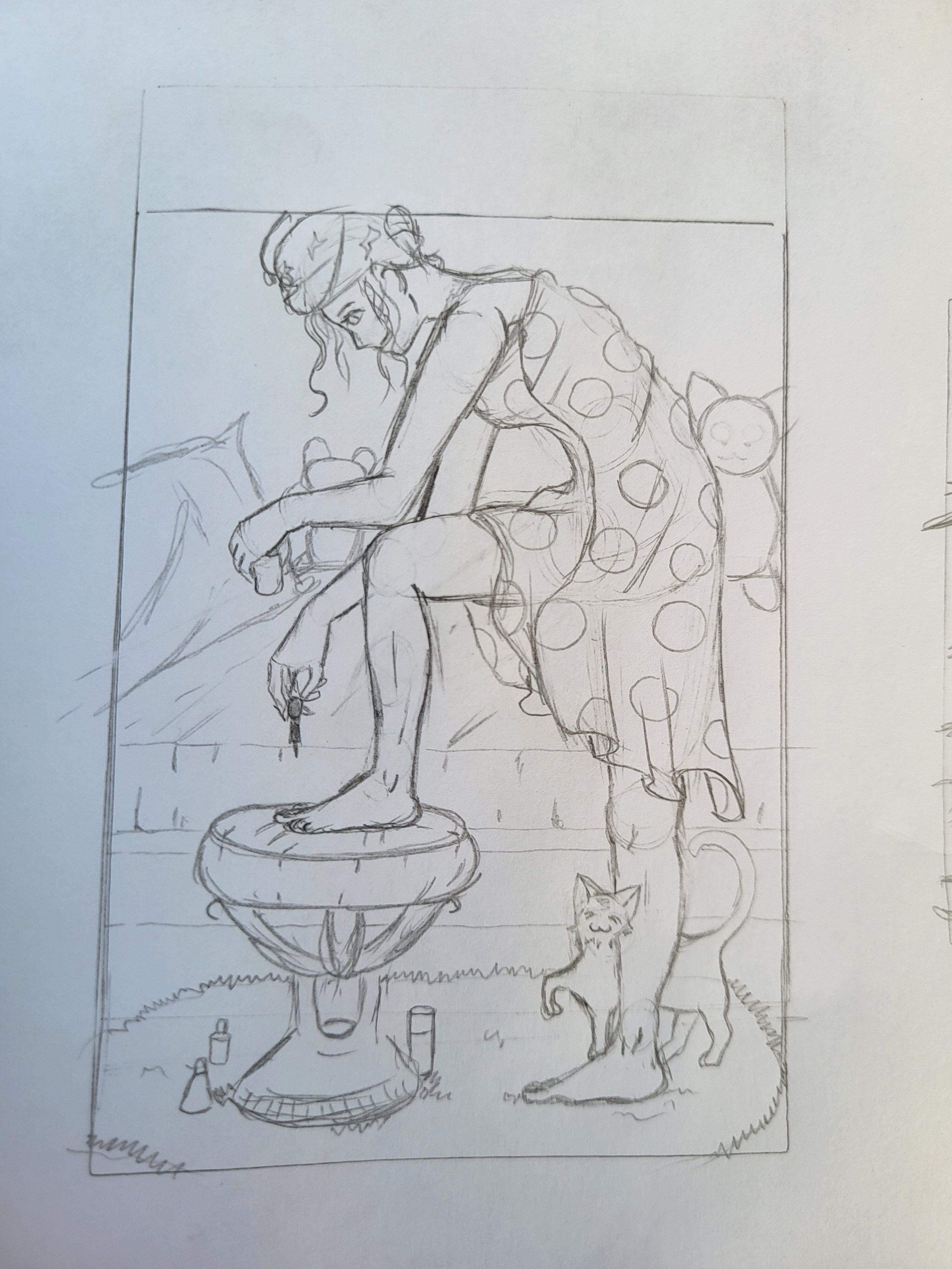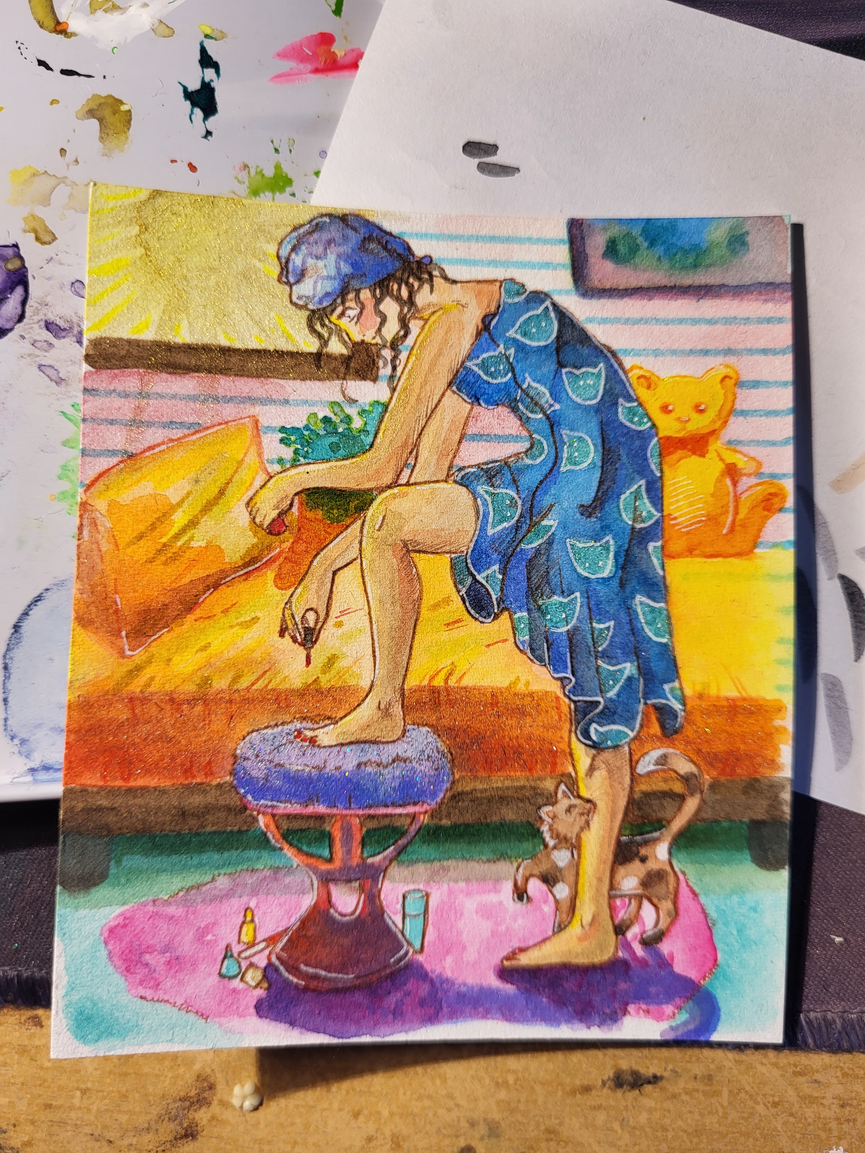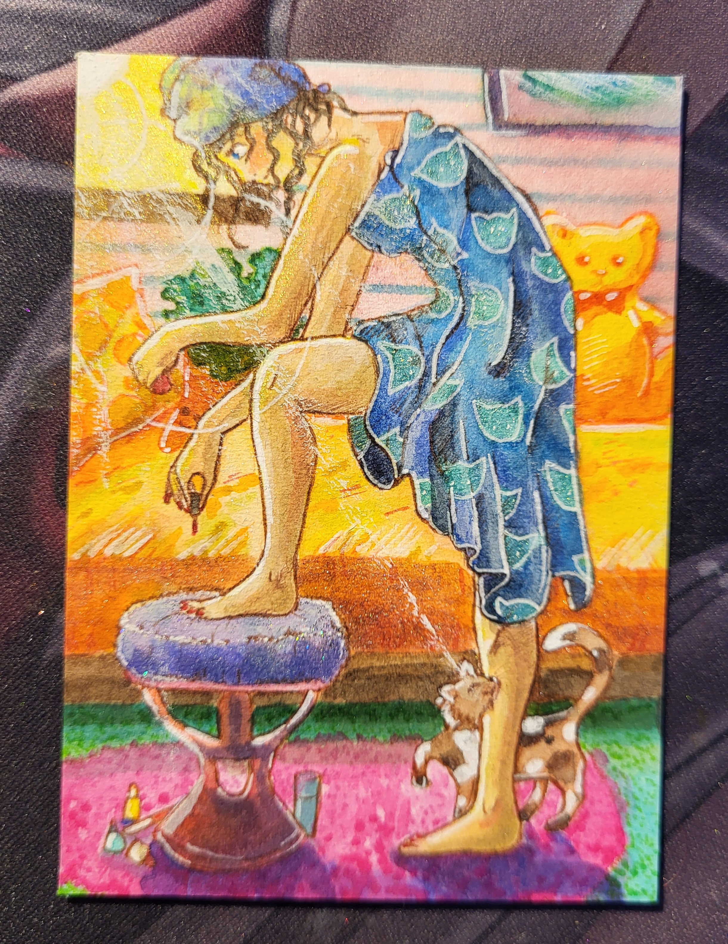 Nun hier ist meine erste Karte mit einem Mädel die im Schlafzimmer ihre Fußnägel lackiert. Mit tatkräftiger Flauschunterstützung vom Stubenkater.