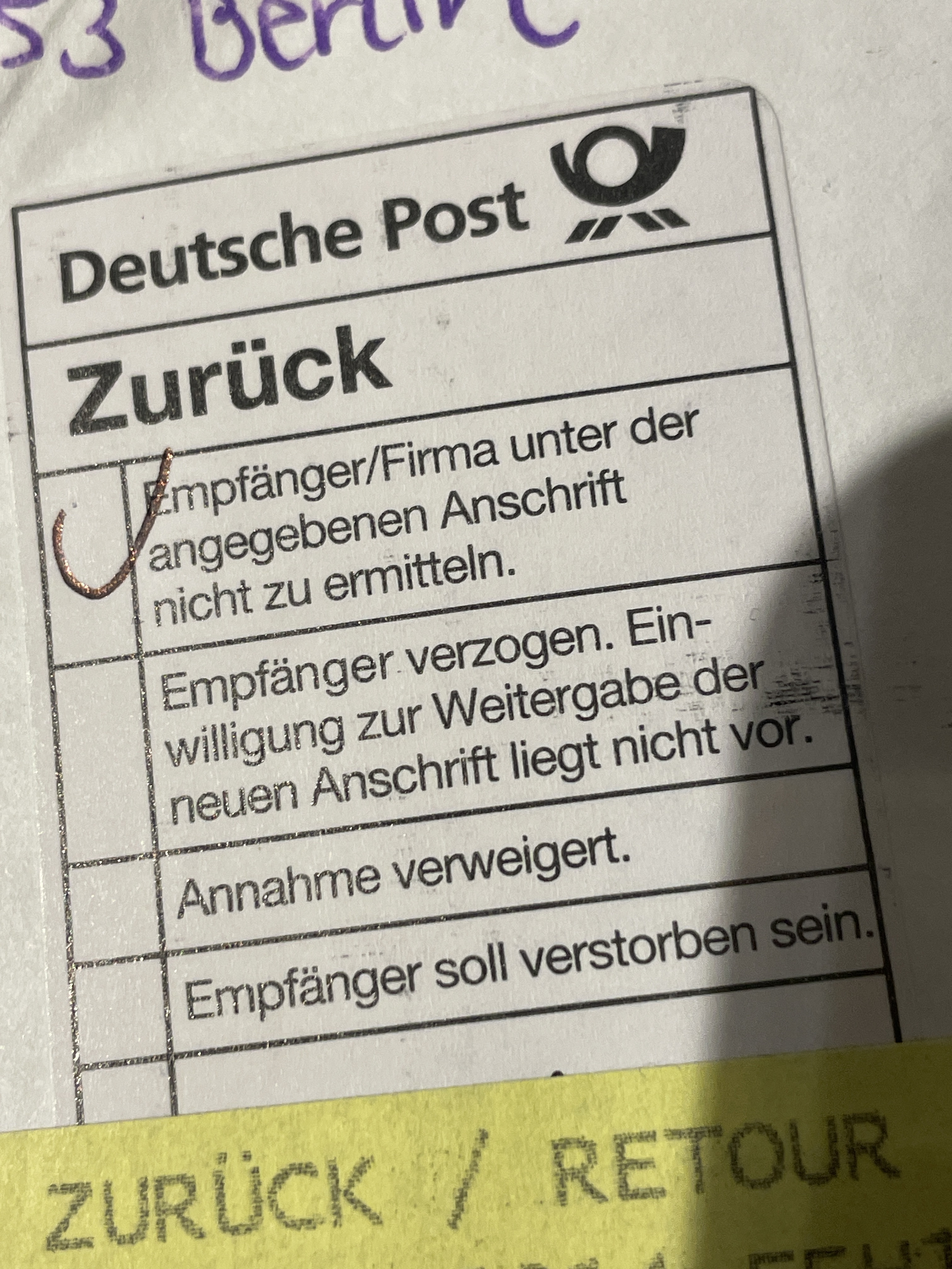 Mich überrascht der Grund warum der Brief nicht zugestellt werden konnte. War due Adresse nicht leserlich für die Maschinen? Zahlendreher?