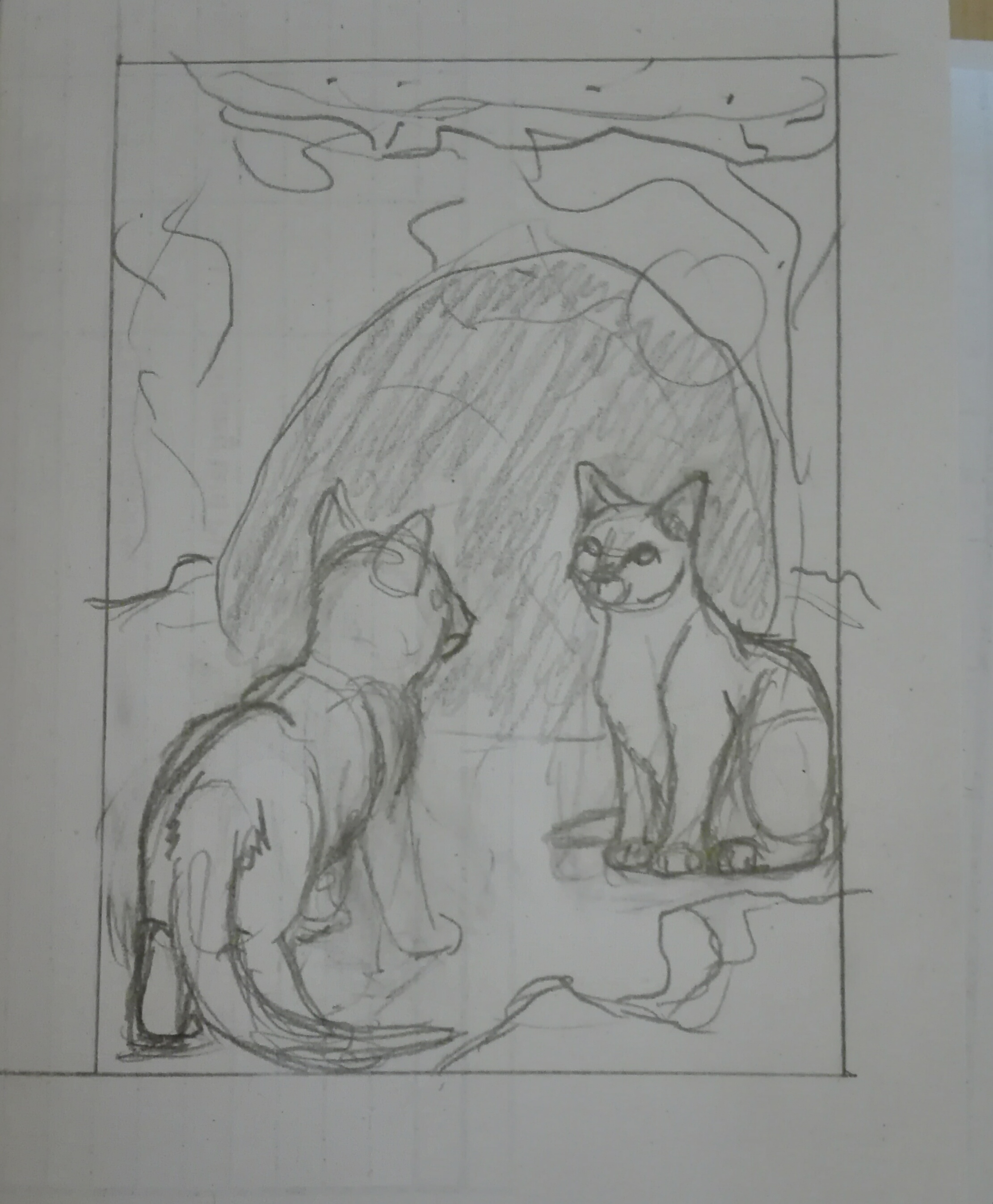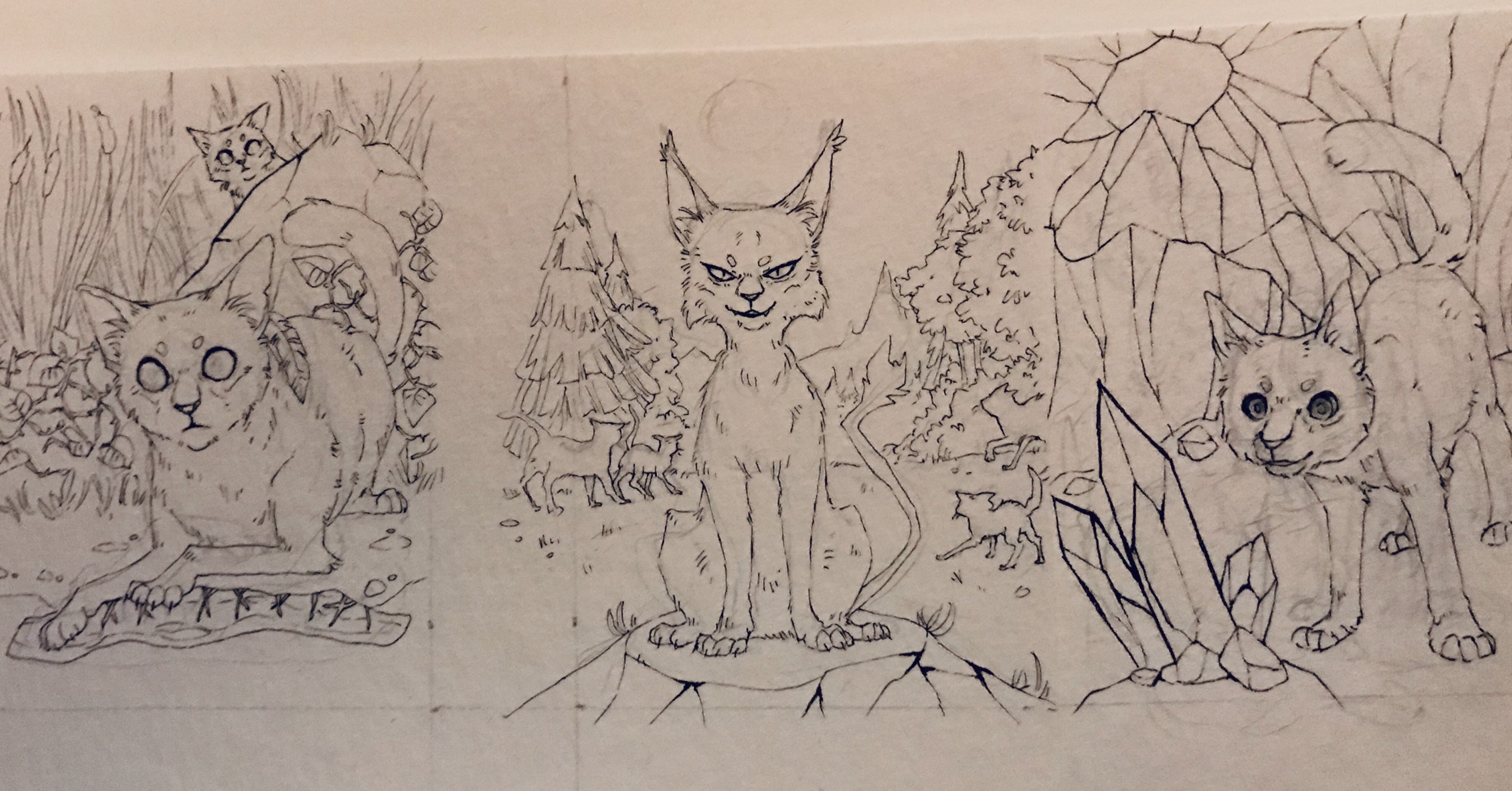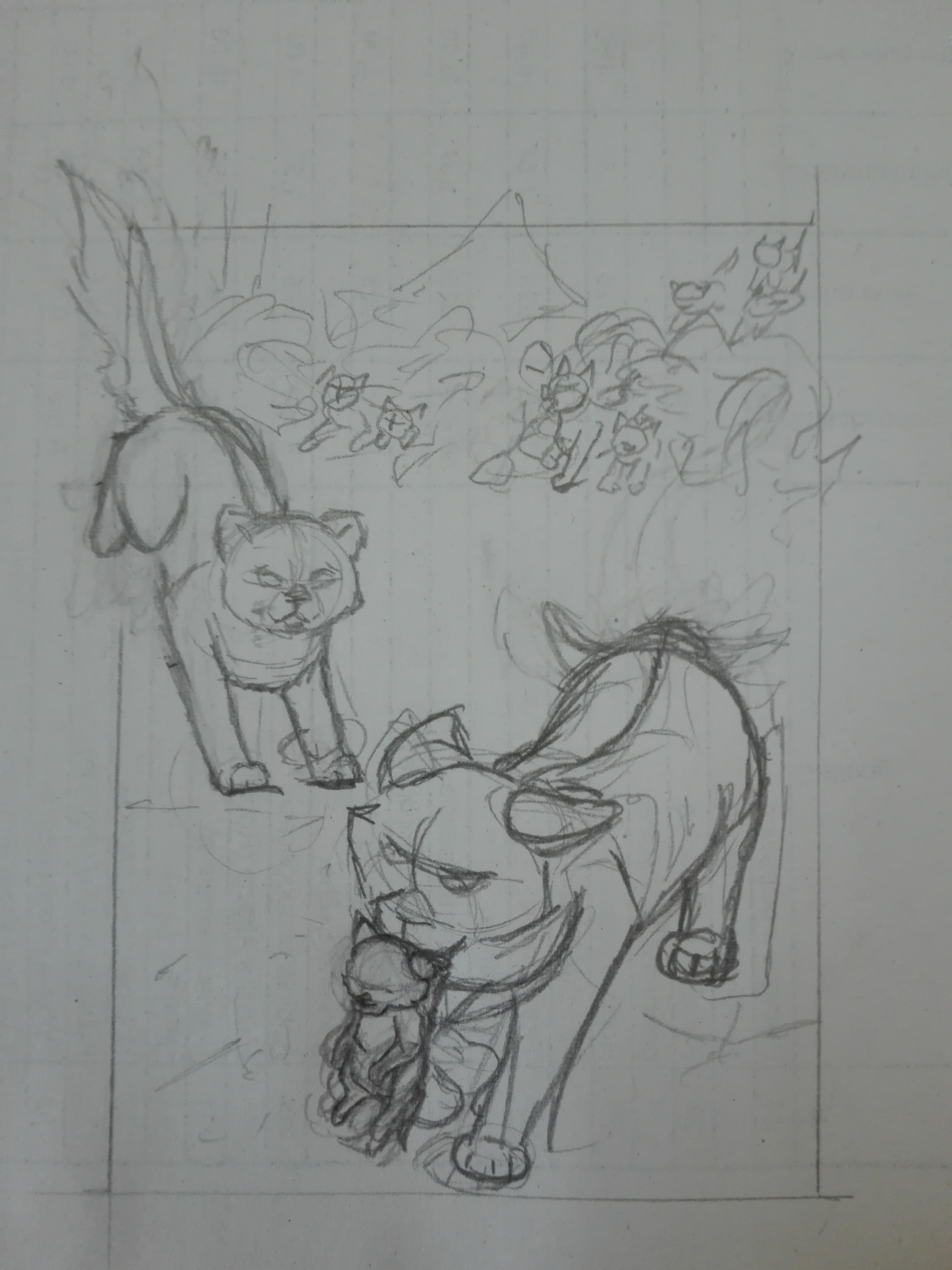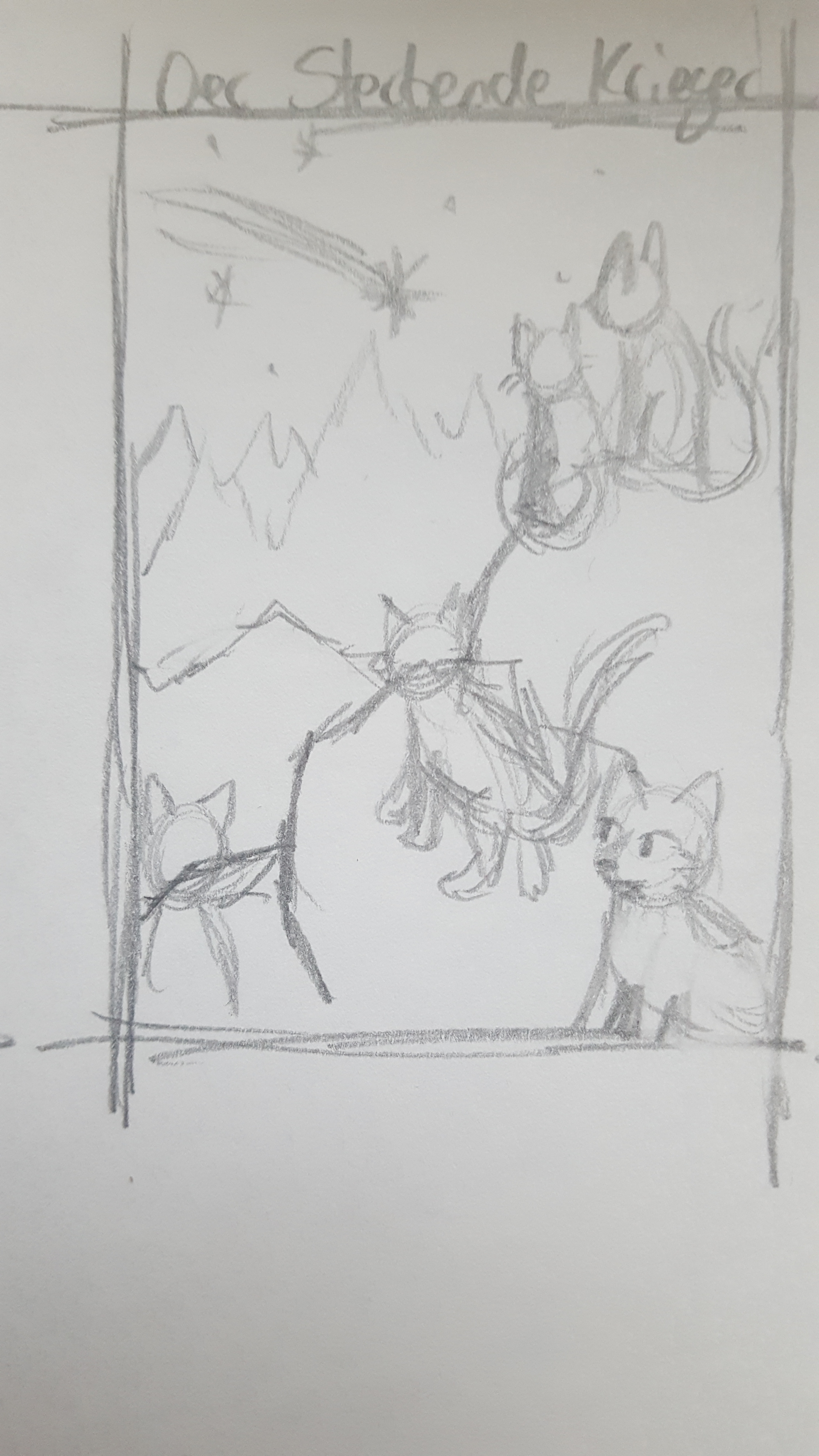 Im Hintergrund wollte ich die umgrenzende Brombeerhecke mit einem Bau, aus dem zwei neugierige Katzen gucken und den Eingang zeichnen. Von dort folgt der Rest der Angriffspatrouille mit Braunstern an der Spitze, der den Sieg des SchattenClans bekündet, ohne von Dachspfotes Tragödie zu wissen.