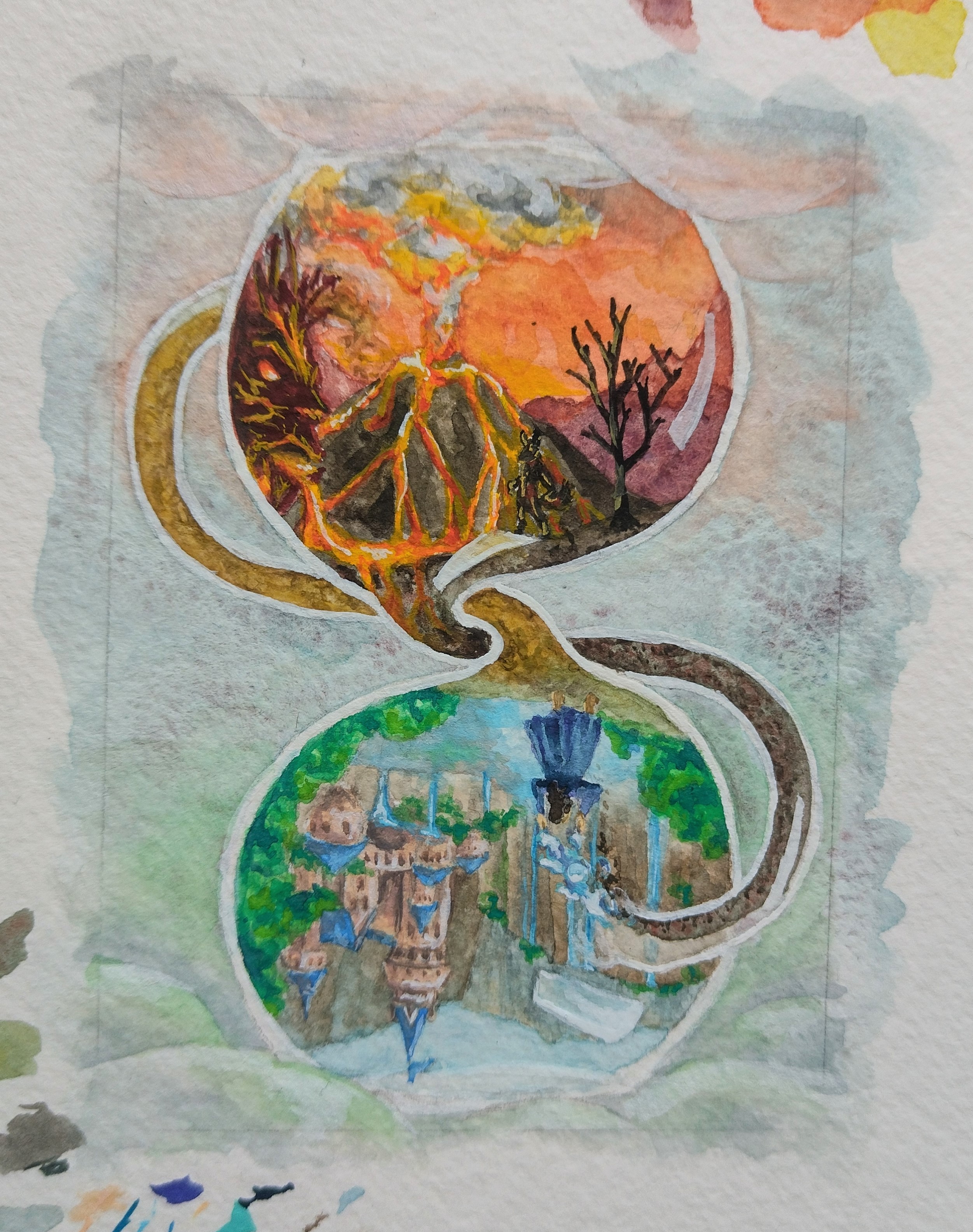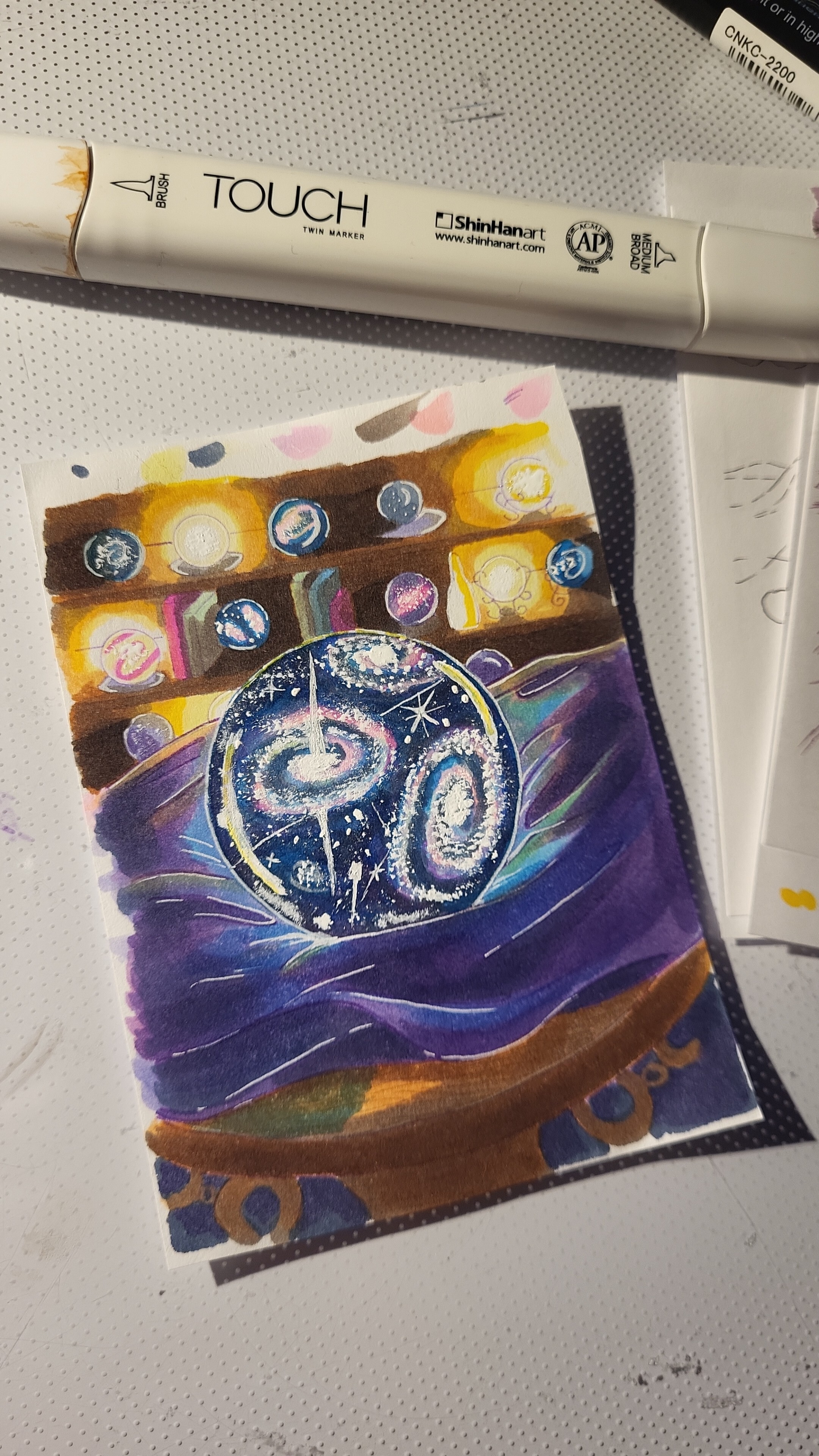 Hier ist mein aktueller Zwischenstand der zweiten Karte. Ich versuche diesmal Aquarell und Poster Color zu mixen. Bisher habe ich Teile des Hintergrunds mit Aquarell gemacht und würde den Rest mit Poster Color drauf setzen: