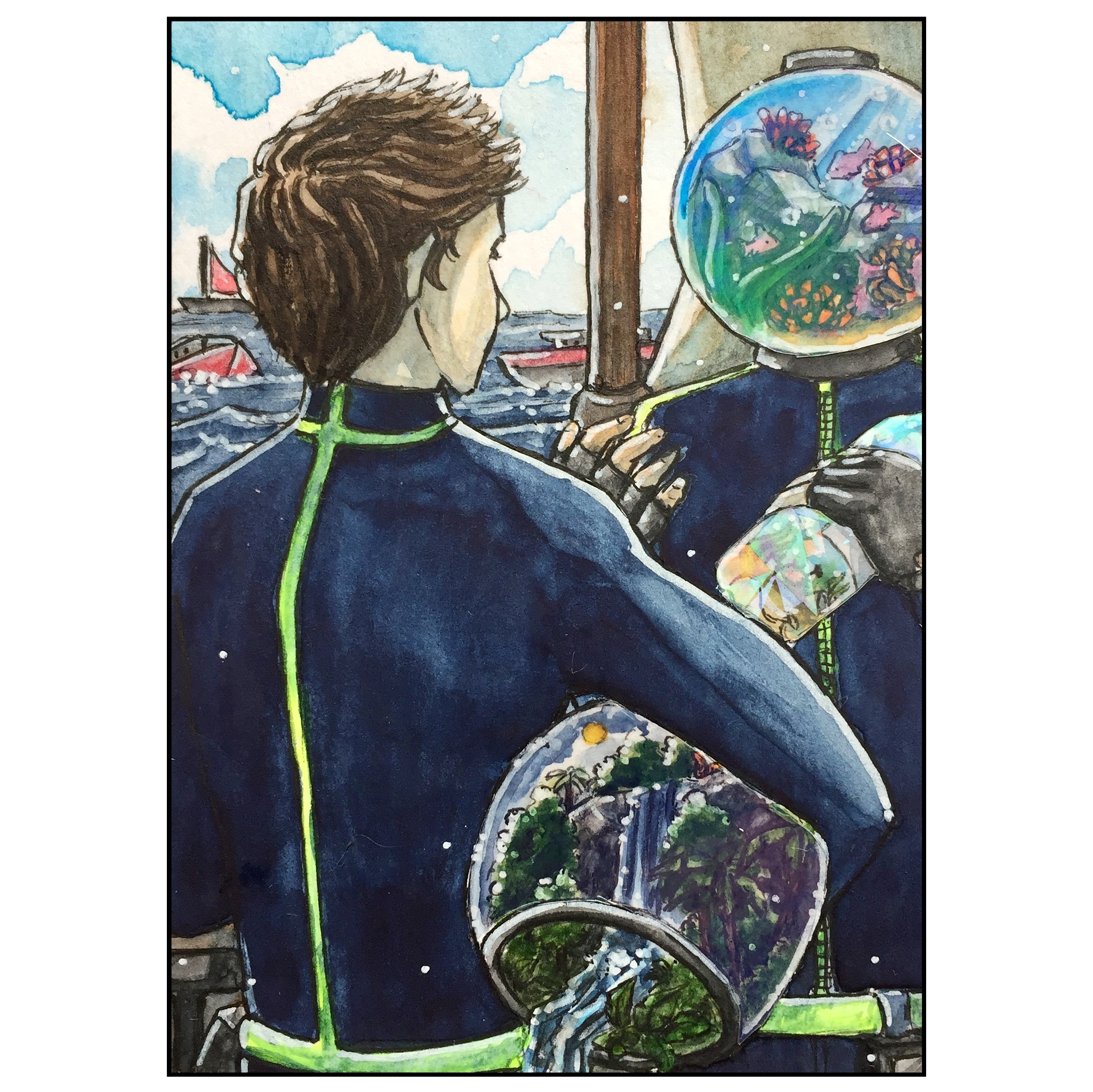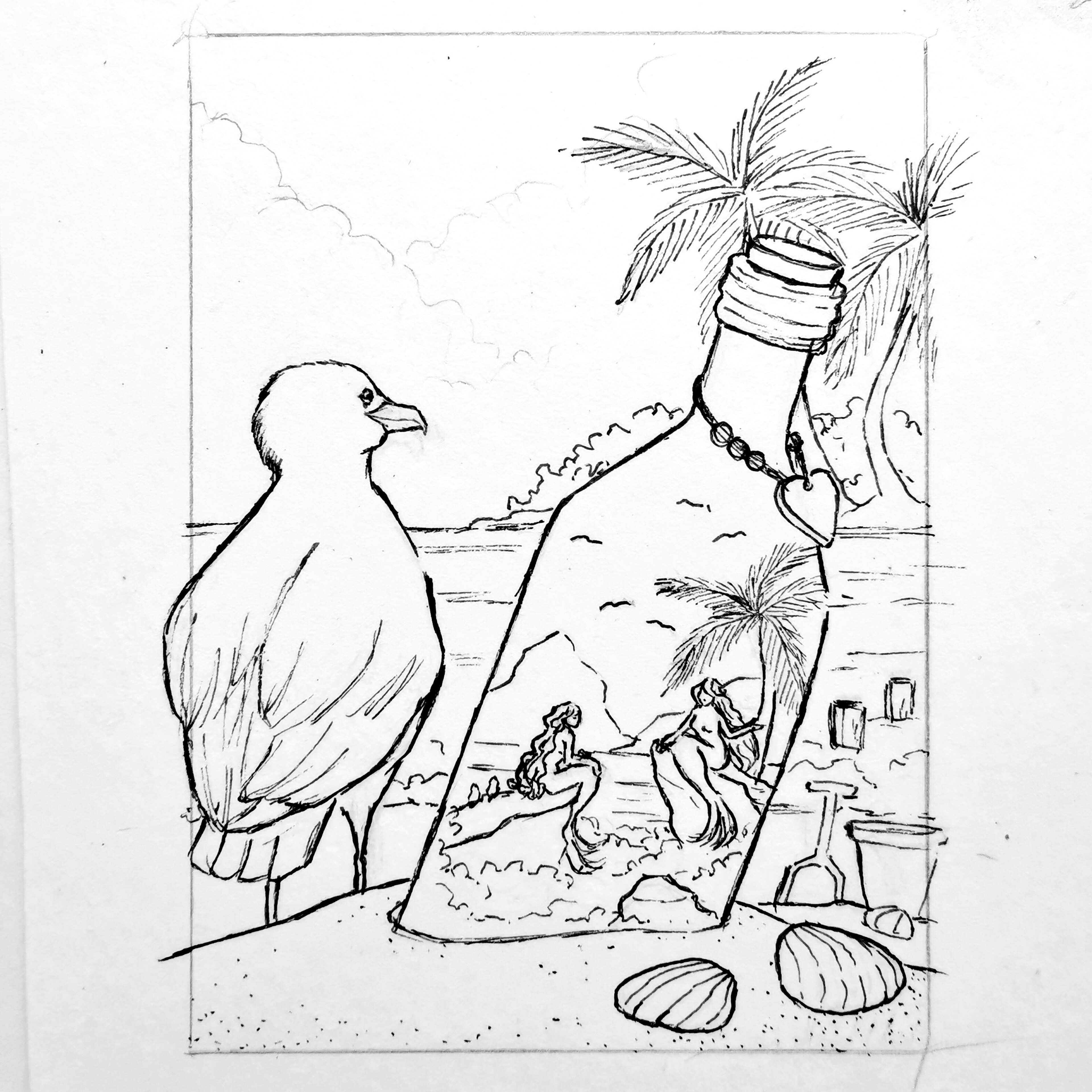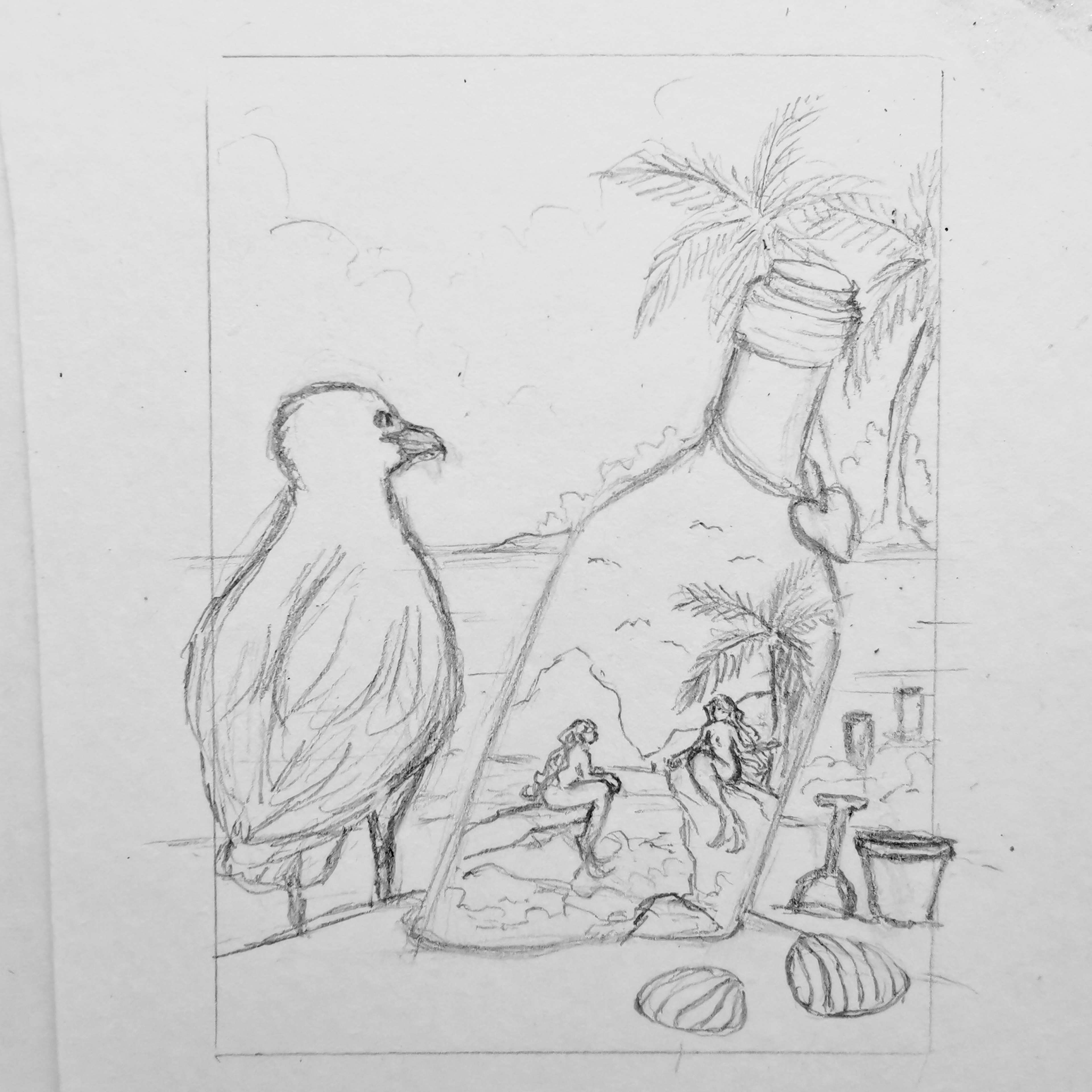 Für die dritte Karte habe ich mittlerweile auch eine grobe Idee: Ich stelle mir eine Flasche vor, die in die Tiefsee fällt und von einem Anglerfisch bestaunt wird. In der Flasche rein könnte ein Schiffswrack kommen.