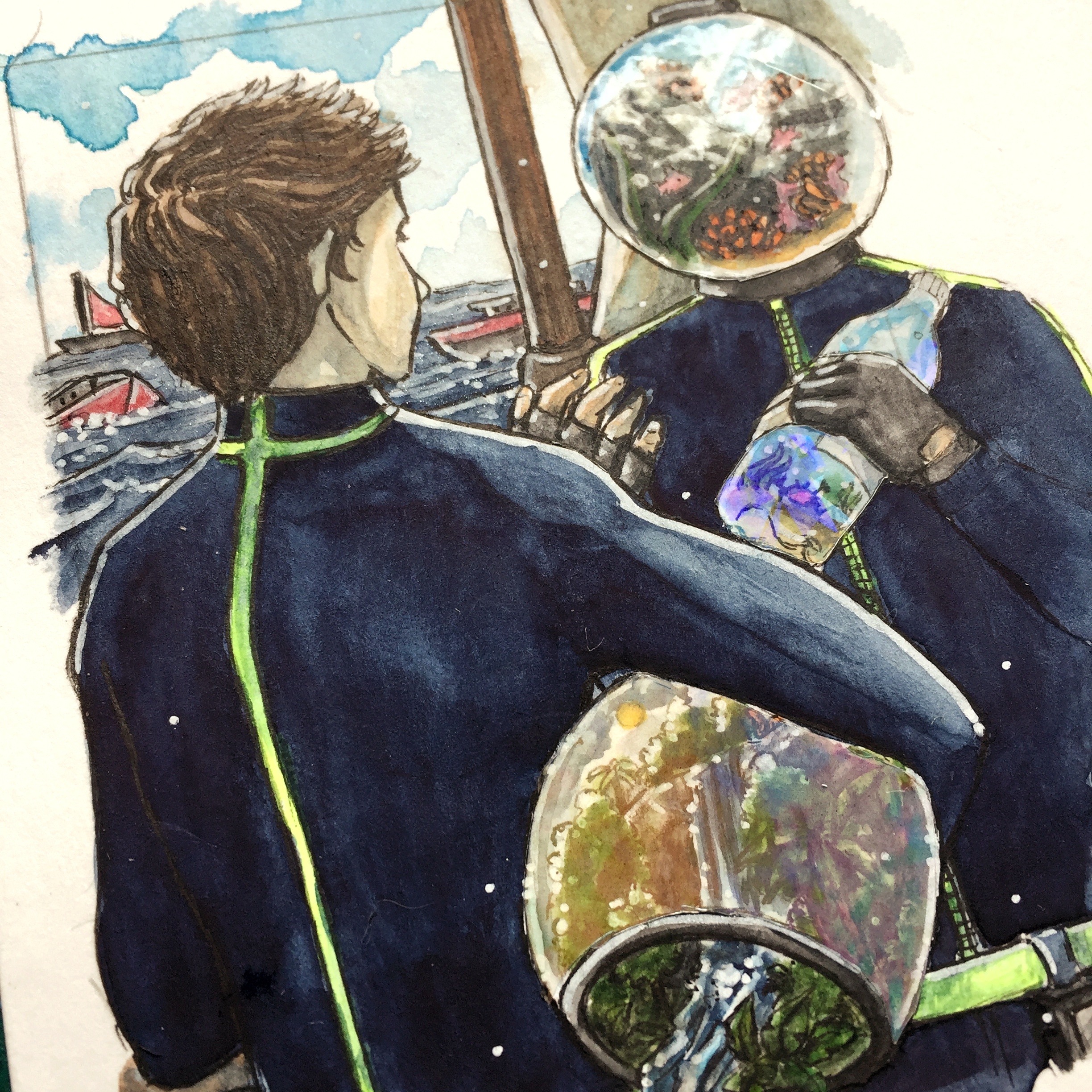 Zwei sich unterhaltende Taucher… Die untere Landschaft ist übrigens eine Anspielung auf meine kakaokarte 495 nachts am Wasserfall
